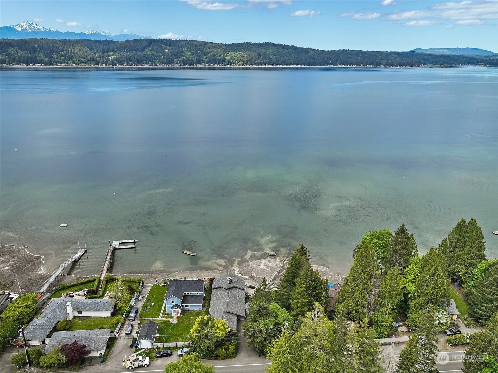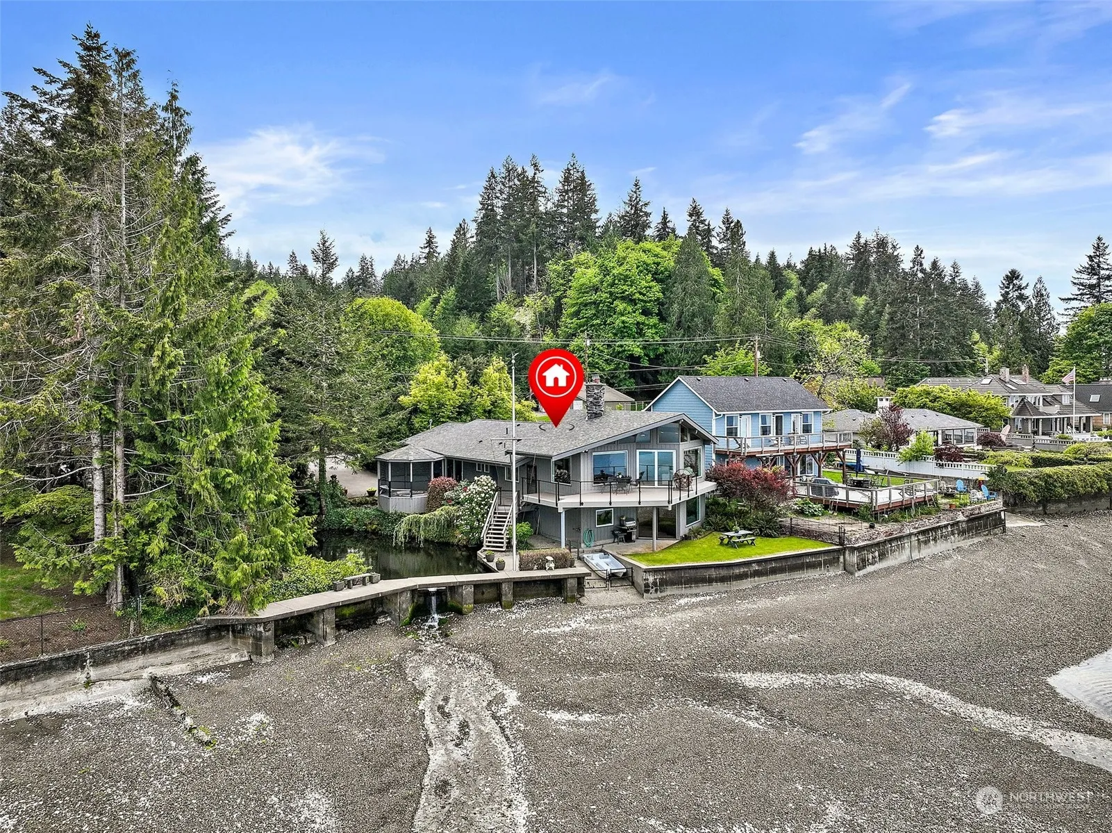 Stunning architecturally designed home on Hood Canal! No expense was spared in the recent remodel, which boasts an open beam living room with vaulted ceilings, oak hardwood floors, and a ‘wall of windows’ that captures the 180-degree view of Hood Canal, the Olympics, & beyond. The gourmet kitchen comprises stainless steel appliances, a double oven, breakfast bar, & quartz counters. A massive slate fireplace accommodates the gas wood stove in the downstairs family room and large wood fireplace upstairs. Enjoy your morning hot tub under the gazebo just steps from the primary bedroom. Experience a sense of tranquility as you drive on the bridge built over your private pond. This unique property also has a boat ramp, tidelands, and great beach!