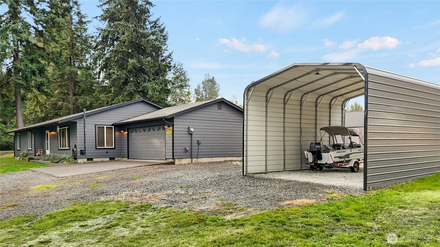 Set on a generous 1.23-acre flat lot at the end of a peaceful dead-end street, this charming open concept 3bed/, 2bath rambler offers space, privacy, and comfort in a serene cul-de-sac setting. Step inside to an open-concept layout that blends modern living with cozy charm. Recent upgrades include brand-new Hardie board plank siding, a newer roof, and a new covered patio—perfect for relaxing or entertaining year-round. Outside, you’ll find an oversized boat/RV carport with a 30-amp plug, plus room to roam, garden, or expand. A startup orchard gives you a head start on creating your own backyard haven. Your dream of space and comfort starts here. Bring your animals! Welcome home!
