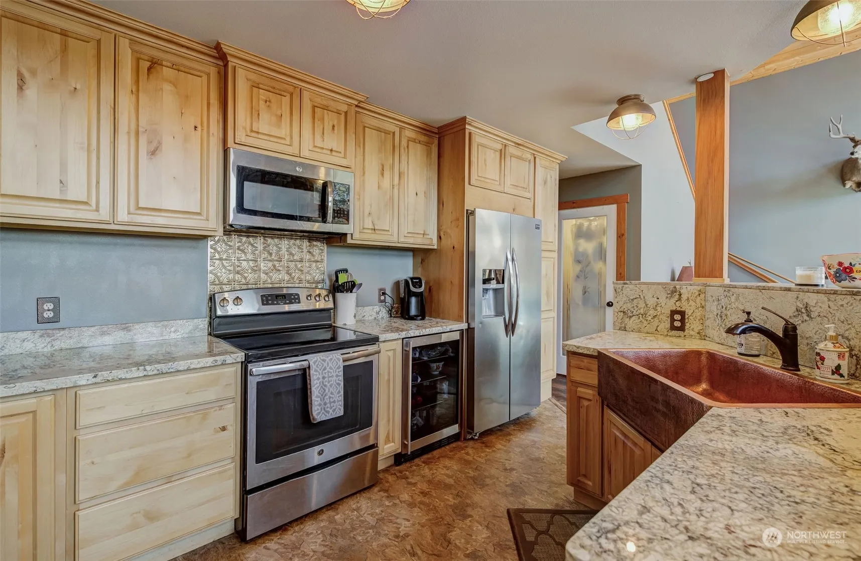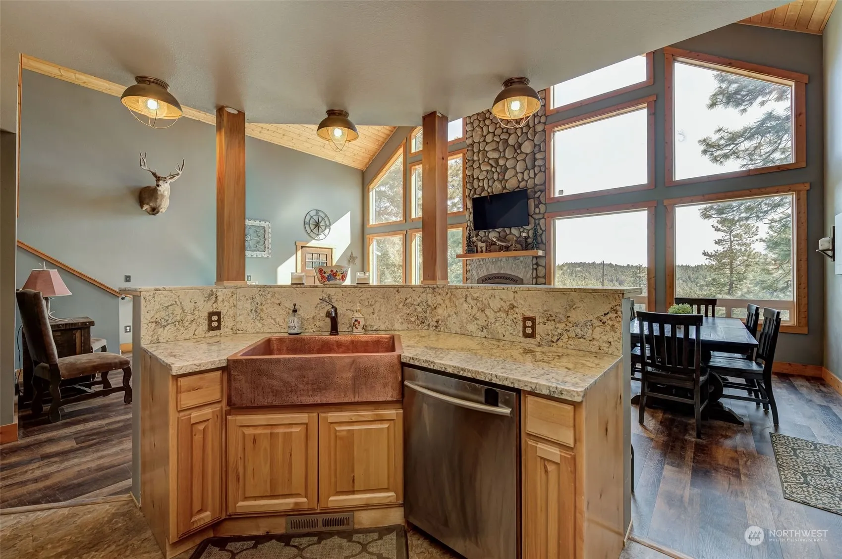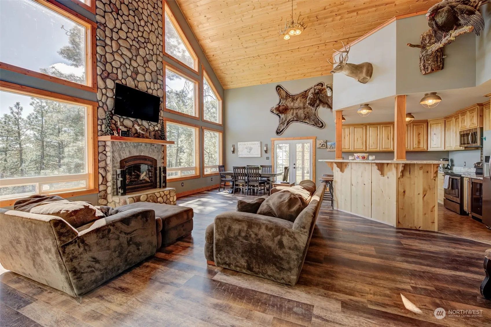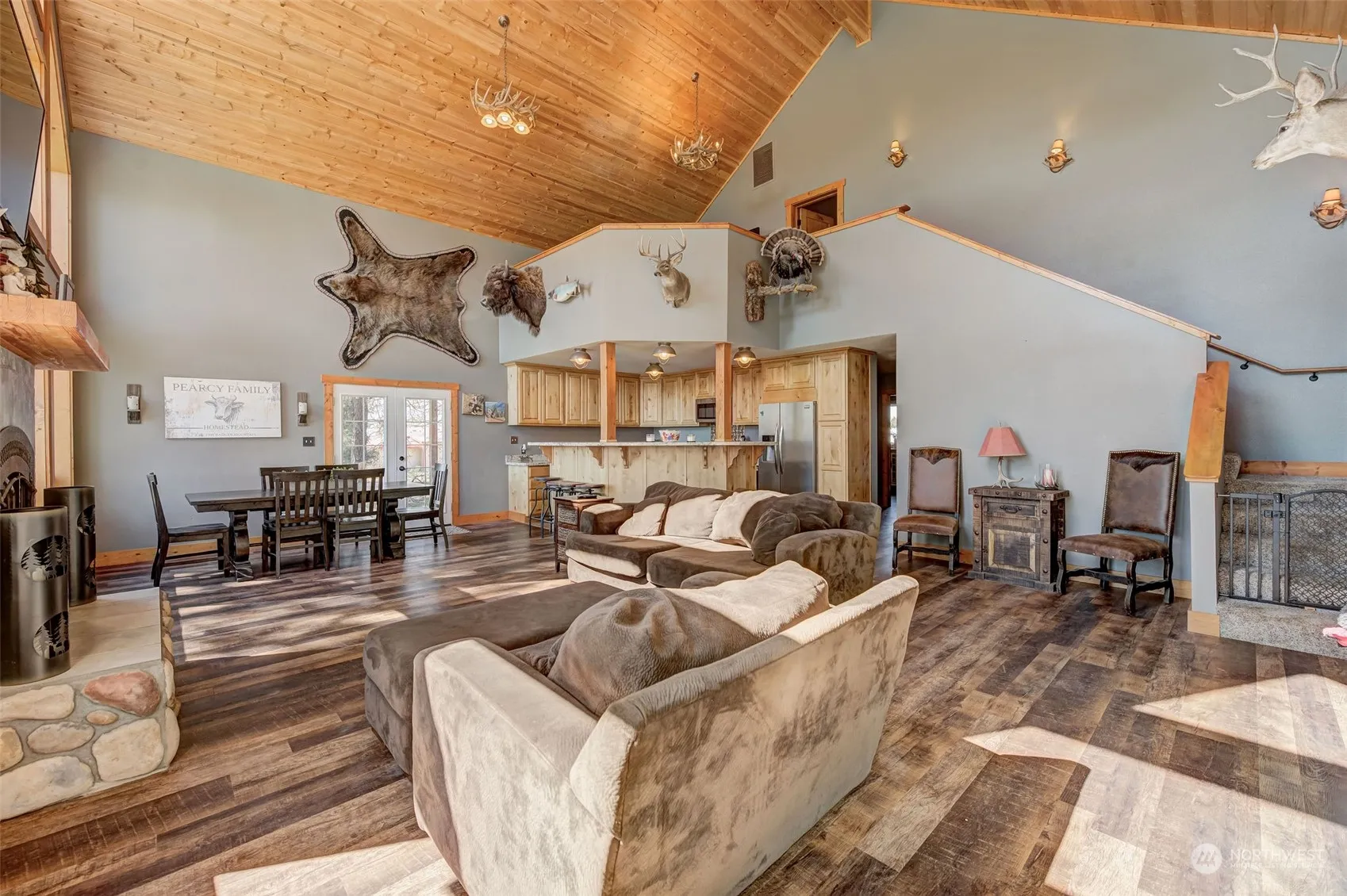 Serene country living in this custom home, featuring 3 bedrooms, 2.25 baths, and a spacious 4-car garage with a loft. Situated on over 5 acres, there’s ample room to build a shop, garden, and accommodate animals. The home boasts vaulted, wood-paneled ceilings that exude a modern cabin vibe. The open concept living area is anchored by a stunning rock fireplace, perfect for cozy gatherings. The kitchen is equipped with stainless steel appliances, granite countertops, and a copper sink. Newly installed flooring on the main level. Upstairs, a large landing area offers versatile space for an office, playroom, or extra family room. The primary bedroom is a true retreat, complete with a private balcony to enjoy breathtaking sunrises.