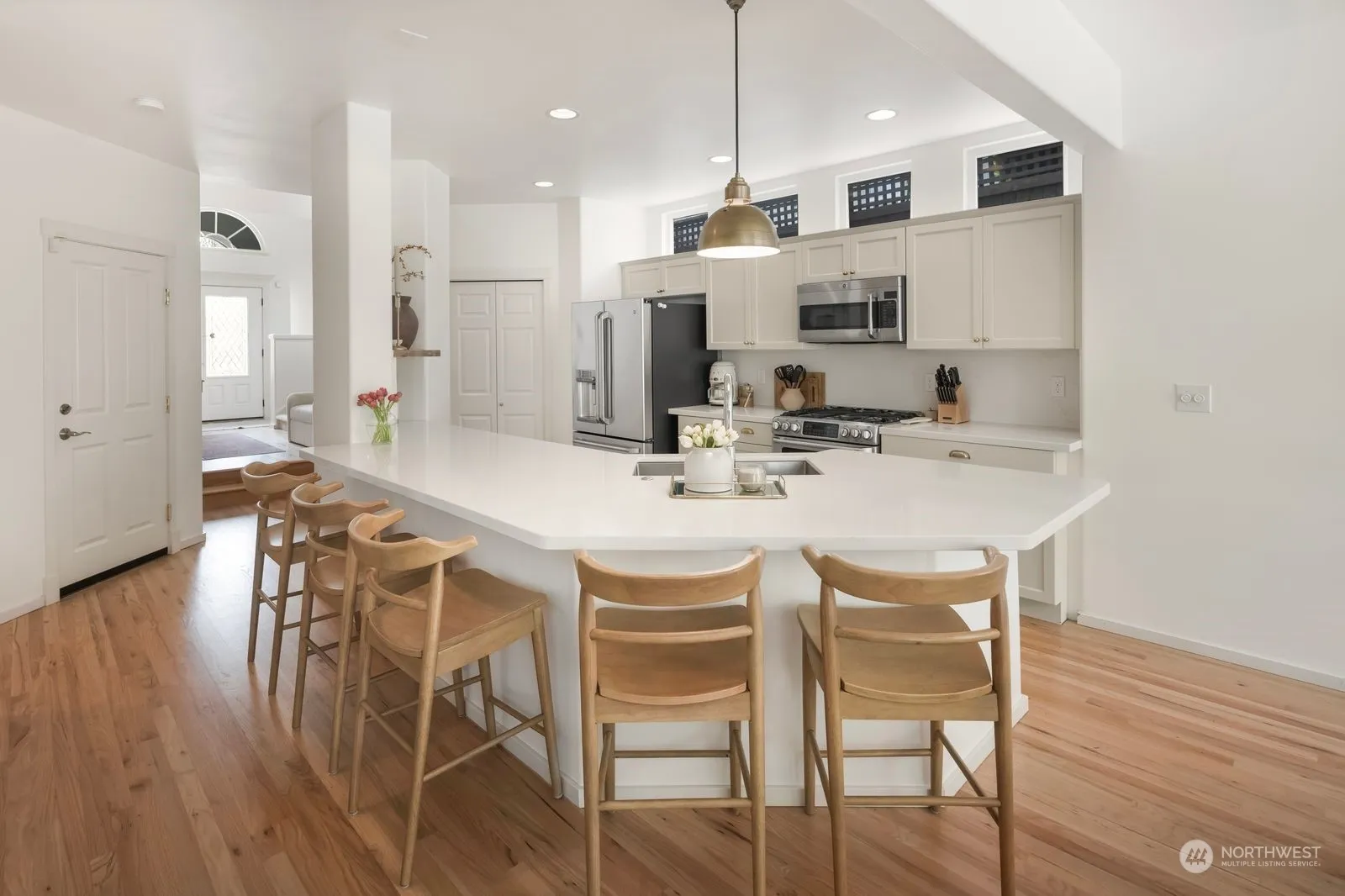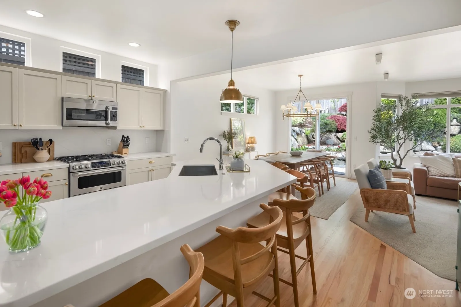 Gorgeous Burnstead built home flooded with natural light. Remarkable spaces include one of a kind kitchen & backyard that you will be thrilled to share with friends. No detail overlooked in this special kitchen w/high-end appliances (double oven), gold accents & quartz counters. XL eating bar allows for extra seating & the dining room can seat 8! The back of the home is a wall of glass showing off the picture perfect backyard, stamped concrete patio & beautiiful landscaping. Magazine worthy in every way. Beautiful blond hardwoods on main give the home a warm & welcoming feel.3 bedrooms/3 bathrooms…every bdrm has a bthrm. Light, spacious & on trend in every way.Walk to YMCA,parks,shops,restaurants,golf,pool & school!AC newer roof.