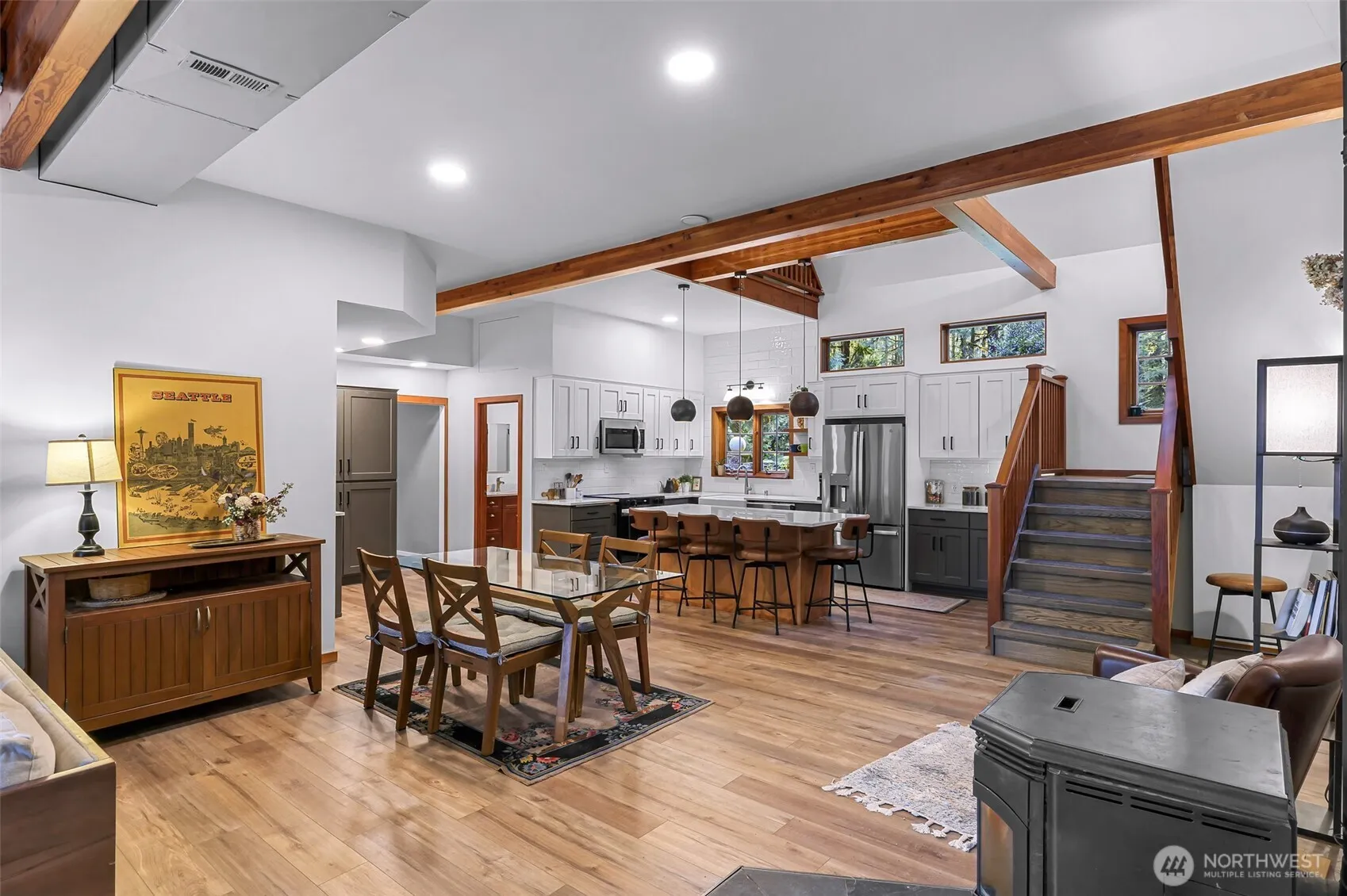 Welcome to this enchanting 4.8-acre estate, featuring stunning English gardens & custom-built 2710sqft NW home. First time on the market, this residence exudes warmth & character. The inviting main level showcases updated gorgeous chef’s kitchen, spacious great room w/soaring beamed ceilings & fireplace, bedroom, full bath, laundry. Upstairs, 3 generous bedrooms, beautifully remodeled bath w/heated floors & loft. Gorgeous flooring flows throughout, enhancing the home’s natural charm. Outdoor living w/covered patios, chicken coop, garden spaces. Large garage/shop with additional carport & RV hookups. With a durable metal roof, space for a potential ADU, & serene garden paths, this property offers rare privacy, beauty & endless possibilities.