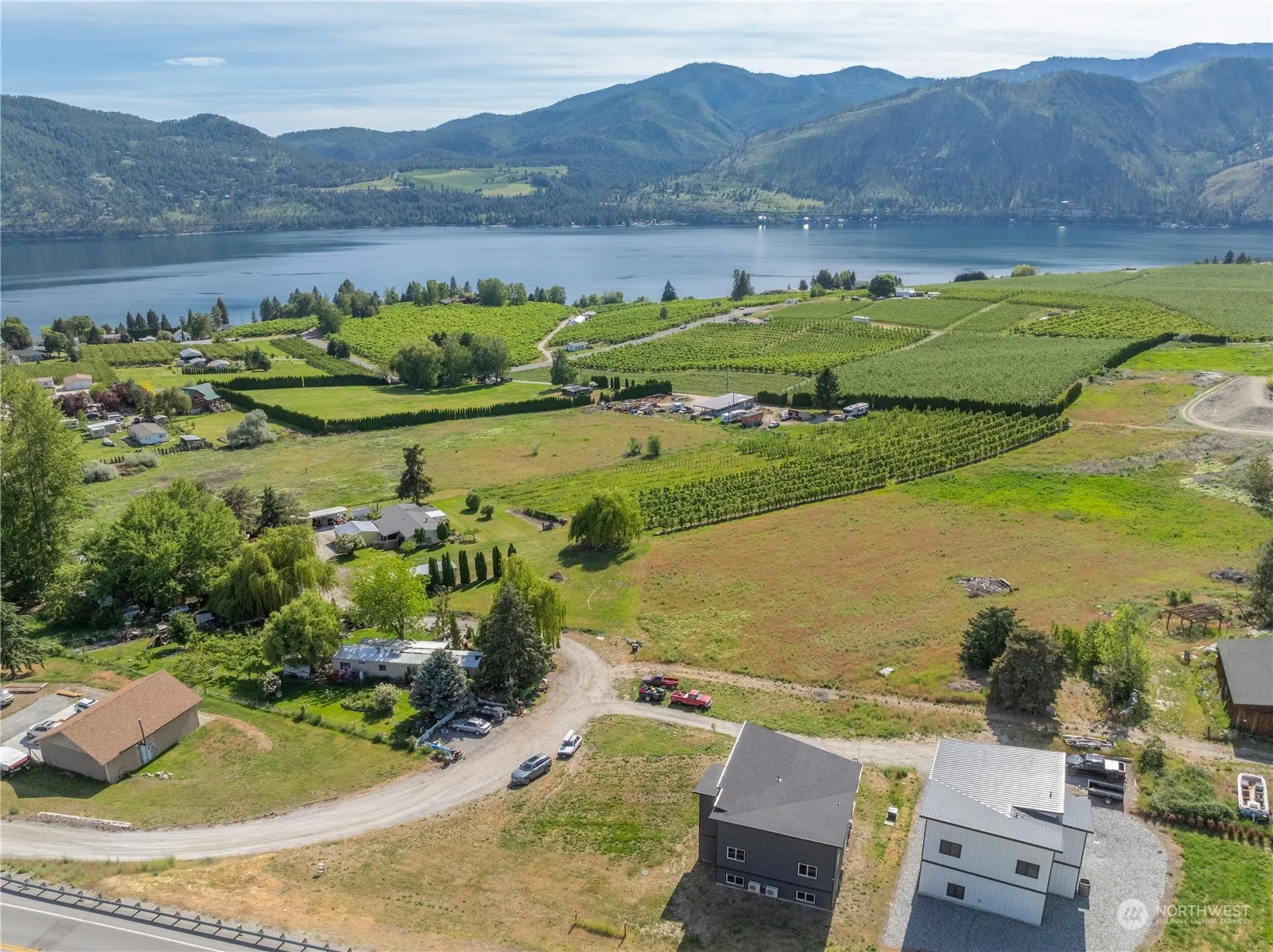 Incredible 2022-built 4bd/2.5bth 2,608sf home in Manson w/ stunning views of Lake Chelan; walking distance from downtown Manson’s many wineries, restaurants, shops, waterfront parks, boat launch & more! The home features high quality finishes & appliances throughout w/ high ceilings, LVP flooring, custom cabinetry, quartz countertops + frameless glass & tile bathrooms & showers. The kitchen offers high-end appliances, a large island & a sit up bar that opens onto a spacious dining room, living room & sitting area w/ glass sliding doors leading to the large lake view deck. Primary & Guest Bedroom on the upper level w/ 2 additional bedrooms & a Media Room on the lower level. Garage w/ large door for boat storage + 30amp & septic RV hookups.