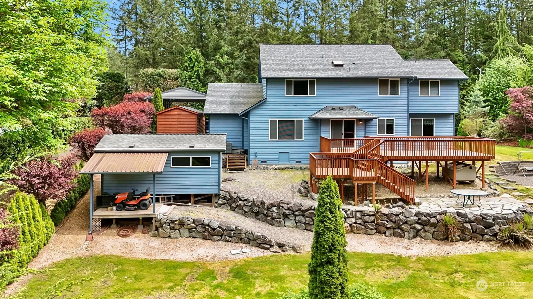 Feels like country, yet 4 miles from downtown Snohomish Home sits on 36952 square feet w/Native Growth Protected area meets up to the backyard w/nature trails throughout. Soaring ceiling in the entry & formal living room. Formal dining room features coffered ceiling. The kitchen features a breakfast bar & space for additional table. Family room has propane fireplace. Primary bedroom w/5 pc bathroom & two closets. Three car garage w/spacious driveway & 22 x 38 covered RV parking. 12×20 outbuilding with power and cable and a 10×20 garden shed. Expansive deck is a great space to enjoy the park like setting. Heat pump w/air conditioning, sprinklers, invisible fence, fire pit, & security system.
