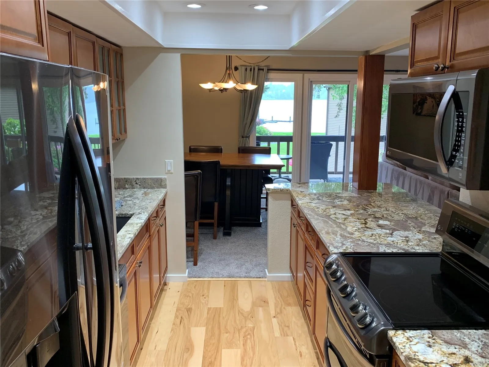 Beautifully updated, West Lake Sammamish waterfront one-level condo. Gorgeous view of lake, courtyard and landscaping. Features open kitchen, SS appliances & granite countertops. 2 bedrooms, 2 bathrooms with marble tile, large walk-in closet, and large modern vanity. Spacious living area, gas fireplace, and featured granite top wet bar with wine and beverage frig. Nook or office space, and separate laundry room. Large covered deck with storage closet. Large basement storage unit, and individual carport D4. Additional parking and moorage typically available to rent. This quiet, gated community has an outdoor pool, Jacuzzi, sauna, clubhouse, gym, kayak racks, and private dock. Great location near Microsoft, RTC, Marymoor Park, and Light Rail.