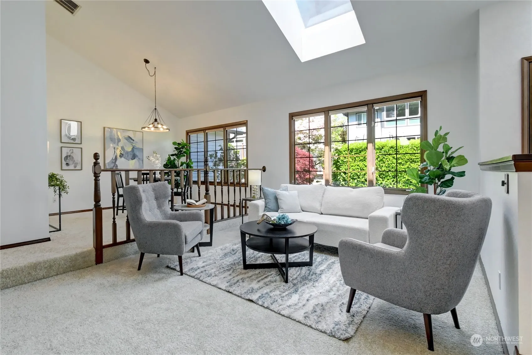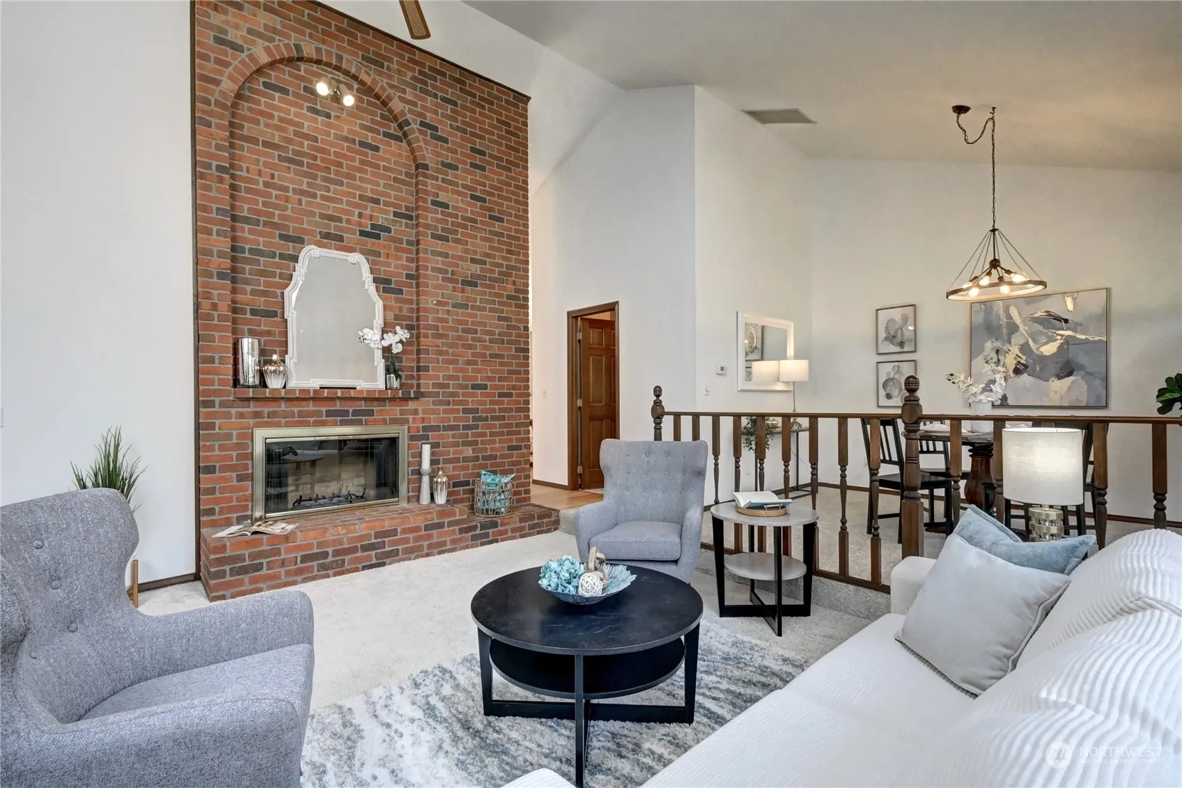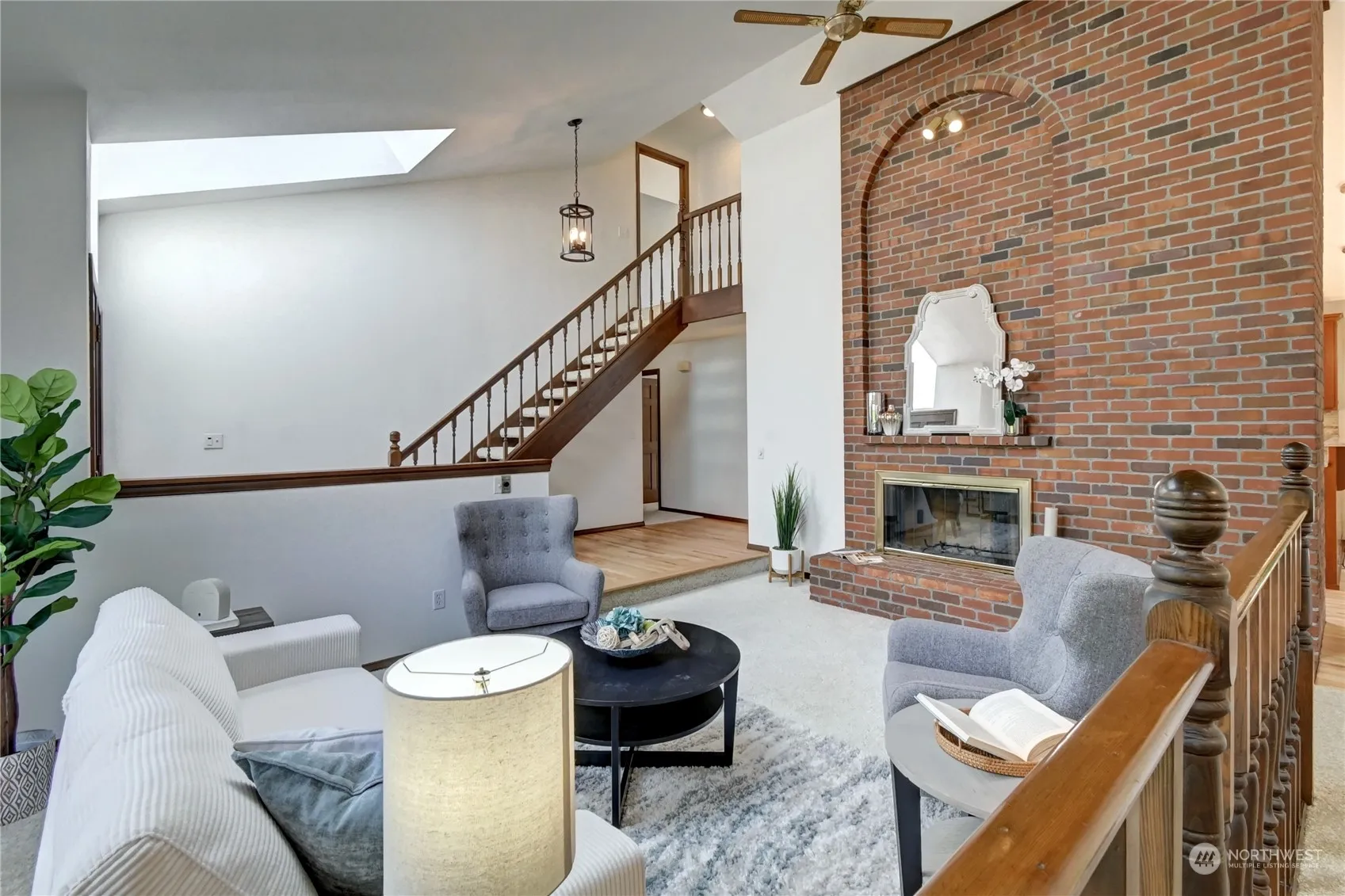Nestled on a serene private lane this spacious home boasts 4 bedrooms on the main level on a huge 14,000+ lot. No HOA dues! As you enter, the grand fireplace anchors the inviting living space, while the cozy family room and versatile den offer ample room for leisure and work. The updated kitchen has elegant finishes and brick accent wall. Step outside onto the large patio complete with an outdoor fireplace for those cool evenings. The large den upstairs has full bath. Located close to Totem Lake, Redmond, tech corridor, freeway access and great LWSD. Future development possible with sewer proposal already with city. With its picturesque and peaceful setting, this home is a sanctuary for those seeking refined living in a prime location.