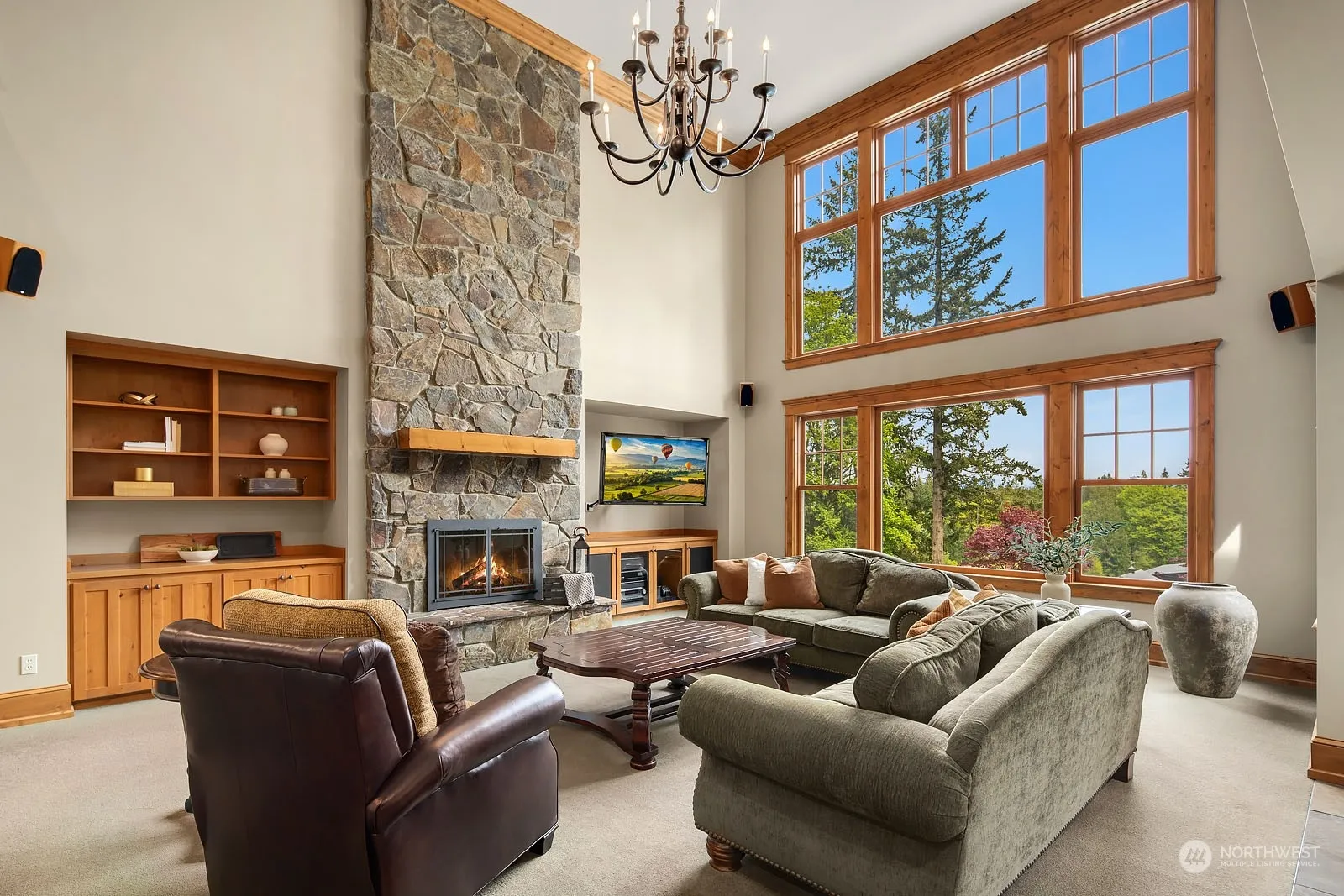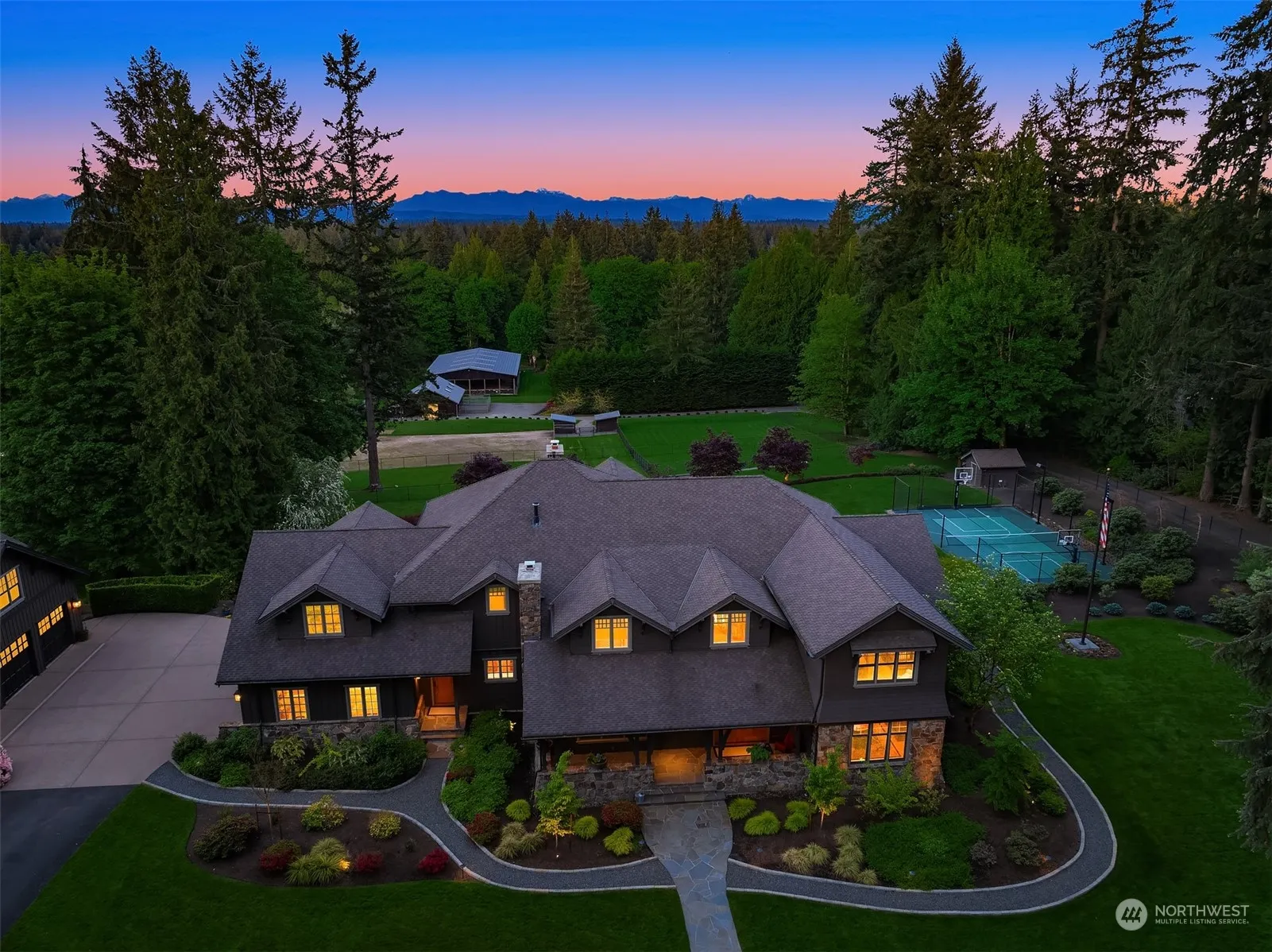 Custom lodge style equestrian estate on 7+ Cascade view acres is entertainer’s dream. Gated entry, fenced yard & established landscaping ensure privacy. Montana stone siding/fireplaces, custom millwork & two-story windows for magnificent sunrise views. Large en suite bedrooms. Thoughtfully planned gathering spaces for year-round enjoyment & active lifestyle. Large porches, oversize pool, sport court, garden beds, sprawling level lawns. 2nd kitchen ideal for outdoor entertaining or multi-generational living. 6-car garage + generous parking. For horse enthusiasts, private 4-stall barn, tack room, wash rack, hay loft, 70×120 covered arena, cross-fenced pastures & walking trails. Just minutes to Woodinville, wine districts & frwy access.