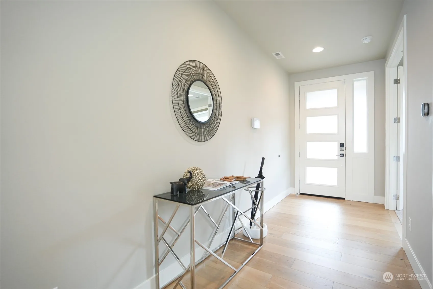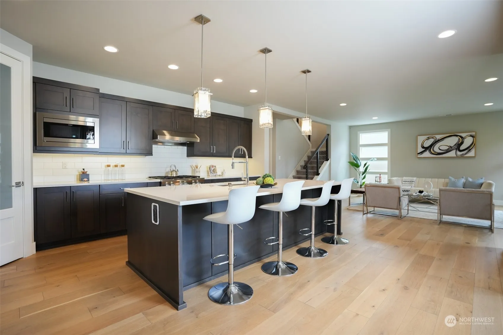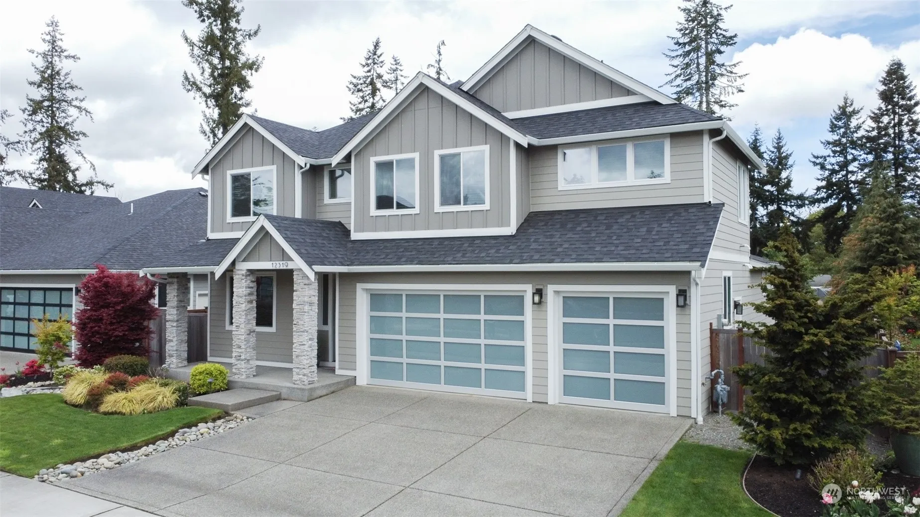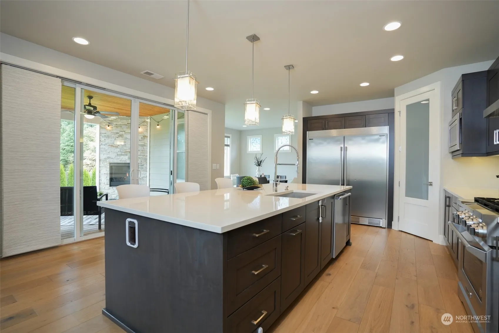 Exquisite open-concept residence situated in a tranquil neighborhood with convenient freeway connectivity. This residence features a gourmet chef’s kitchen with a walk-in pantry, Stainless steel gas range, and a 5-foot refrigerator. Revel in the expansive quartz island and hardwood flooring that flows throughout the main living areas, complemented by a picturesque garden visible through the windows. The master suite presents a spa-like bathroom complete with a chic barn door, a luxurious freestanding tub, and an expansive tiled shower. Outside, discover a fully fenced yard with impeccably landscaped grounds and a covered patio w/ an outdoor fireplace and lighting fixtures. The property also includes a generous 3-car garage with glass door.