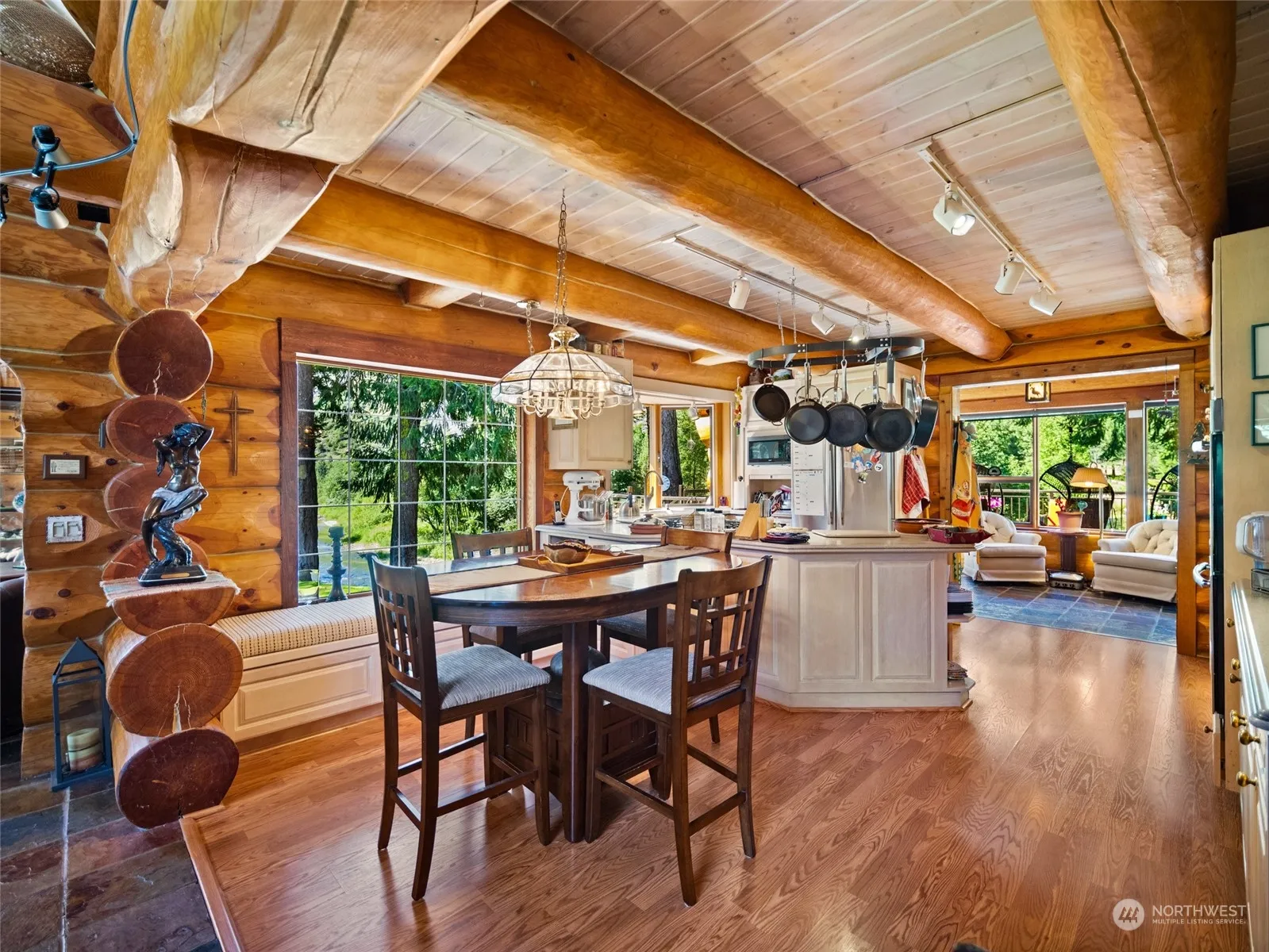On a sprawling 366+/-acre property sits the Stormy Lodge. This custom log cabin provides a blend of rustic charm and modern luxury. Step inside to find an open-concept living space, where exposed wooden beams and vaulted ceilings accentuate the natural beauty of the log construction. Large windows frame views of the surrounding wilderness, Entiat River, and beautiful pond, allowing you to stay connected with nature while indoors. The kitchen is a chef’s delight, featuring a double oven, custom cabinetry, and ample counter space. With rooms and bathrooms in the lower level, you can hosts guests or clients with ease. Across the road, 346+/- acres with a large shop, 2 more wells, and a gravel pit. Both shares of Stormy Cr Water Rights included
