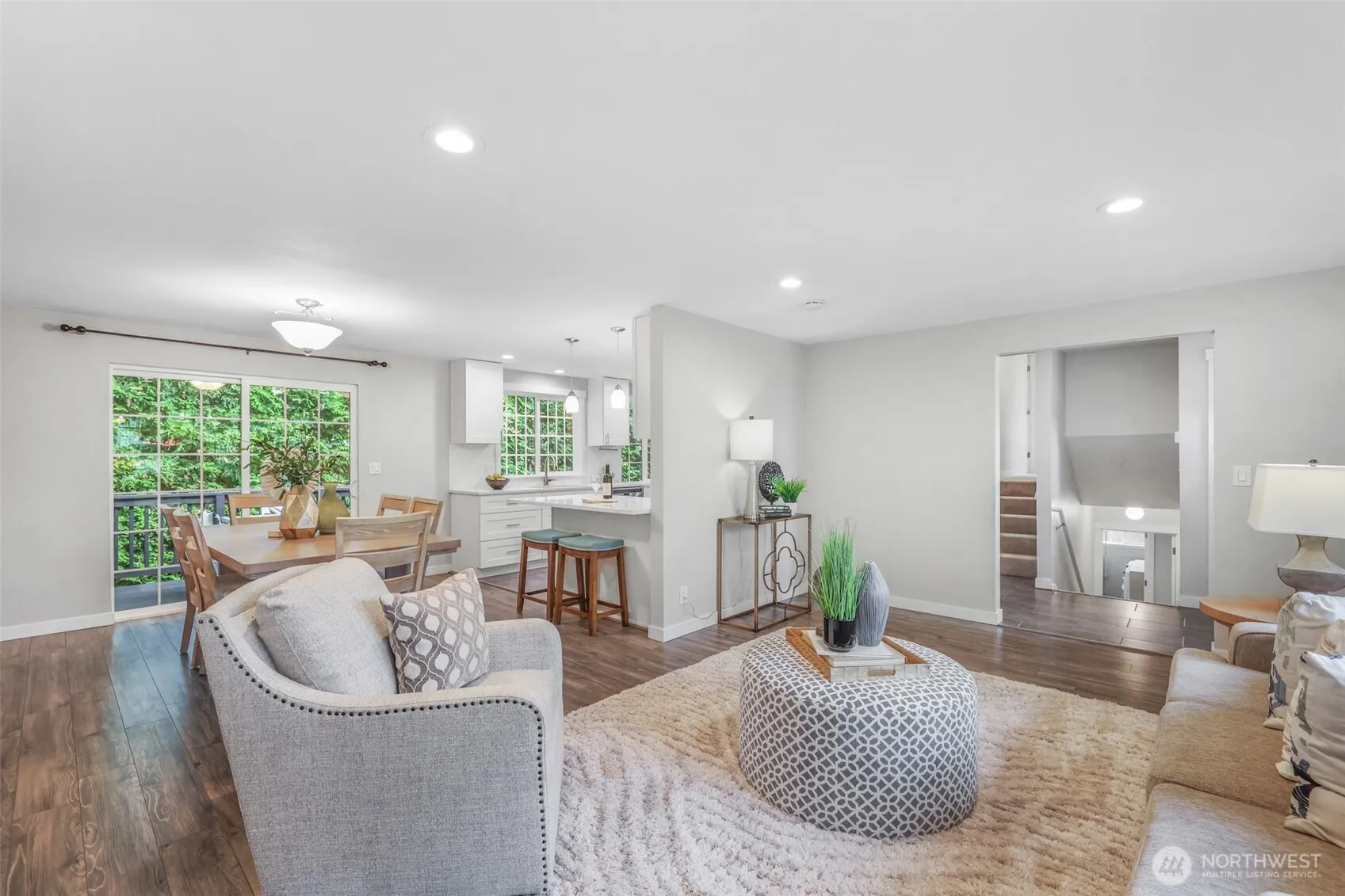 Welcome to this updated 3-bedroom, 1.75-bath tri-level home in Woodinville’s desirable Kingsgate neighborhood. With 1,870 sq ft in the top-rated Northshore School District, this home offers a bright open floor plan, modern kitchen with stainless appliances and island seating, and dining area opening to the deck. The primary suite features a private bath and walk-in closet, while two bedrooms share a full bath. A lower-level family room with fireplace expands the living space with access to the backyard. A two-car garage, laundry with utility sink, outdoor deck and patio, plus access to the community pool, neighborhood amenities, shopping, and nearby parks complete this inviting property. Enjoy comfort, convenience, and a wonderful community