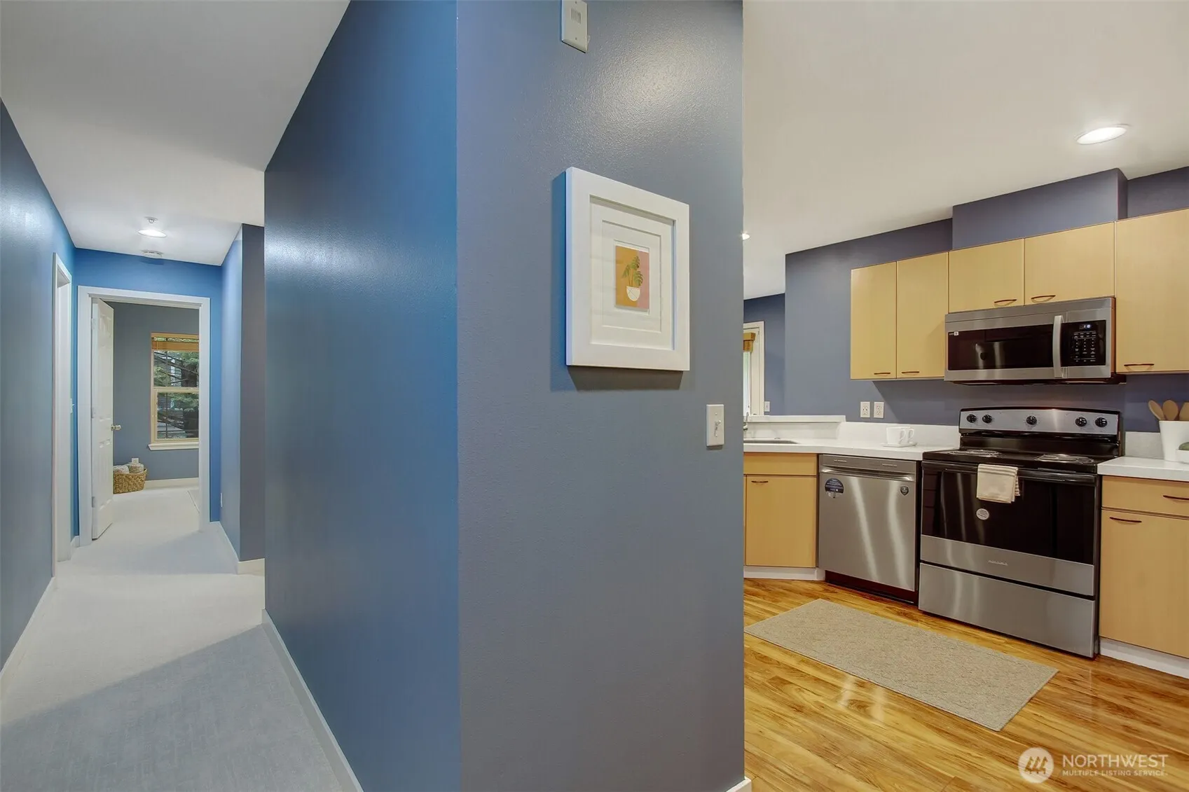 Top floor corner unit across from golf course flooded with natural light & surrounded by lush greenery! One-level condo w/elevator in bldg has been recently remodeled: brand new carpet, new interior paint & new stainless kitchen appliances. Primary bedroom features lrg en-suite bath w/double sinks & lrg walk-in closet. Enjoy gardening or bird watching on your deck & stay cozy inside by gas fireplace. Includes 1 common garage parking spot w/elevator access directly from garage. Conveniently located between 76th Ave W & 99, close to Edmonds Community College, & restaurants, cafes, shops, & the new Lynnwood Link light rail! Across from great 2 mi trail around Lynnwood Golf Course. HOA dues are a tad high, so condo is priced low to accommodate!