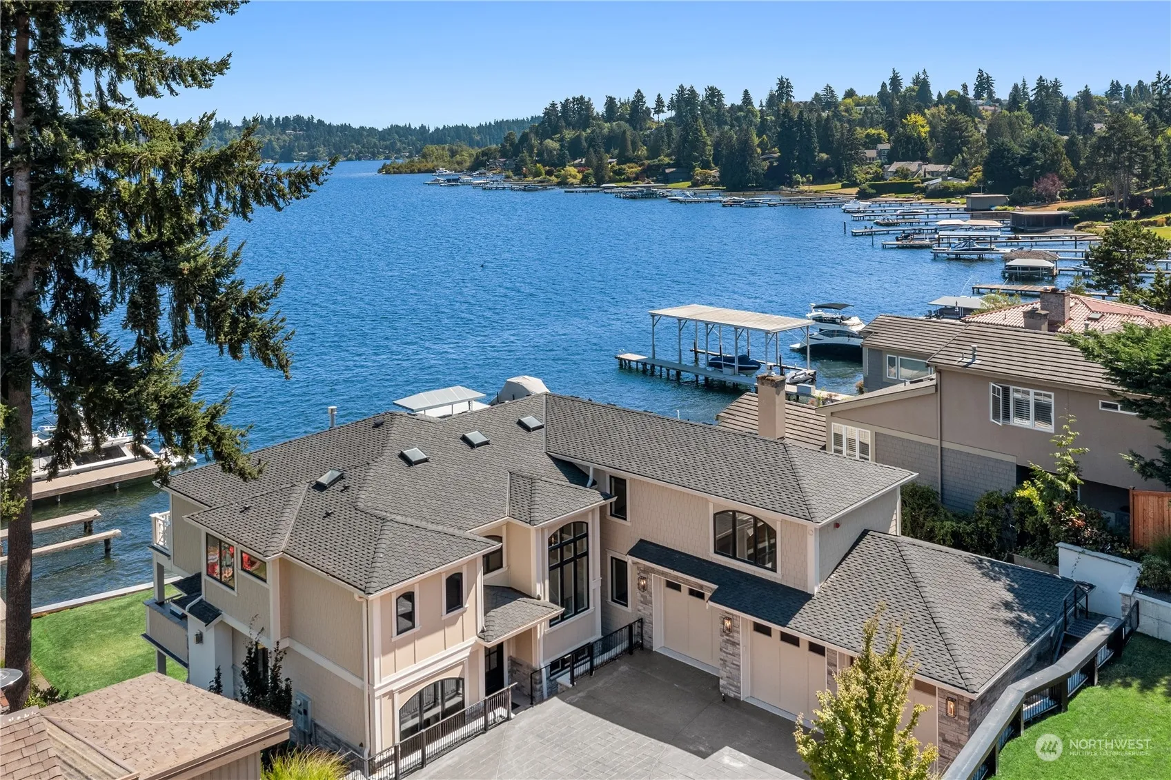 A spotless and stunning new-construction home, sited on sparkling north end waterfront, with captivating lake and city views. Live exceptionally in this perfectly crafted masterpiece, featuring great room with 20-ft ceilings and dramatic views, two designer kitchens, ensuite bedrooms, and the finest fixtures and finishes. High tech and high concept; wired for servers, generator, speakers and blinds. High tech security system. Garage has heated floors and EV charging. Multiple decks and patios present spot-on views of Bellevue’s gleaming skyline and fireworks from summer celebrations. Watch boat traffic from the shelter of Riley Cove and then join it on your own craft, setting sail from one of four slips from your 70-ft dock.