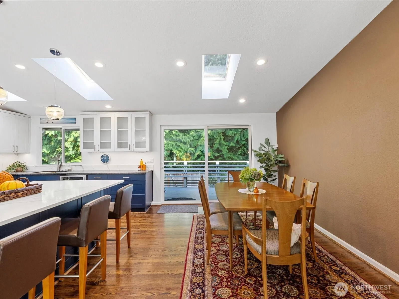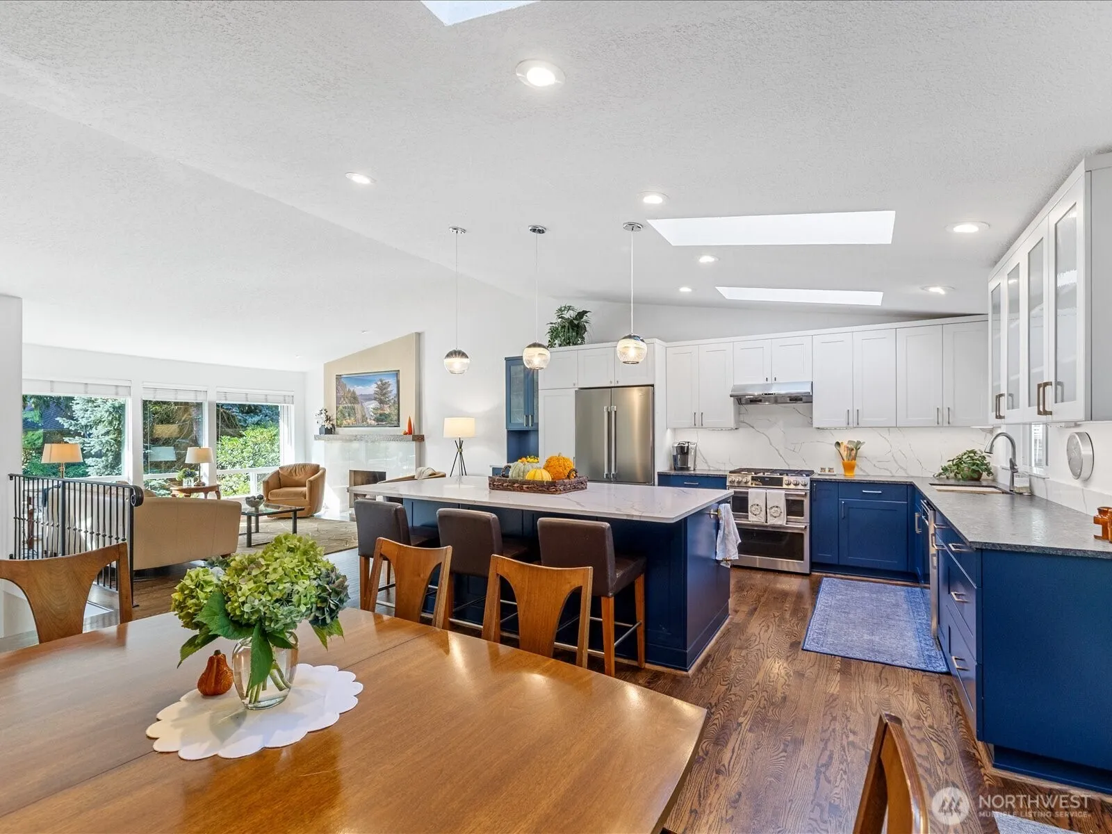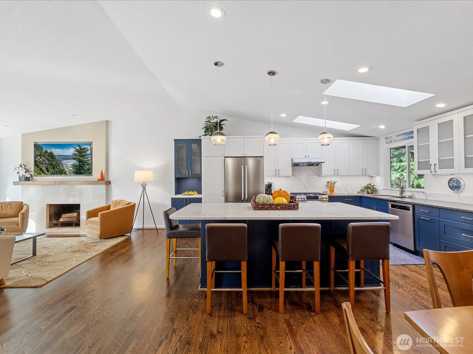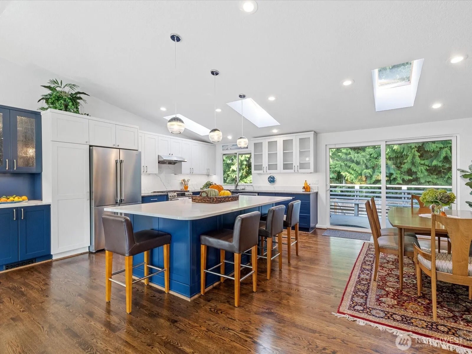 Tucked away on a quiet cul-de-sac in the highly coveted Woodsound neighborhood, this beautifully updated home is filled with natural light from vaulted ceilings & skylights, features rich hardwood floors and modern finishes throughout. The kitchen is a true highlight with quartz countertops, an oversized island, and stainless steel appliances. Upstairs offers 3 bedrooms, including a spacious primary suite with en-suite bath & walk in closet with organization system. The lower-level is perfect for hobbies, movies, play, or guests. Two-car garage w/ small shop area + RV parking. Backing to a serene greenbelt & just minutes from Picnic Point Beach, trails, parks, and top-rated Mukilteo schools, this home combines comfort, style, and location.