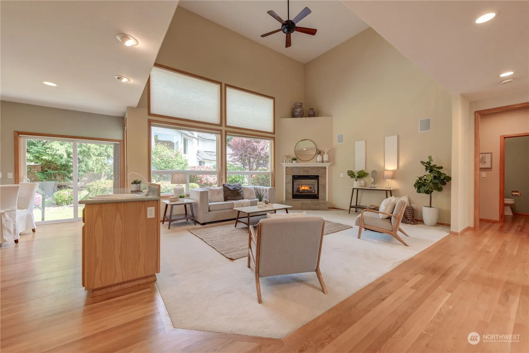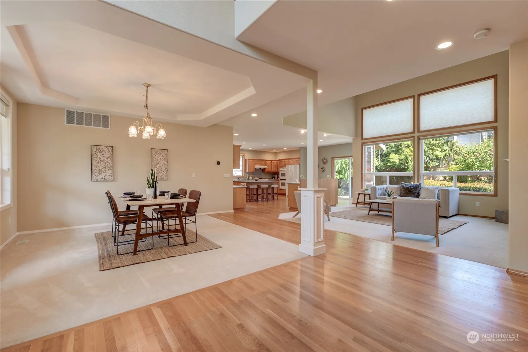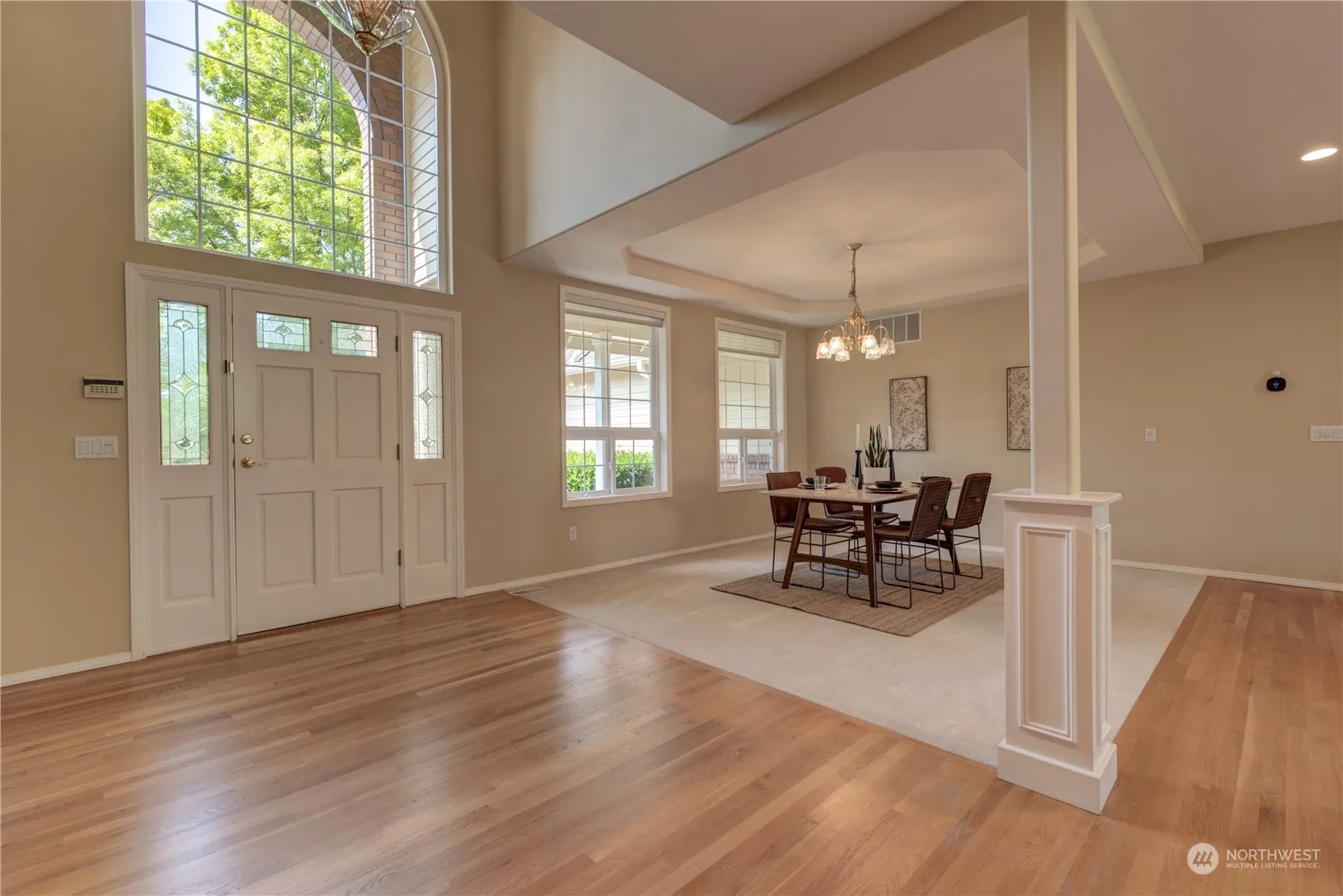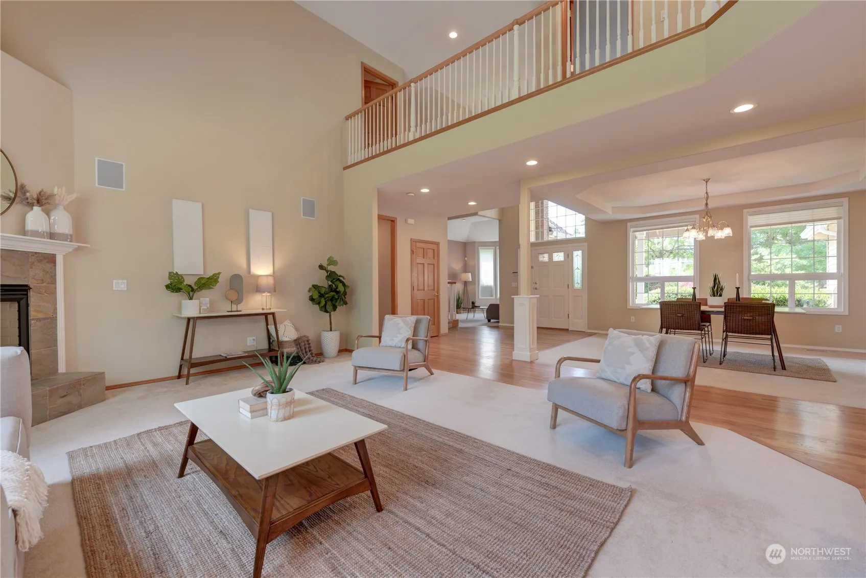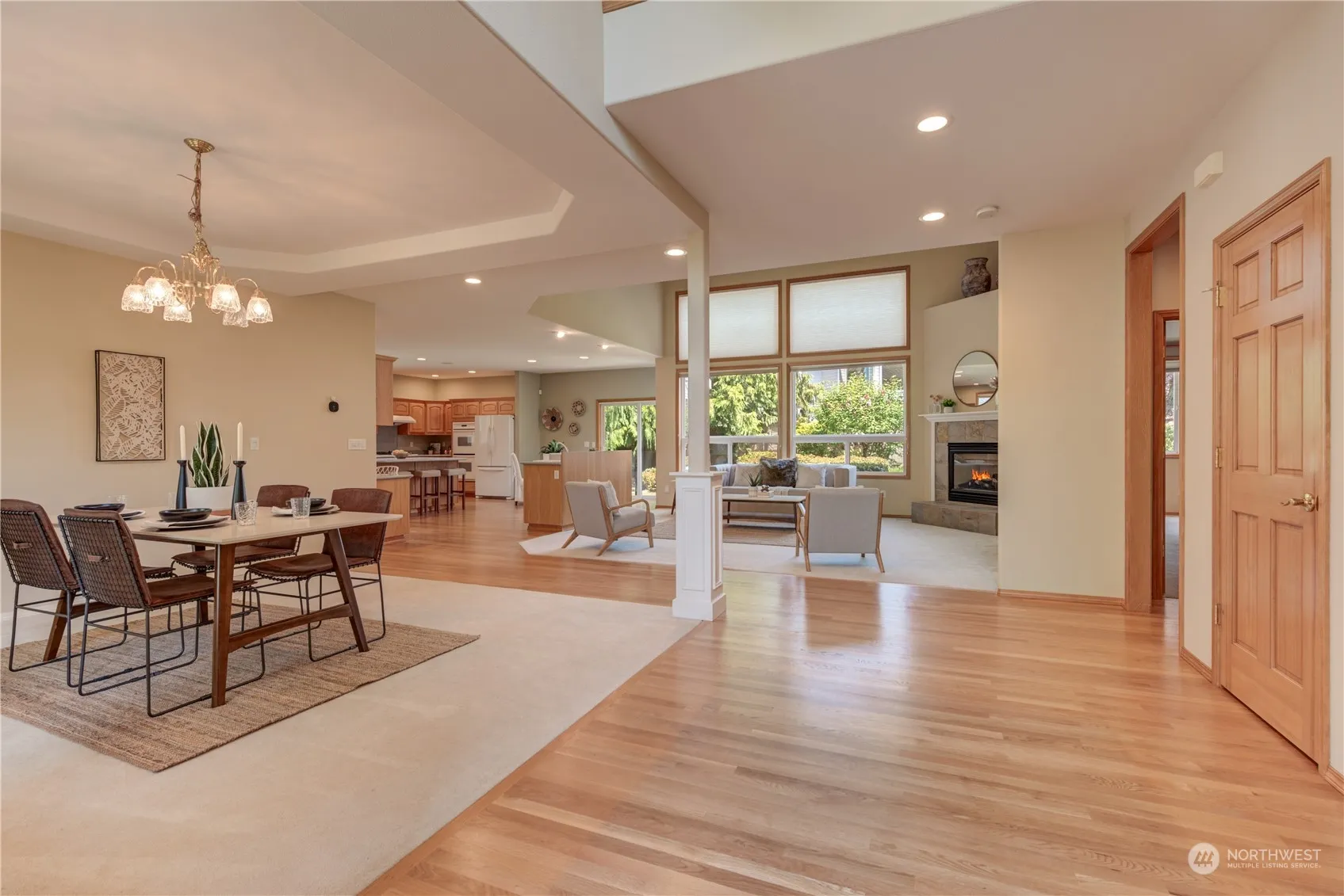 Mill Creek Country Club home in quiet division of Aspen & Primary Suite on the Main Floor! Elegant & bright family/great room w/2 story vaulted ceiling, bank of windows & gas fireplace. Living rm gas fireplace. Dining room is open & inviting w/coffered ceiling & flows seamlessly into the huge kitchen w/quartz counters, center island, double ovens, large walk-in pantry & 2nd island w/its own sink. Spacious laundry rm just off kit. Primary suite w/walk-in closet, 5 piece bth, jetted tub & tile flrs. Open-rail staircase, 2 guest bdrms, large bonus rm w/2 closets. Highlights include-hard wd flrs, skylights, 6 panel doors & central vac system. New furnace & AC 2022. 50 yr roof & gutters 2020. Community parks & walking trails. Excellent schools