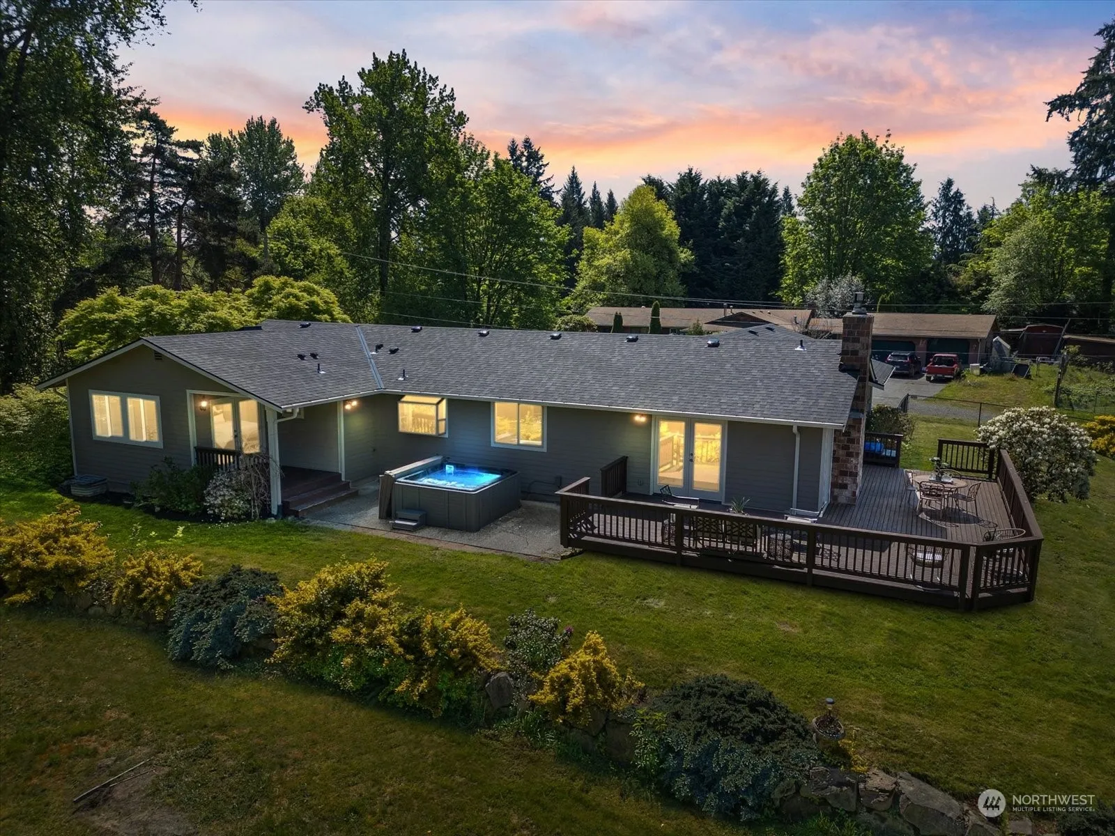 Step into this beautiful Rambler on a tranquil 2-acre lot, offering breathtaking vistas and ultimate seclusion. Entertain on the wrap-around deck, relax in the private hot tub, or gather around the firepit for cozy evenings. This 3-bed, 2-bath home features a master suite with French doors opening to a secluded deck. With a New Roof, New gutters, brand new doors and trim throughout the entire home with updated light fixtures. Your home also comes with RV parking with electrical setup for it, with enough space to build a detached additional unit (Buyer to Verify)With this Highly sought after location, Get the private country feel of living while still in great proximity to Bothell, Woodinville areas and shops and in a great school district!