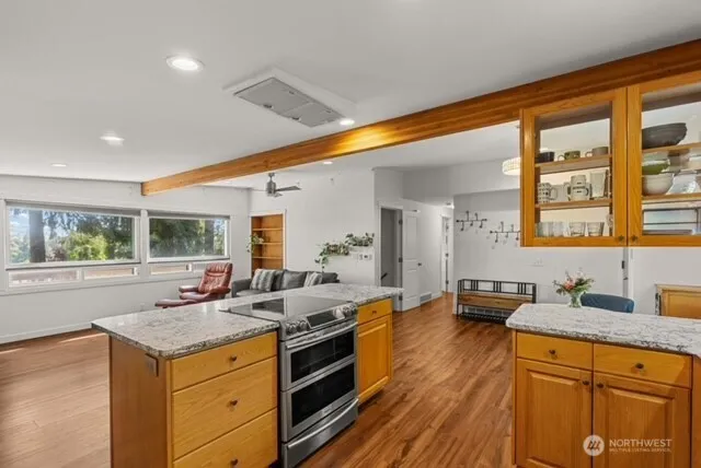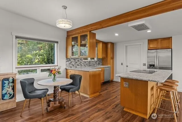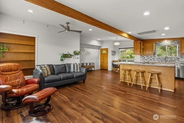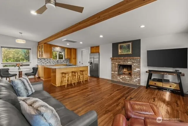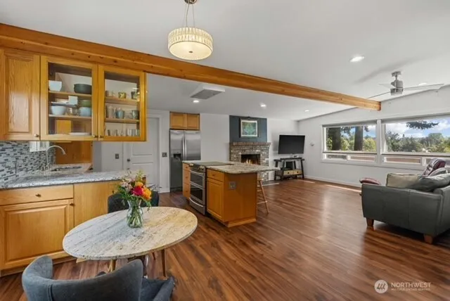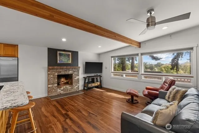 Centrally located for the daily commuter in sought-after North Hill & ready to welcome you home! Brand new roof (2025),new H20 tank +recently updated deck overlooks bkyd surrounded by territorial view. Bright &spacious living area on main meets you at entry w/large windows, laminated hrdwds & F/P. Kitchen w/bar top seating at island, SS apps, &Quartz counters. Main offers 2 Bdrms +Bathroom, &convenient access to attached garage +large deck. Features daylight bsmnt w/additional Bdrm+Office/Den, rec rm w/2nd F/P, Bathroom, &Utility w/Washer/Dryer. Enjoy natural privacy & ample storage w/workshop below deck +massive storage shed. Attached 1-car garage +RV Parking! Minutes to downtown Des Moines; marina, restaurants, shopping, parks & trails!