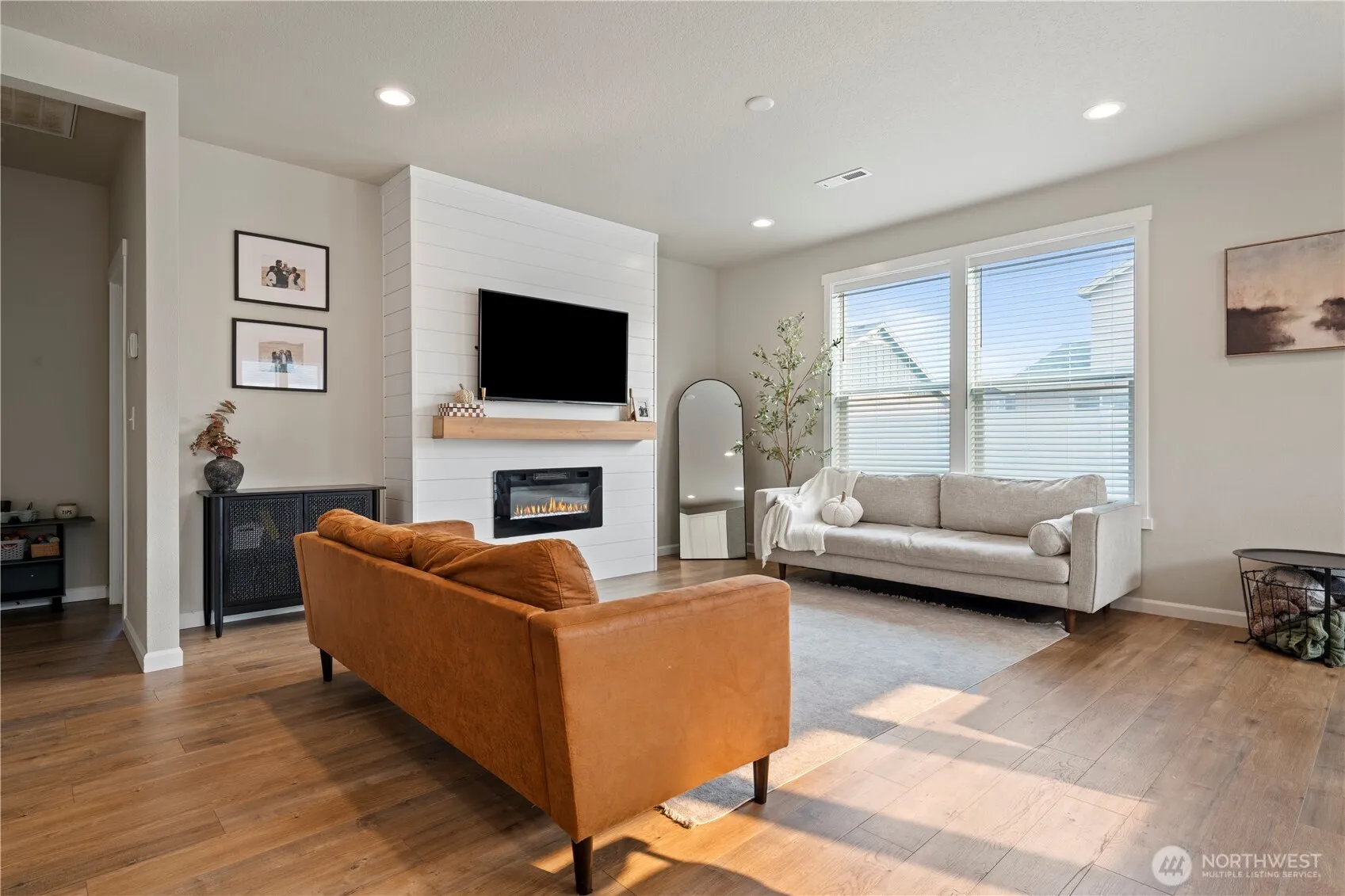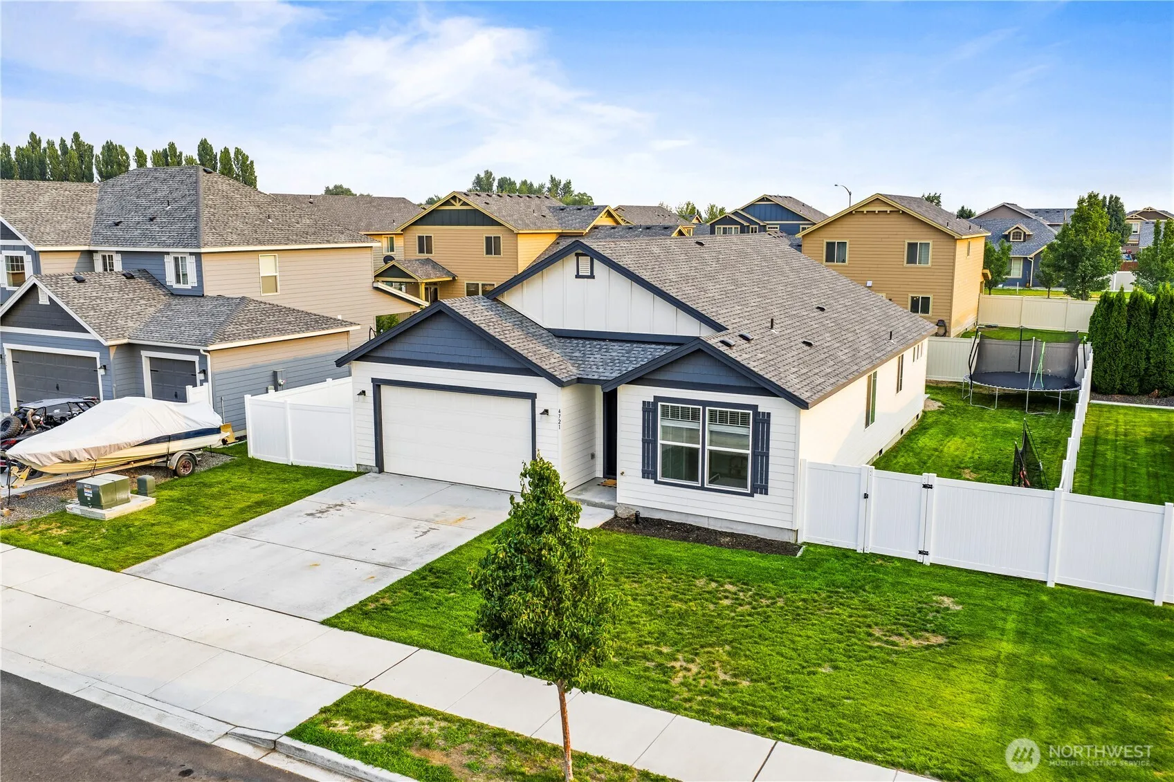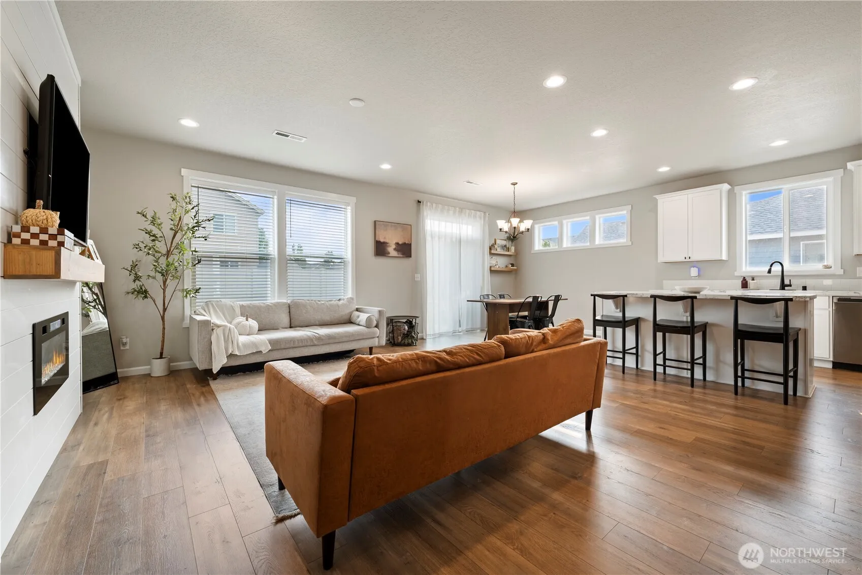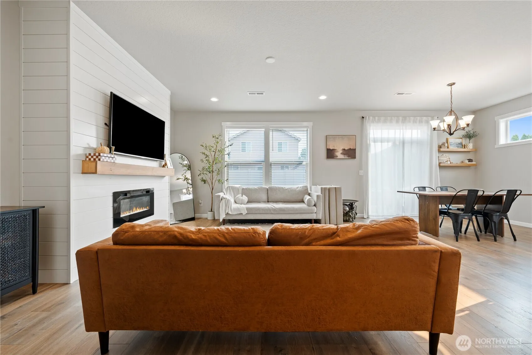 Beautifully maintained 3 bed, 2 bath home with 1,550 SF of comfortable living space! Located near scenic golf courses and the lake, this home offers a fully landscaped, fully fenced backyard, perfect for relaxing. With 9ft ceilings, the open layout features a spacious living room with an electric fireplace, flowing seamlessly into a kitchen that boasts a large island, ample cabinetry, and modern finishes. The primary suite includes a dual vanity and a glass-enclosed stand-up shower for a spa-like experience, and a walk- in closet! Enjoy durable LVP flooring in the main living areas and cozy carpet in the bedrooms. A generous laundry room with a utility sink adds convenience. This move-in-ready gem combines style, comfort, and location.