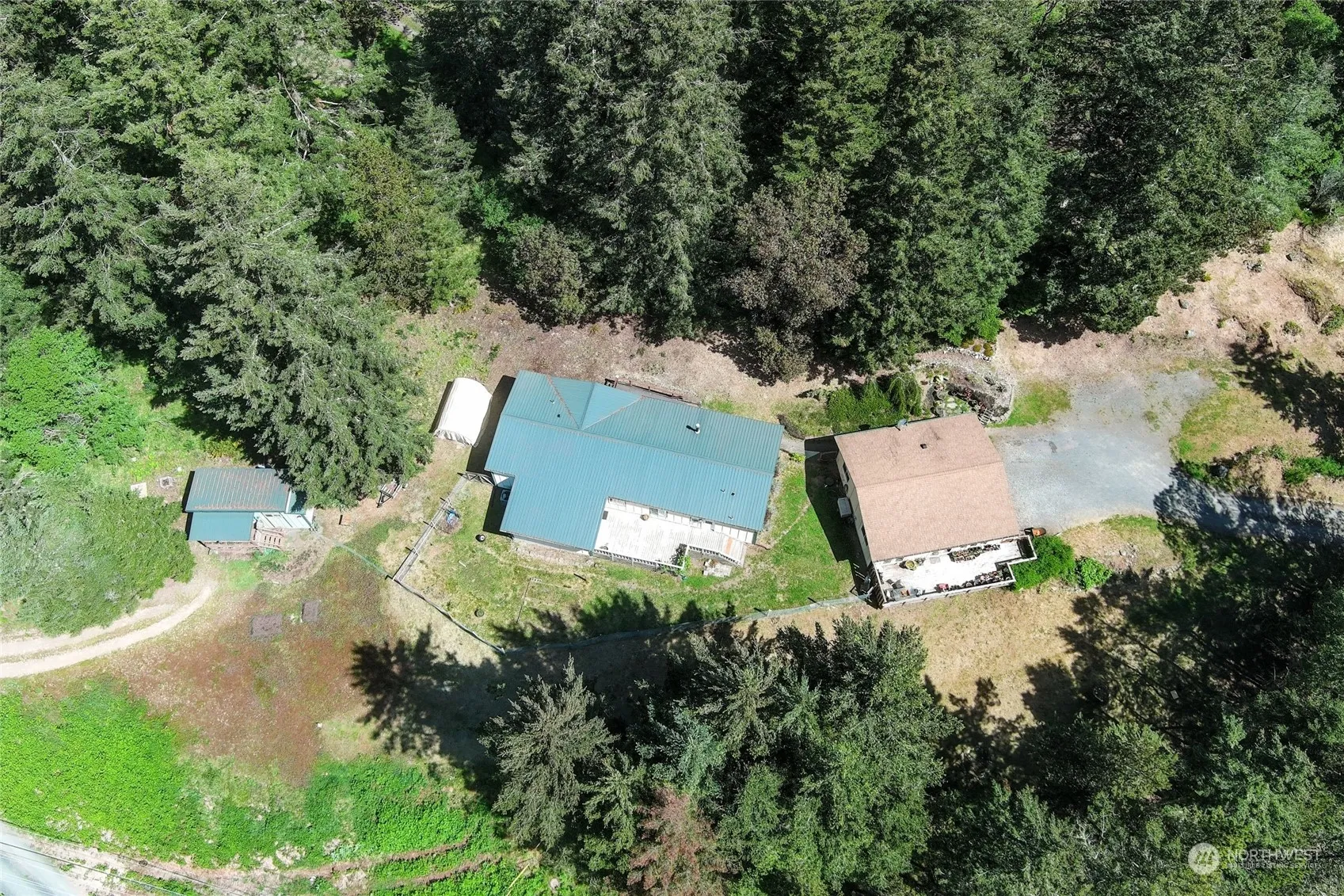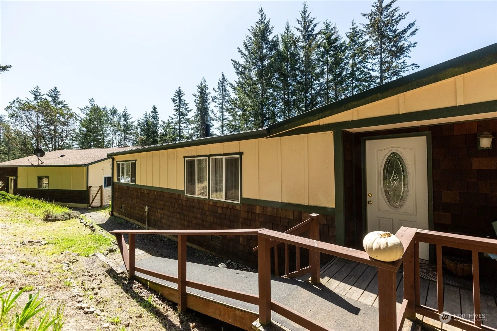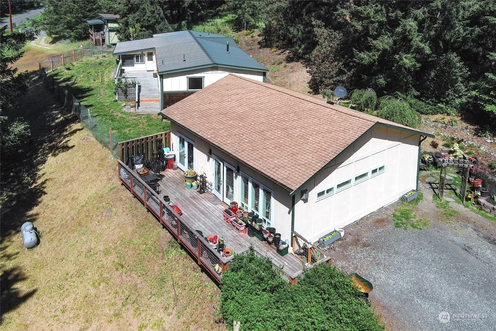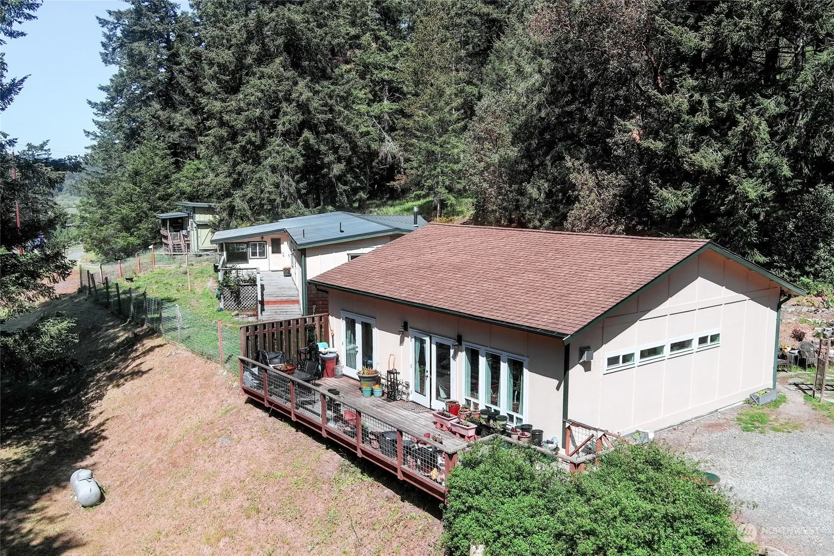 Close to town, 3 buildings. 2218 sq ft one level main house (new carpeting), 3 bd-2 full bath, (1979 manufactured home) W/new heat & AC (Oct/2023), enclosed sun room & metal roof. The 990 Sq foot Stick built Bunkhouse (permitted garage Mother-In-Law conversion) has a great room, 1 large primary bedroom, kitchenette, full bath, laminate flooring & radiant heated bathroom floors. Decks on each structure w/small privacy patios. A modern detached 160 sq ft Art Studio w/bath. Property has amazing possibilities for owner, guests, relatives, employee housing. 1.59 acre corner lot, 1st driveway on the left on Terrace Dr. Fully rented for investment income.