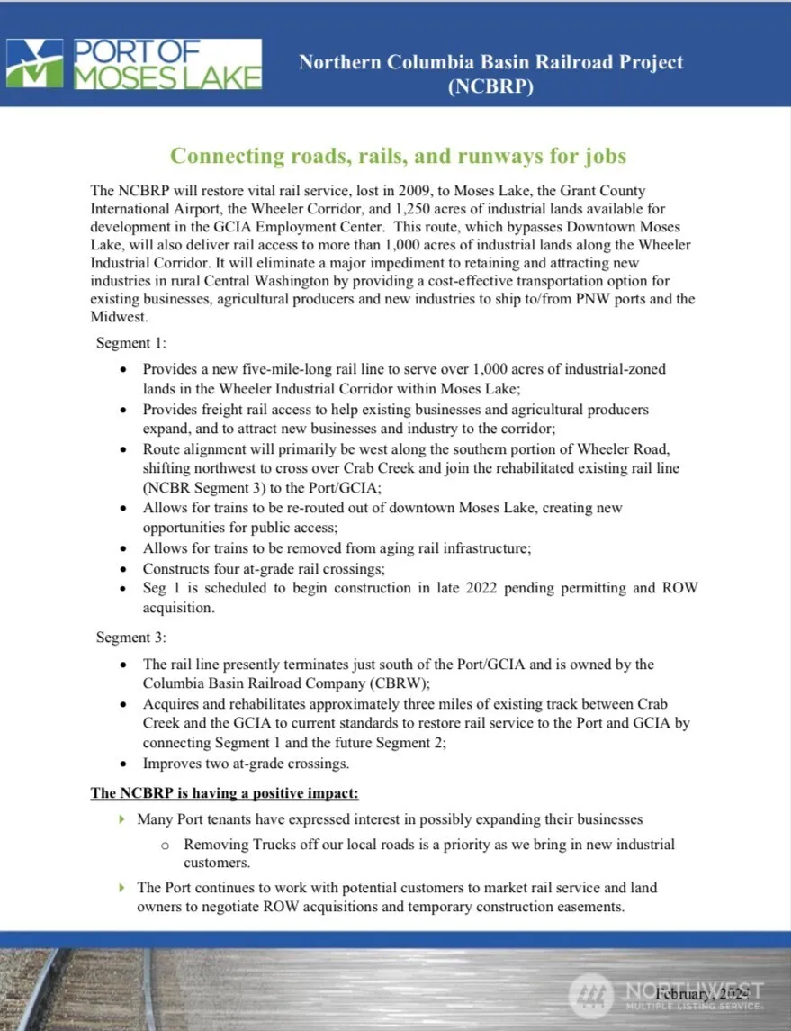 2.80 Acres-Prime Light Industrial Land off of the Wheeler Road Corridor, Moses Lake WA. Strategically located just minutes from downtown Moses Lake, ideal off business seeking proximity to major transportation routes and access, as well as essential amenities. Site is versatile for multiple uses. The Northern Columbia Basin Rail Project will be near this property, see attached.