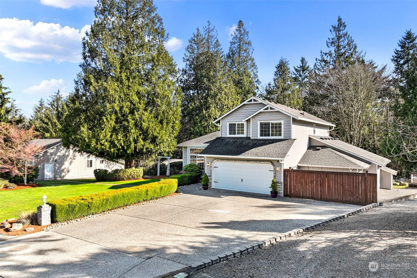 2 homes on stunning 1.2 acres complete with putting green and RV parking! The main house is 2477 sq ft, 3 bed + office, 2.5 bath, updated kitchen with granite countertops, SS appliances, and luxe laminate flooring. Vaulted ceilings and a sunken living room add extra style! ADU is 500 sq ft, 1 bed, 3/4 bath with completely separate living from the main house, permitted in 2024. So many conveniences throughout this meticulously maintained home, inc a Trex deck w/PVC railing, garden shed, generator hookup, and sprinkler system. This home is nestled in a quiet, peaceful neighborhood in North Tapps offering the perfect blend of space, convenience, and multi-gen living with desirable Dieringer schools – Ask your agent for special features!