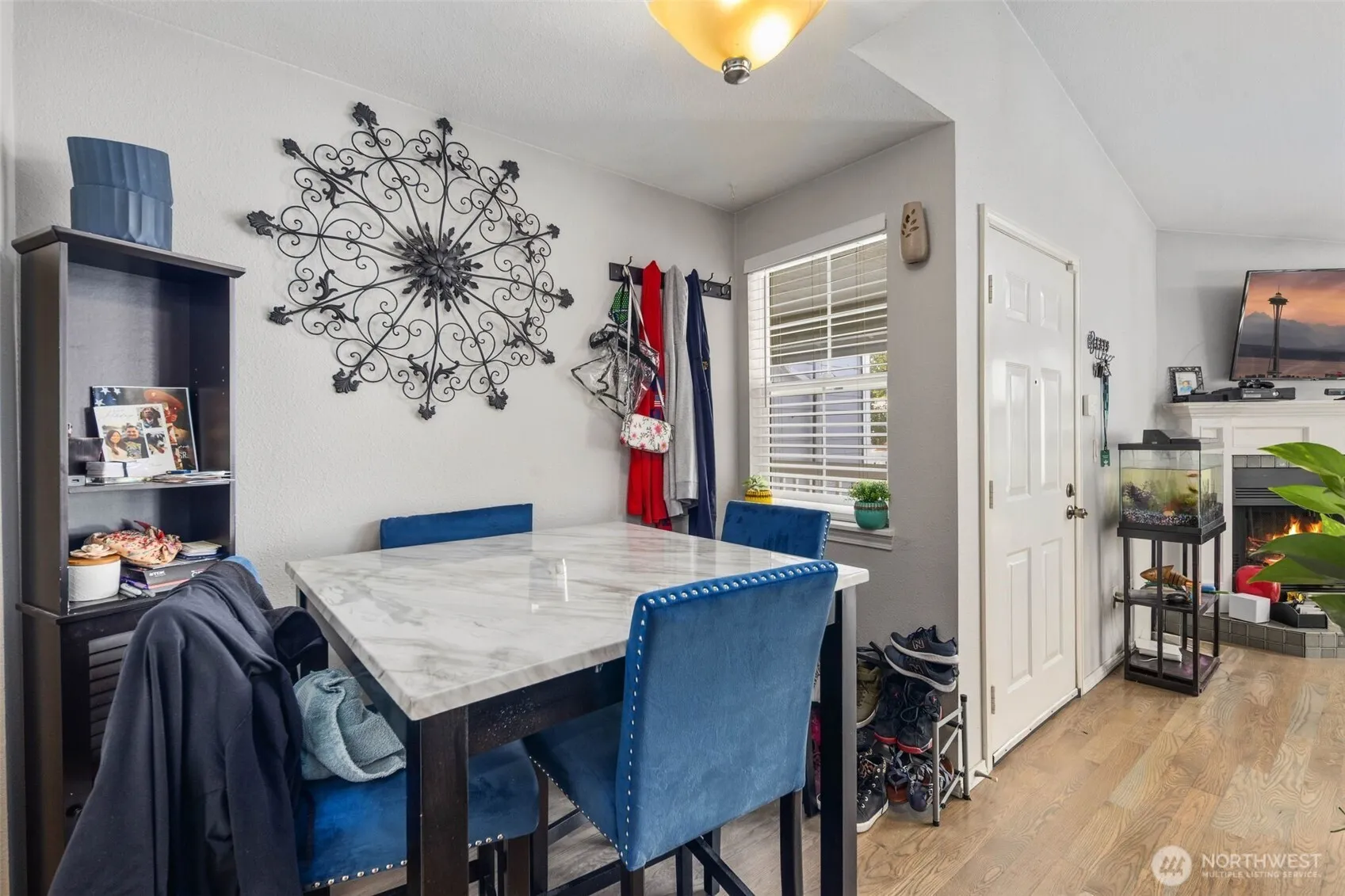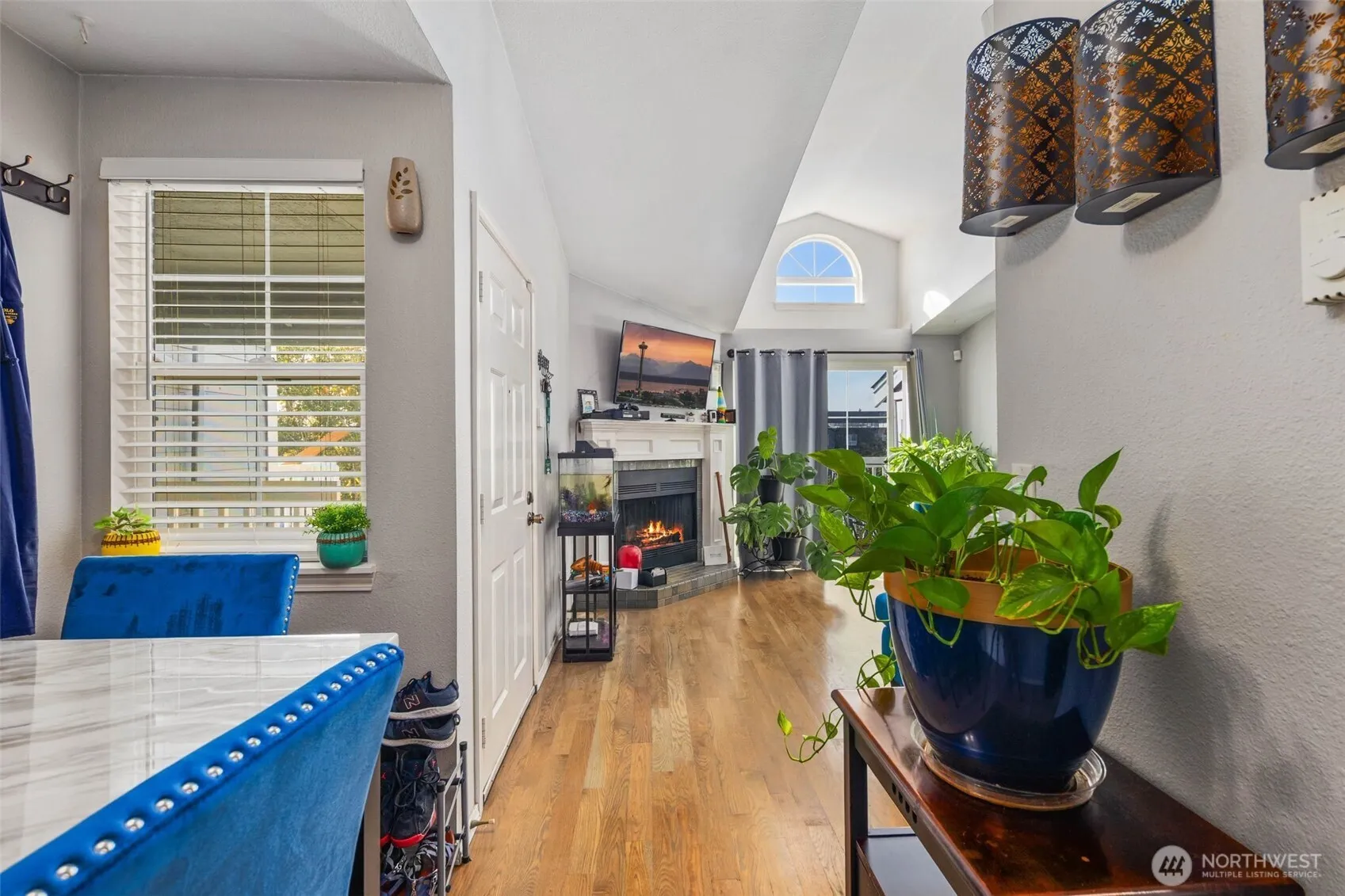 Bright Top-Floor Unit with Vaulted Ceilings & View! Move-in ready 1 bed / 1 bath condo featuring stainless steel appliances, tile countertops, dual sinks, and a cozy fireplace. Enjoy a large walk-in closet, private deck with extra storage, and assigned parking plus carport. Perfect for commuters—just minutes to I-5, Hwy 99, and close to transit! future light rail opening end of 2025. Great for buyers, downsizers, or investors!