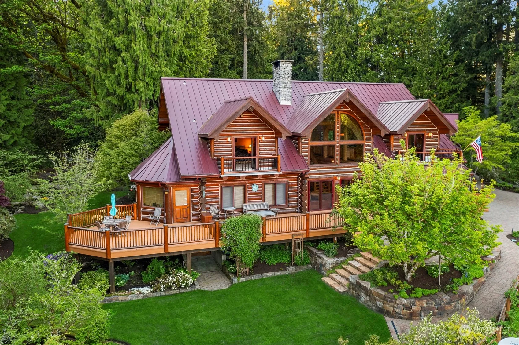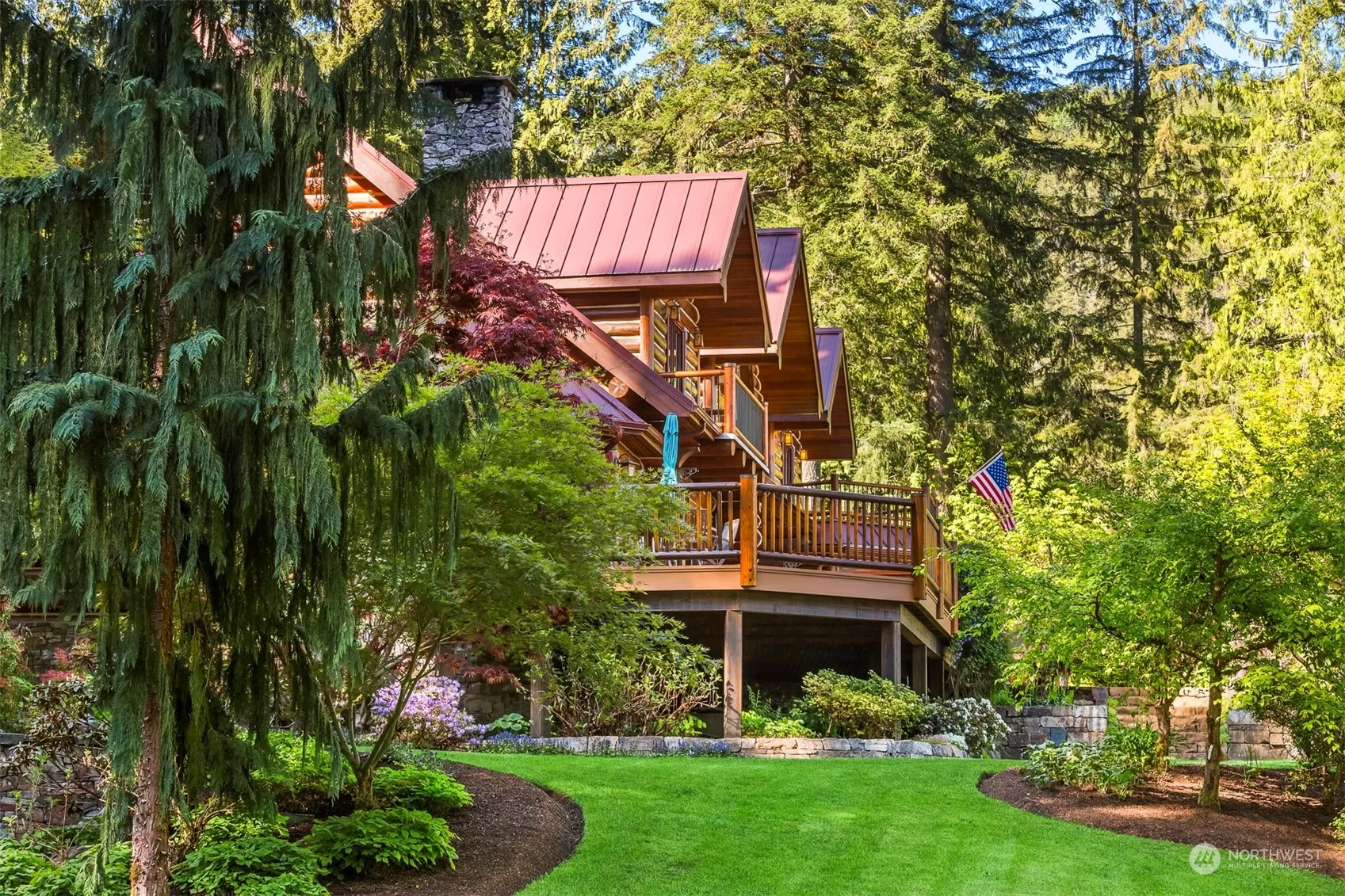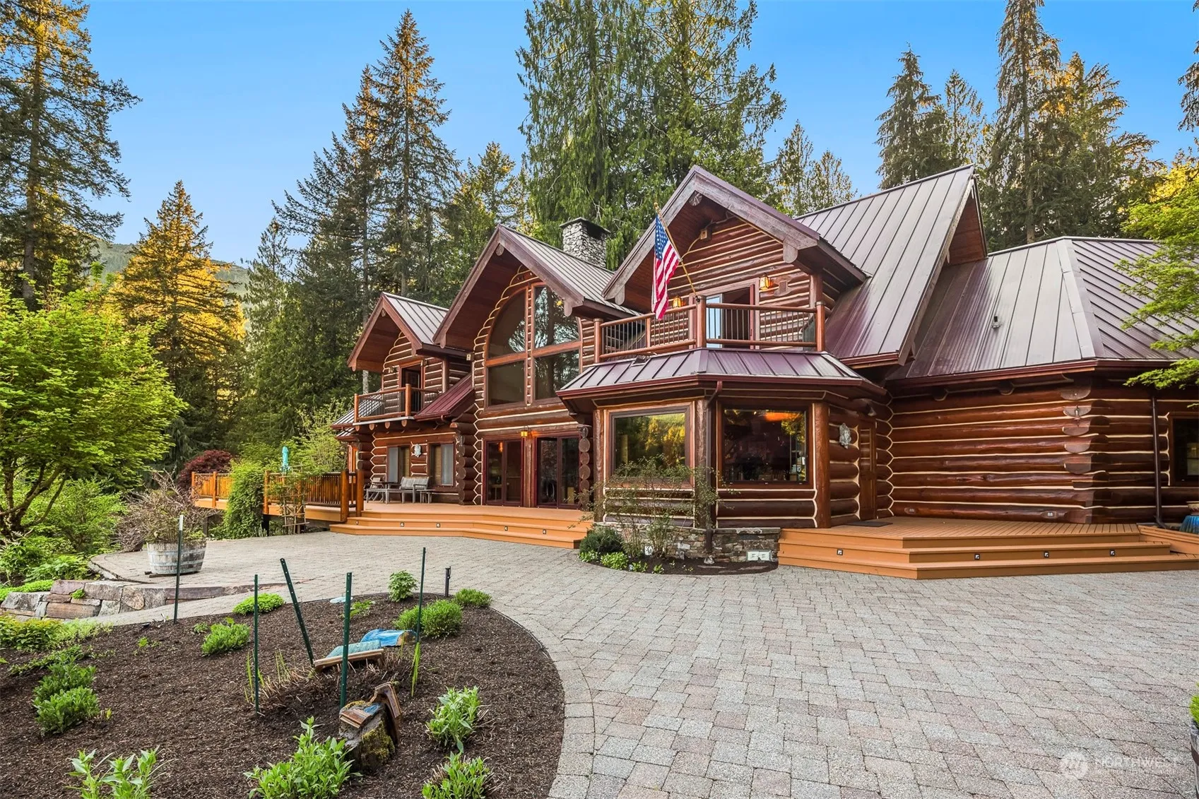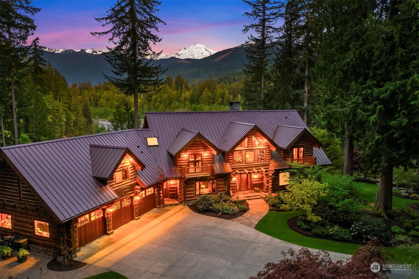 Embrace the grandeur of this Mt. Baker estate, boasting a mile of North Fork Nooksack River frontage across 15 acres. This majestic property offers an unparalleled après ski lifestyle with breathtaking panoramic views descending below the mountain range. The meticulously curated grounds feature serene waterfalls, meandering creeks, and tranquil ponds, crafting an exquisite year-round haven. Discover a true log estate crafted from the regions original fir logs to showcase exceptional artistry. The 30-foot vaulted ceilings create a grand ambiance, while a striking fireplace made entirely of local quarry limestone enhances the estate’s elegance. This property is the epitome of refined living, blending natural beauty with sophisticated luxury.