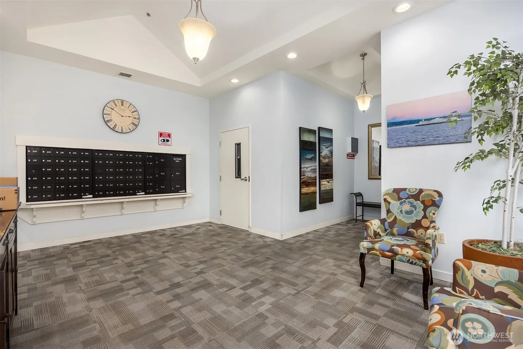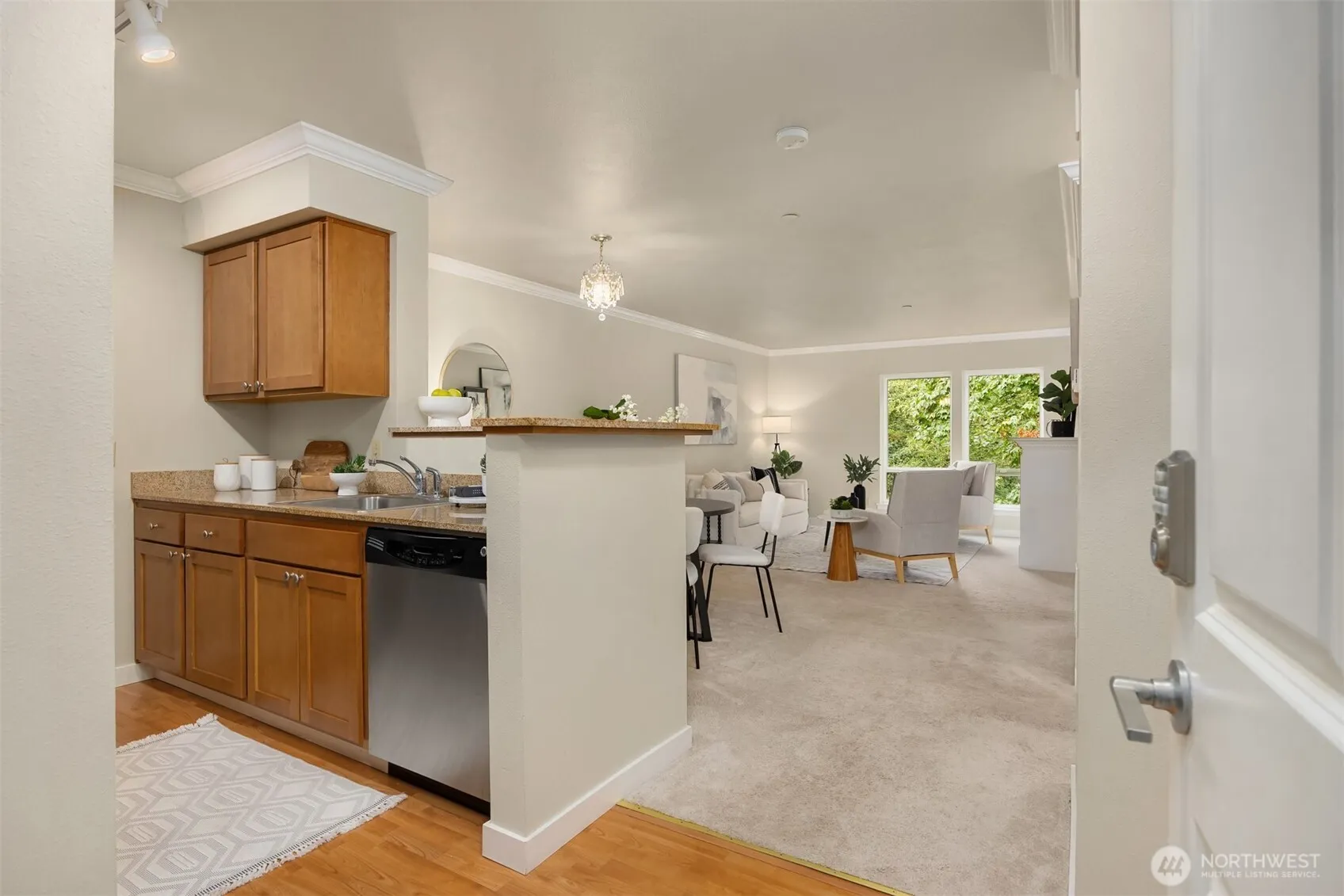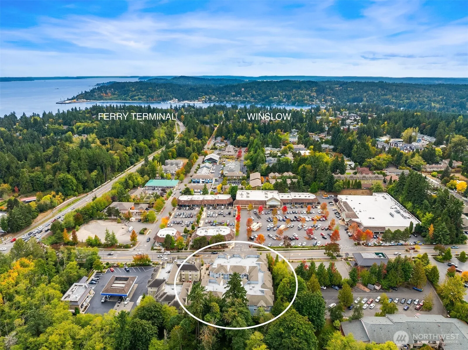 Welcome to Island Crossings, a condominium close to shopping, public transit, and island amenities such as an aquatic center and library. This one-bedroom home has been lightly lived in and well maintained. Granite countertops and stainless steel appliances adorn the kitchen and crown molding adds a touch of elegance. The living room is anchored by an electric fireplace with deep mantel. Enjoy a dedicated, covered parking space in a secure garage, and building access from lobby with code or key only. An elevator will whisk you to the third floor, where this home is located on the quiet north side of the building. Windows overlook 2+ acres of forested open space that abuts the 22-acre Sakai Park.