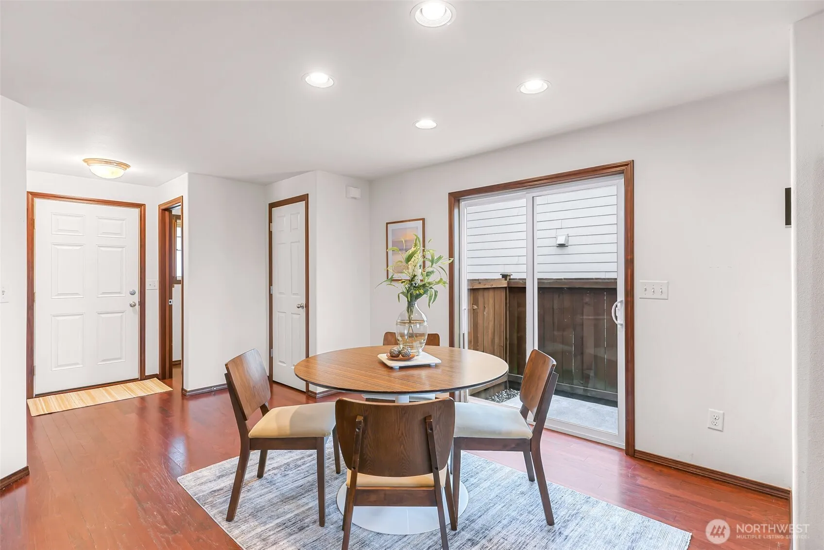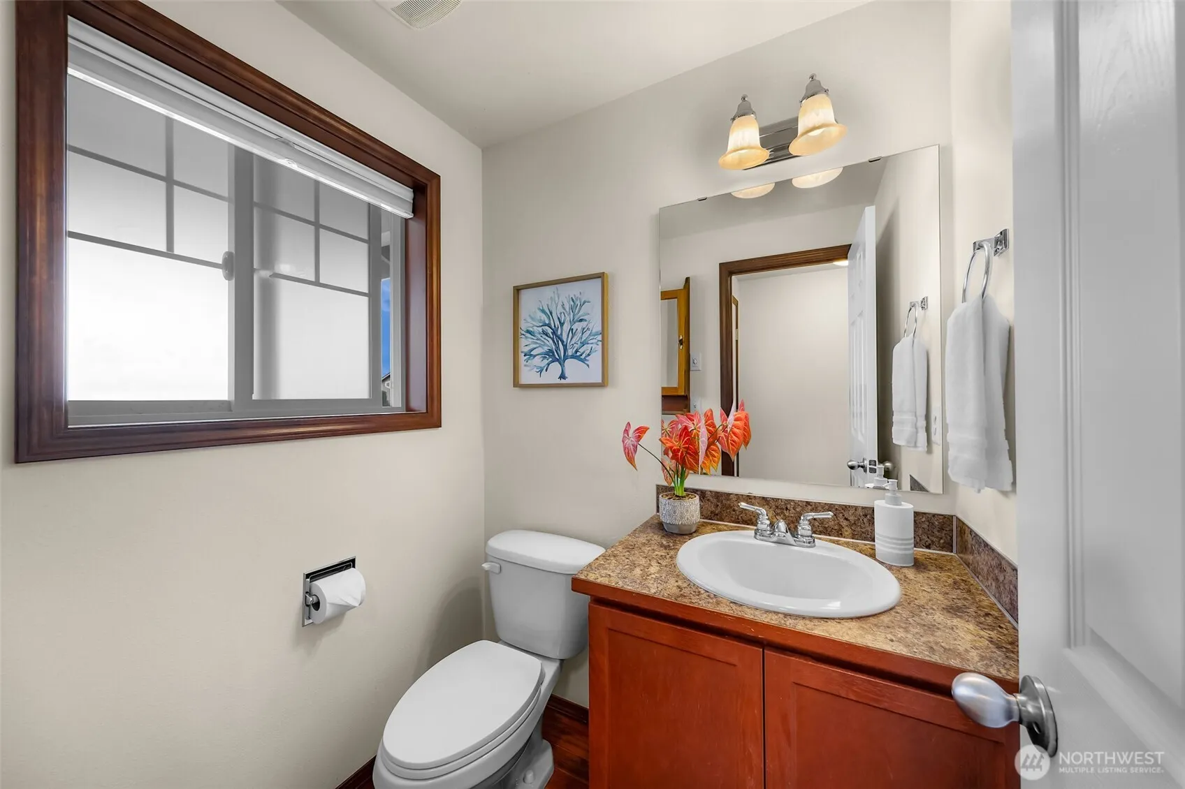Beaches, Boats & Birch Bay Sunsets nearby! Bay Crest South home has Cherry finish trim & cabinets thru-out. The dining area slider opens to the side yard & leads to a patio/firepit & playhouse. Granite tile counters are in the kitchen, a new microwave with all appliances incl. The living room is off the kitchen/dining & has a large window overlooking your backyard, no neighbors at the chain link fence, just nature. Upstairs, you’ll find an office/media area with a built-in desk, laundry room plus a full bathroom. Walk-in closets are in all 3 bedrooms. The primary bedroom overlooks the backyard w/a walk-in closet that is HUGE. Double sinks in the primary ensuite. Backs to a greenbelt w/a side gate. 1/2 bath on main. Bring this home to life.