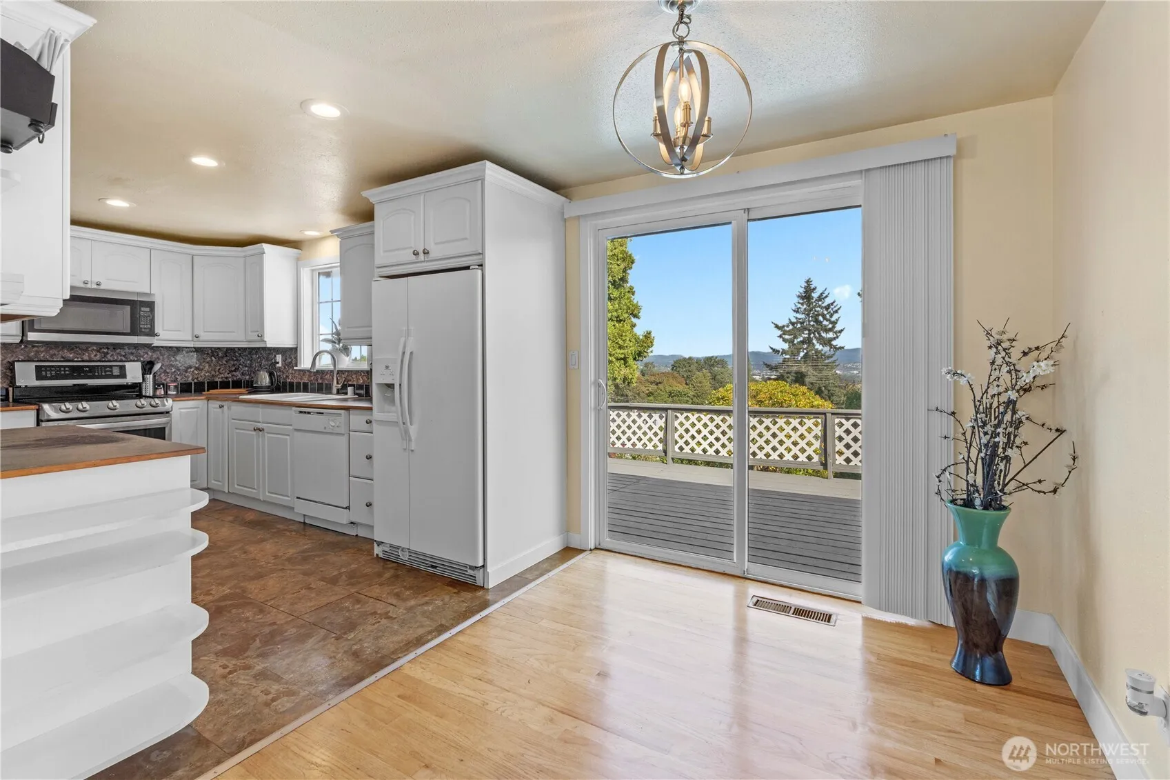 Enjoy stunning valley & mountain views from the spacious deck of this versatile home! Featuring a newer roof, generous off-street parking, a spacious 2-car garage & a large backyard for outdoor living. Inside, 2 full kitchens make it ideal for multi-generational living or rental income, while two cozy wood-burning fireplaces add warmth and charm. The daylight basement offers great ceiling height & plenty of space to fit your needs. Conveniently located just minutes from the airport, shopping, dining, schools, freeway access, light rail & parks. All appliances in both kitchens plus washer & dryer are included—move right in and start enjoying! SEE THIS GREAT HOME TODAY!