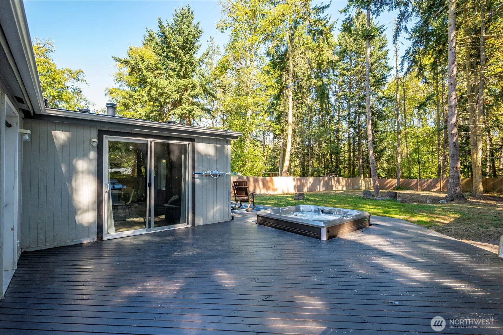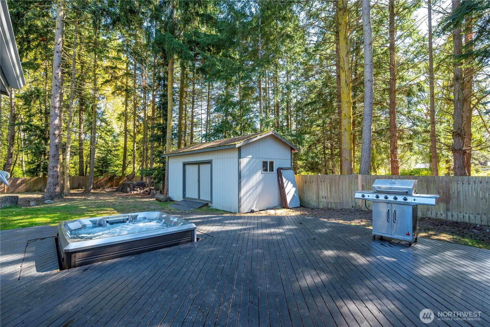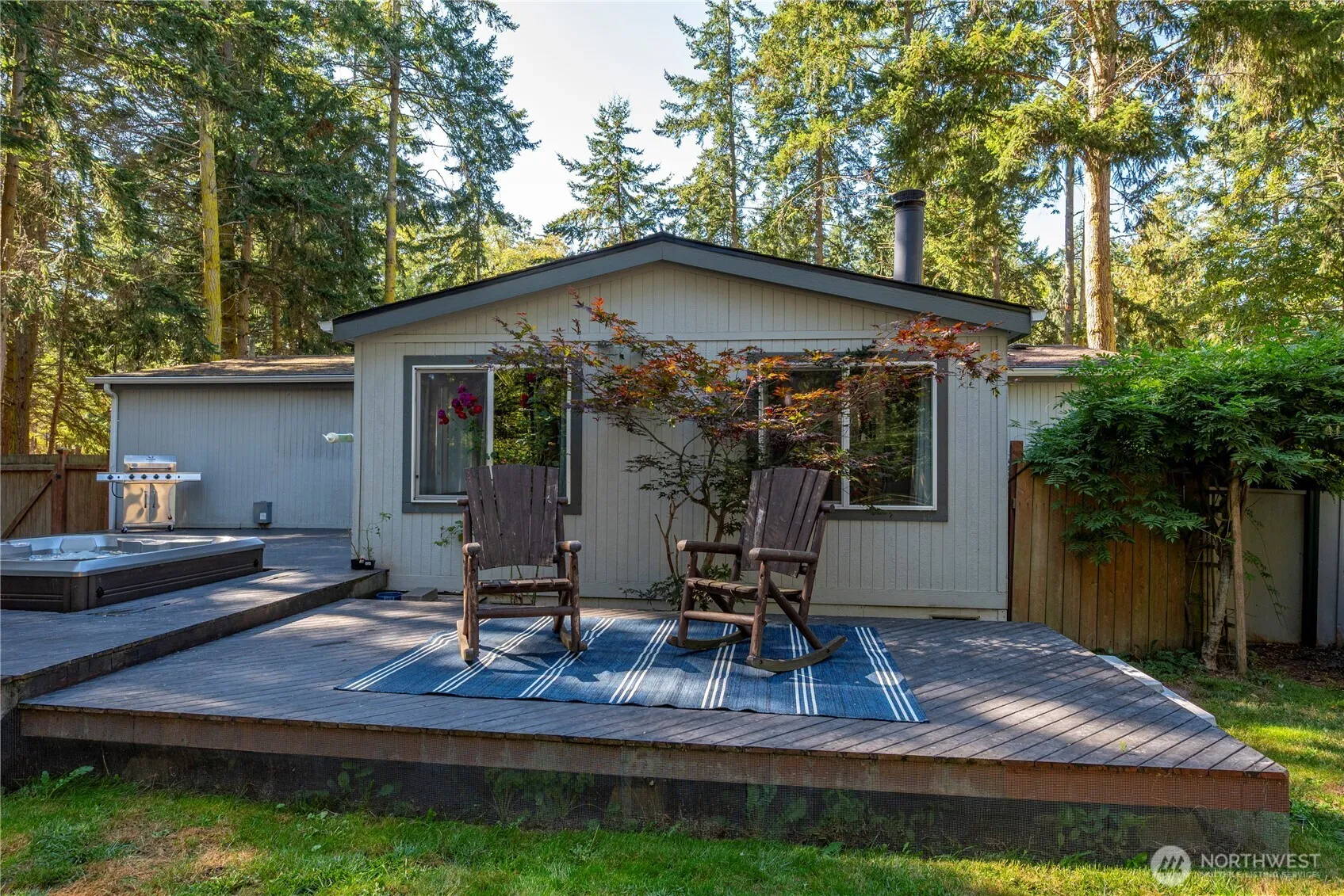 This beautifully maintained rambler sits on a spacious, park-like lot. The backyard offers privacy & serenity, featuring garden space, a fire pit, & 2 versatile outbuildings-one large enough for a workshop. Enjoy outdoor living at its finest with a generous back deck for entertaining & a hot tub to unwind. The yard provides space for playing, planting, or relaxing. Step inside to discover a bright/open floor plan designed for comfort & connection. A wood-burning fireplace invites you to gather & stay warm or cool. The primary suite is situated separately from the other bedrooms featuring 5 piece en suite bathroom. Owner replaced Washer & lights with LED lights. Access to private community beach, seasonal pool, clubhouse, & athletic courts.