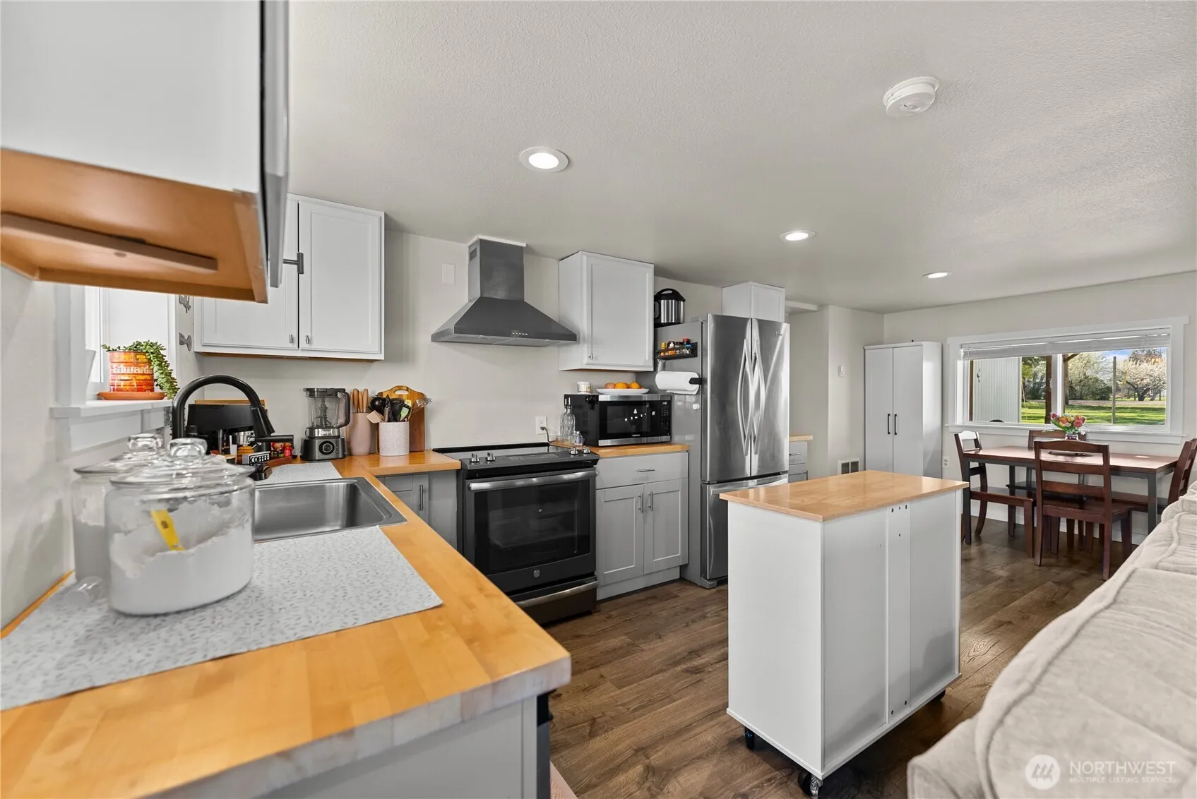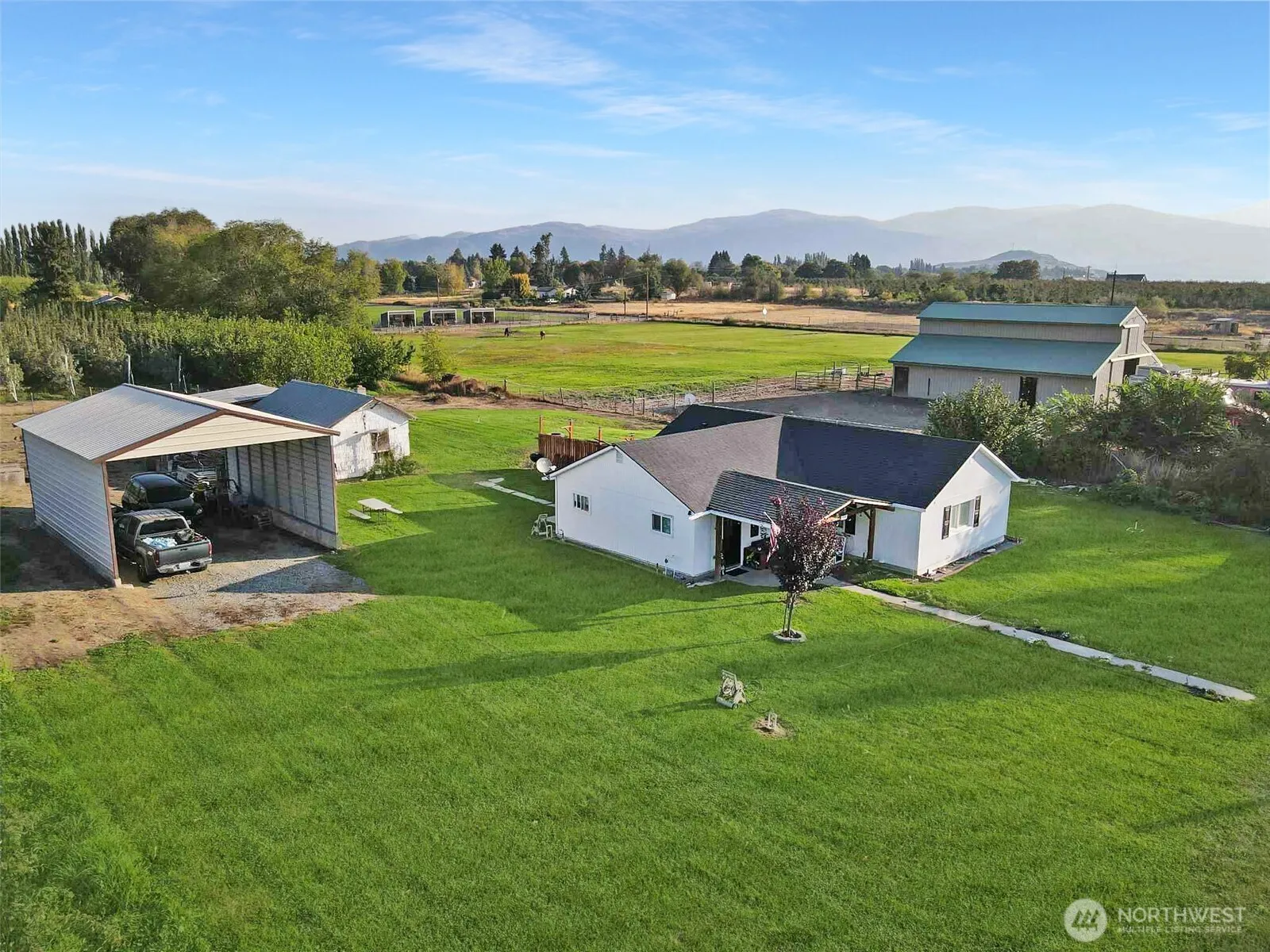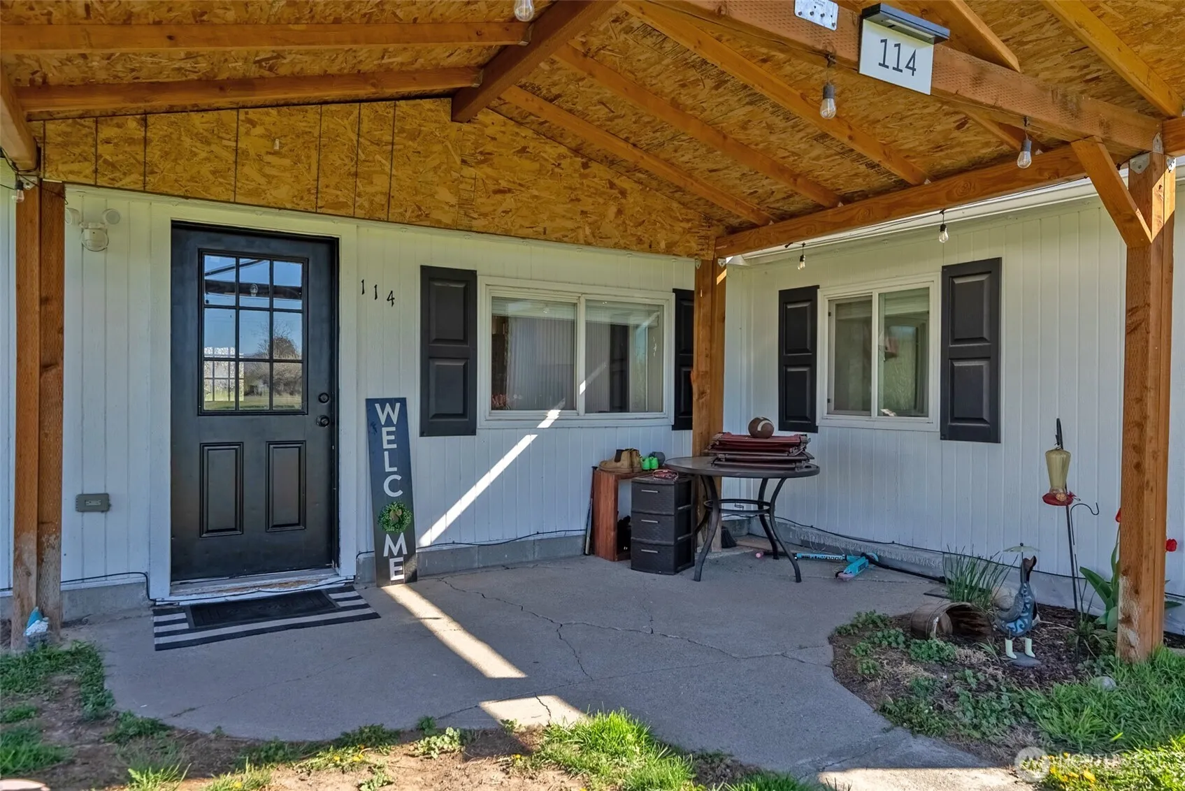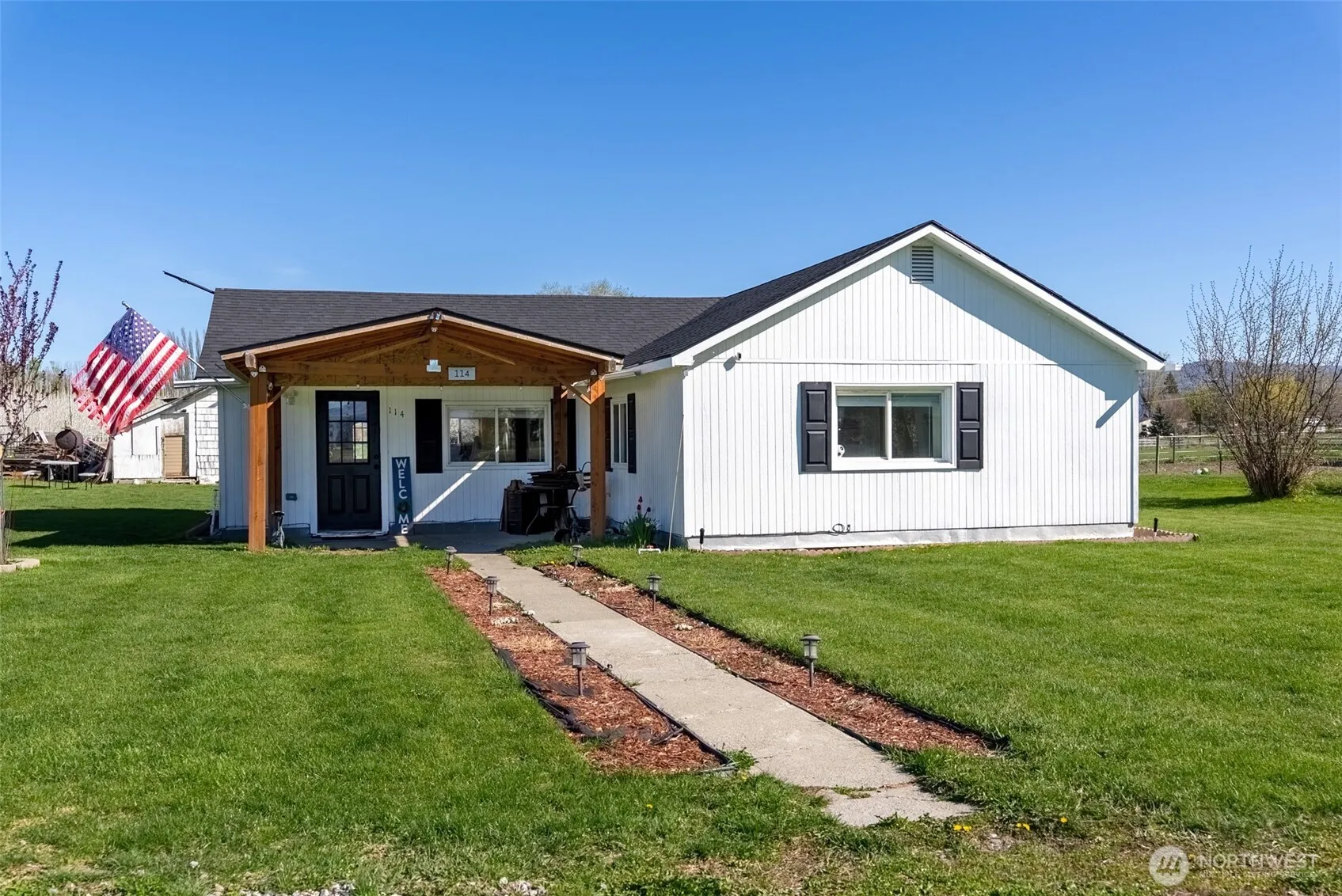 Welcome to this timeless, updated farmhouse offering 3 bedrooms-1.75 baths on a lush, irrigated acre—perfectly blending farmhouse charm with modern convenience. 5 minutes to town. A covered patio entry welcomes you inside to discover newer stainless-steel appliances, butcher block counters, a private bath off the primary suite and tiled bathrooms, that elevate everyday living. The 1196 sq ft layout is efficient & equipped with laundry area & second bathroom off bedrooms. Outside, enjoy an oversized yard with a sprinkler system, two versatile outbuildings, a large carport & plenty of space to roam, garden, or entertain. This property is a rare find with room to grow, play, & relax in a peaceful country setting.