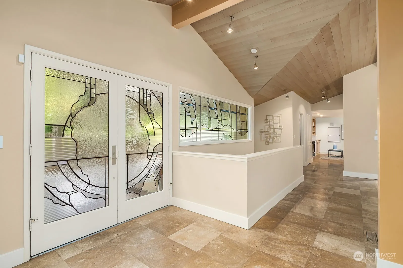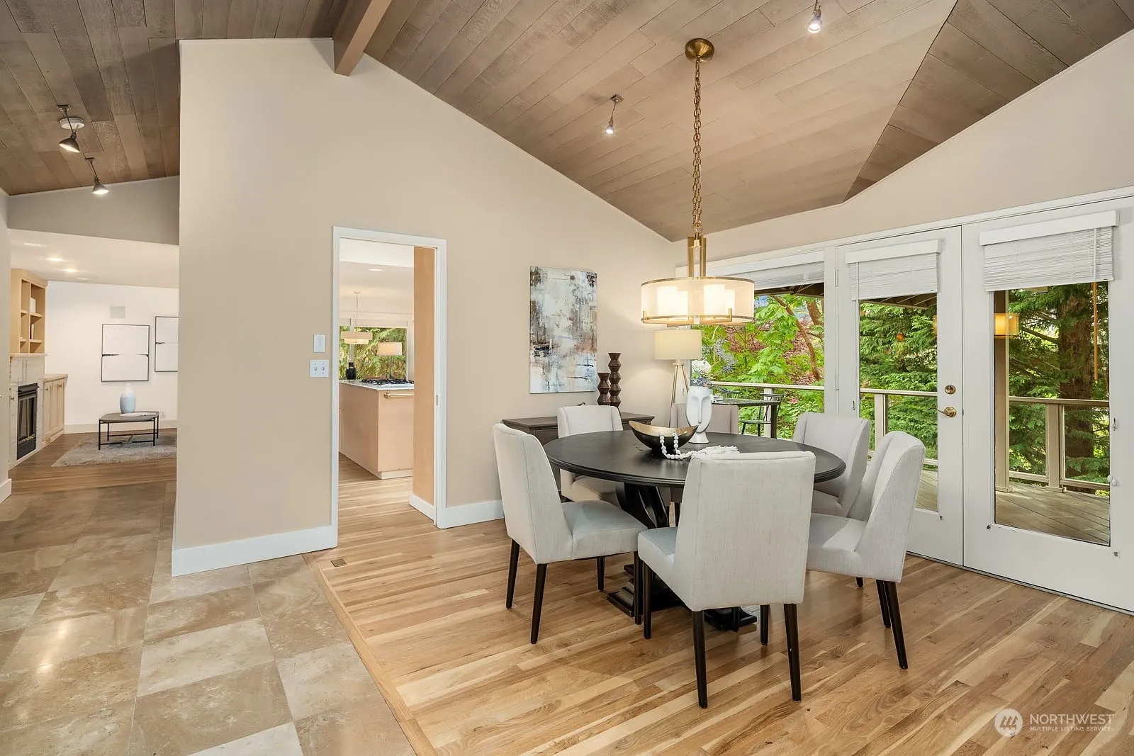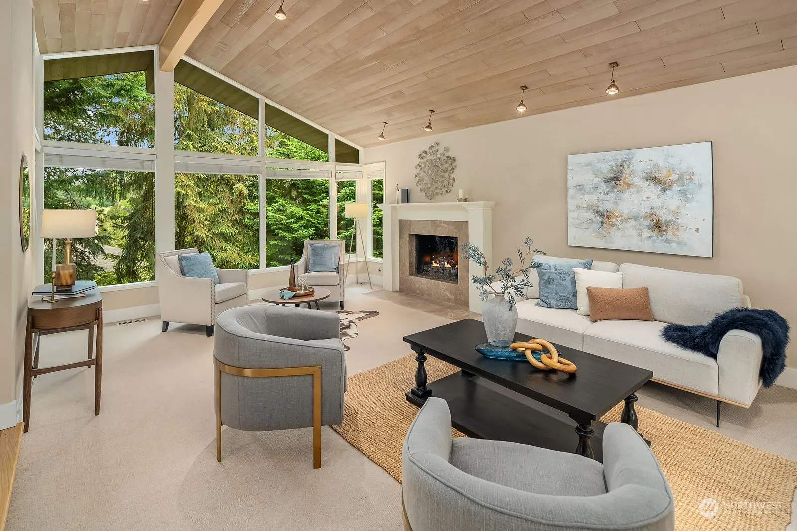 Experience the epitome of Mid-Century Modern elegance in this spacious, serene home. The circular driveway leads to a grand entrance, where you are welcomed by vaulted wood-clad ceilings and expansive walls of windows showcasing lush evergreen views. Sunlit rooms abound, including a luxurious primary suite featuring a gas fireplace and an expansive walk-in closet with a washer and dryer. The lower level boasts an oversized rec room, a kitchenette, and three generous bedrooms. Two levels of ironwood decks are surrounded by mature, beautiful plants, creating a private oasis perfect for relaxation and entertaining. One street to the Overlake Golf course, minutes to 520 & downtown Bellevue: comfort, convenience, yet all the serenity & privacy.
