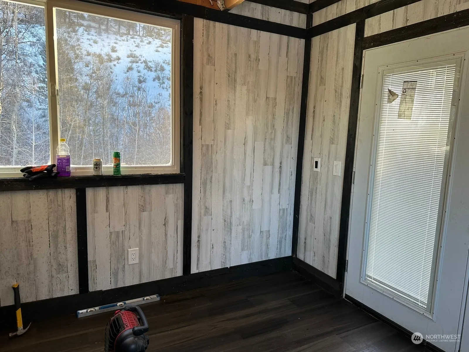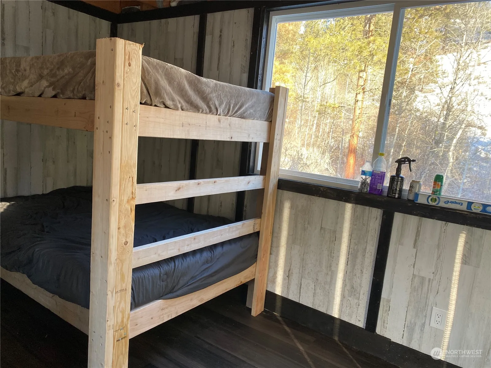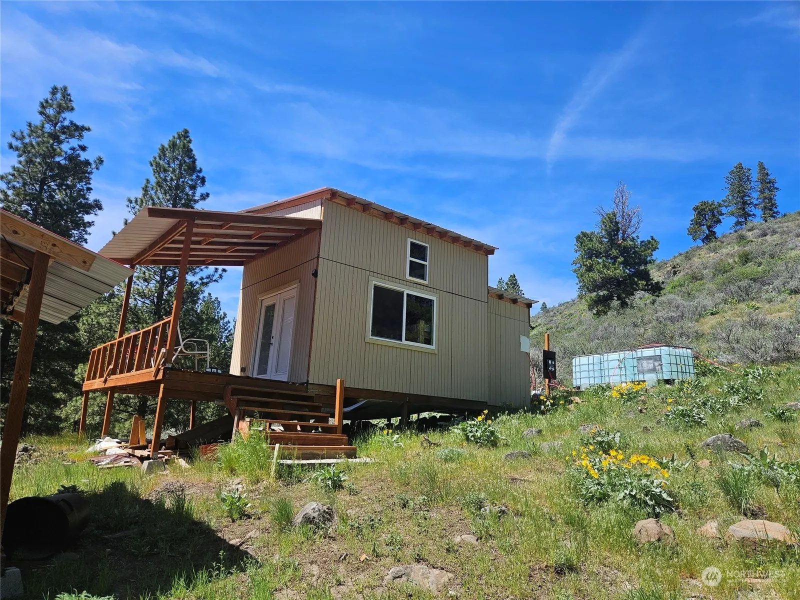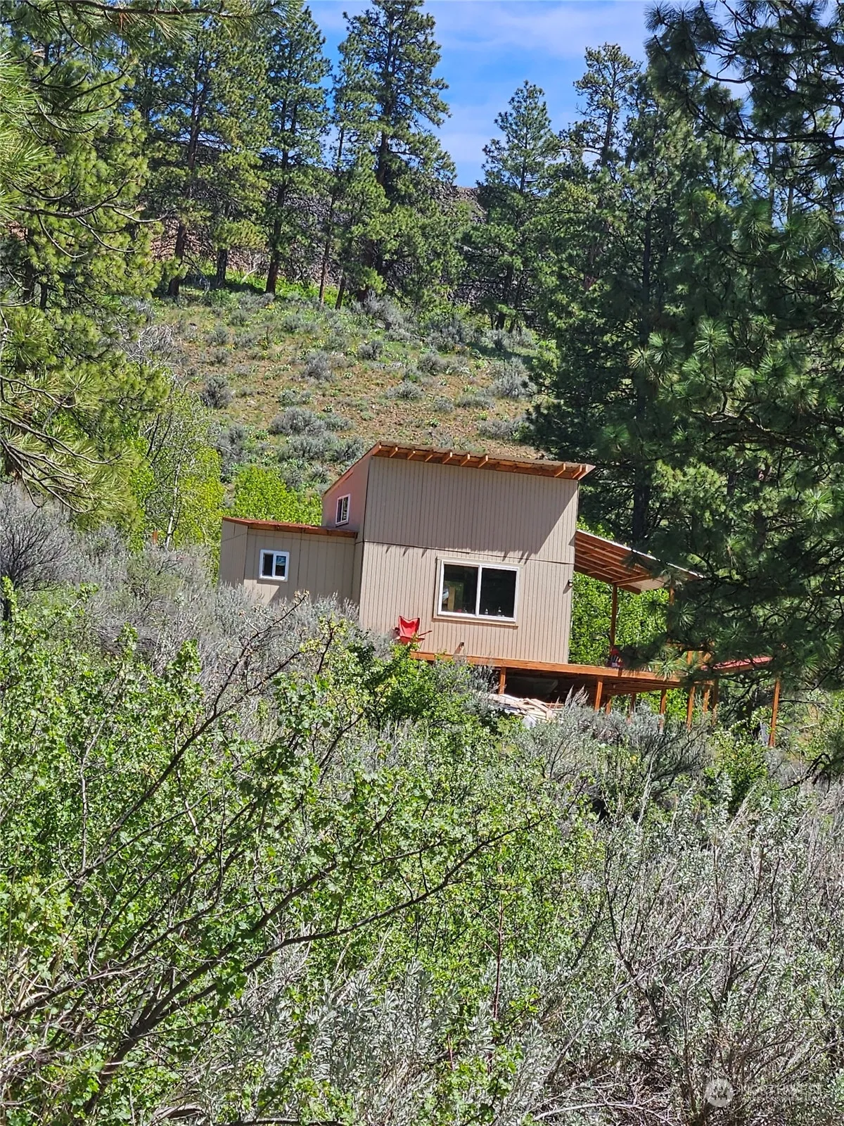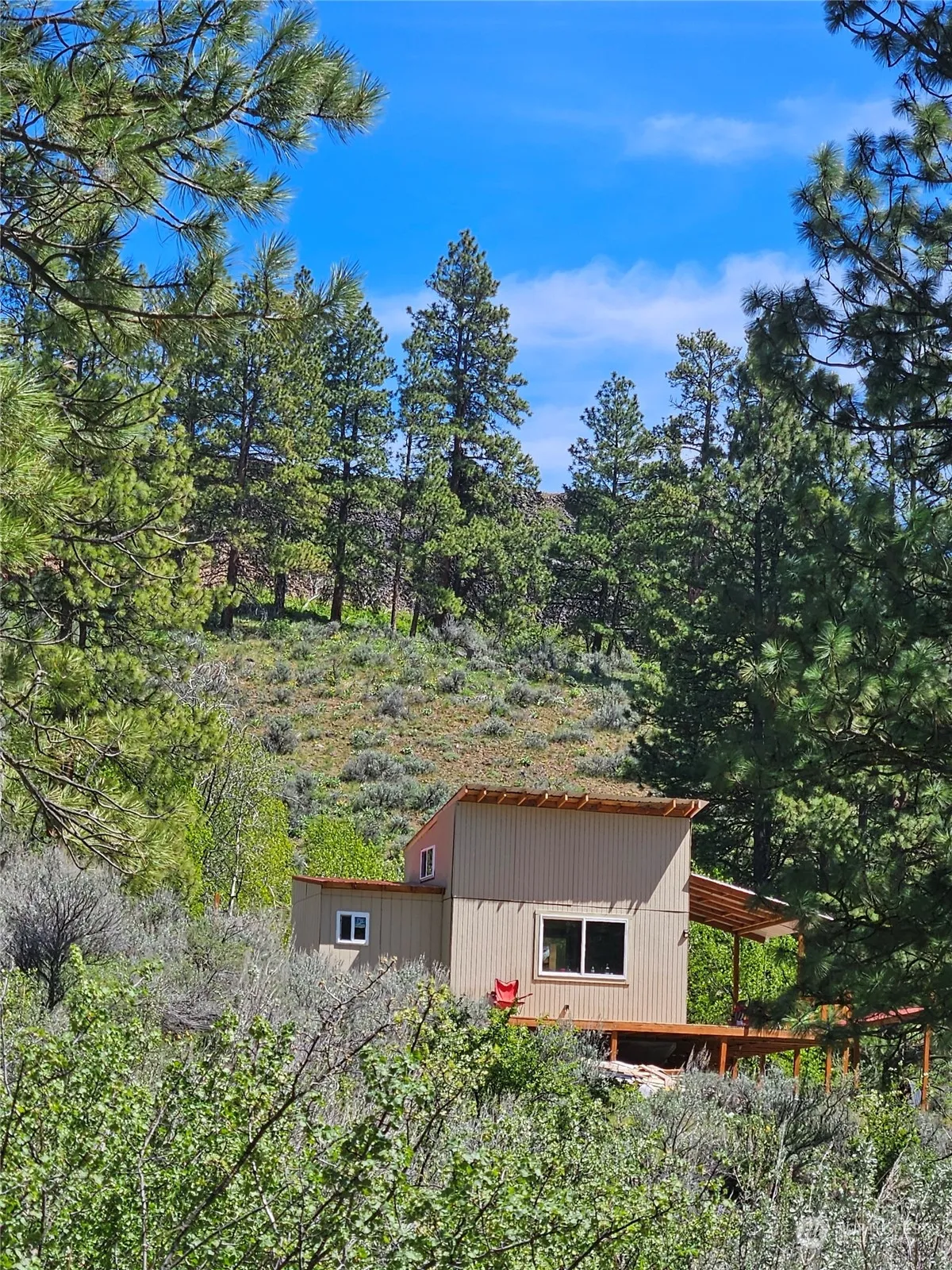 Rustic main building sits on over 11 acres of private, heavily timbered land with seasonal creek running through it. Creek runs for about 5 months a year. Outdoor kitchen area covered by roof has gas BBQ, and sink that pulls water from a 1,500 gallon cistern. Pump from creek is used to fill cistern. Creek water is untreated so boiling water before consumption is advised. Main building fitted with solar panels that are wired to a battery bank. Main building is heated with portable propane heater. Separate storage building also on property.