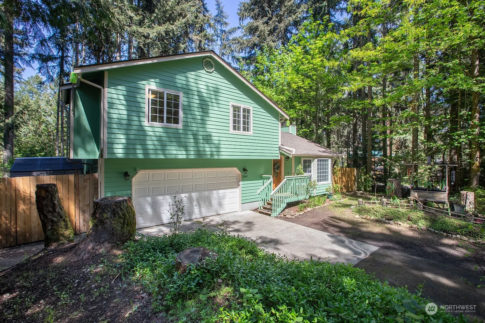 Freshly painted inside and out, well-maintained and move-in-ready 2-story Clearwood home on a large, partially-fenced corner lot nestled in the trees, with lots of extra parking (flattest driveway in the neighborhood). Three large bedrooms up, including spacious master en-suite with walk-in closet. New kitchen vinyl flooring, new toilet in hall bath, plus huge storage shed, massive dog run and/or RV parking space. Relax in your peacefully quiet backyard surrounded by tall trees. One of the PNW’s most beautiful and friendly gated communities, featuring 3 lakes, 6 beaches, heated pool, tennis/pickleball, playgrounds, docks, boat launch, miles of trails, and so much more! HOA dues paid through 2024. Extra refrigerator included in sale.