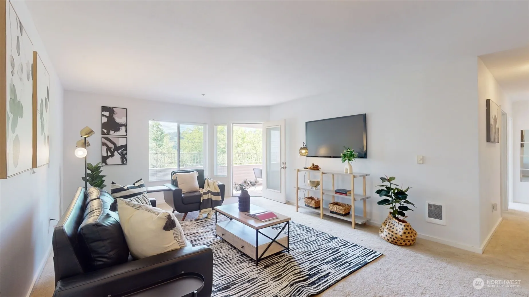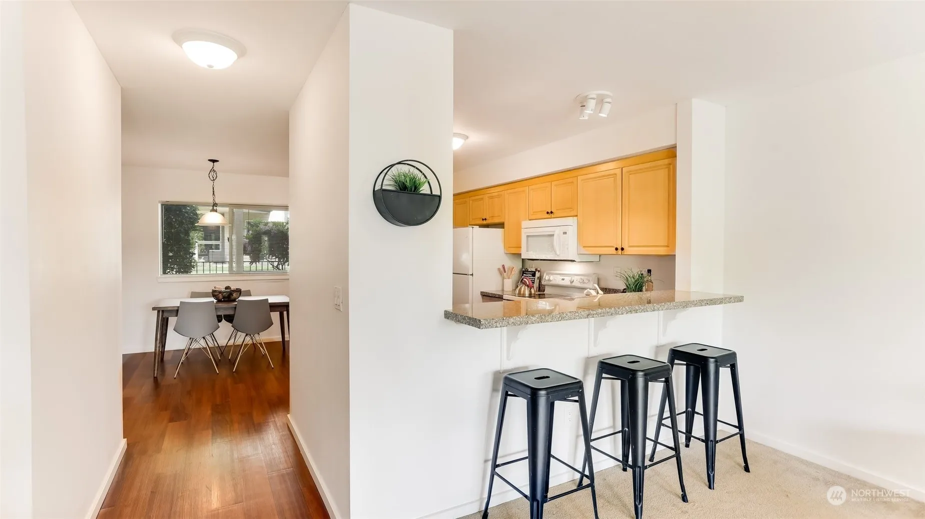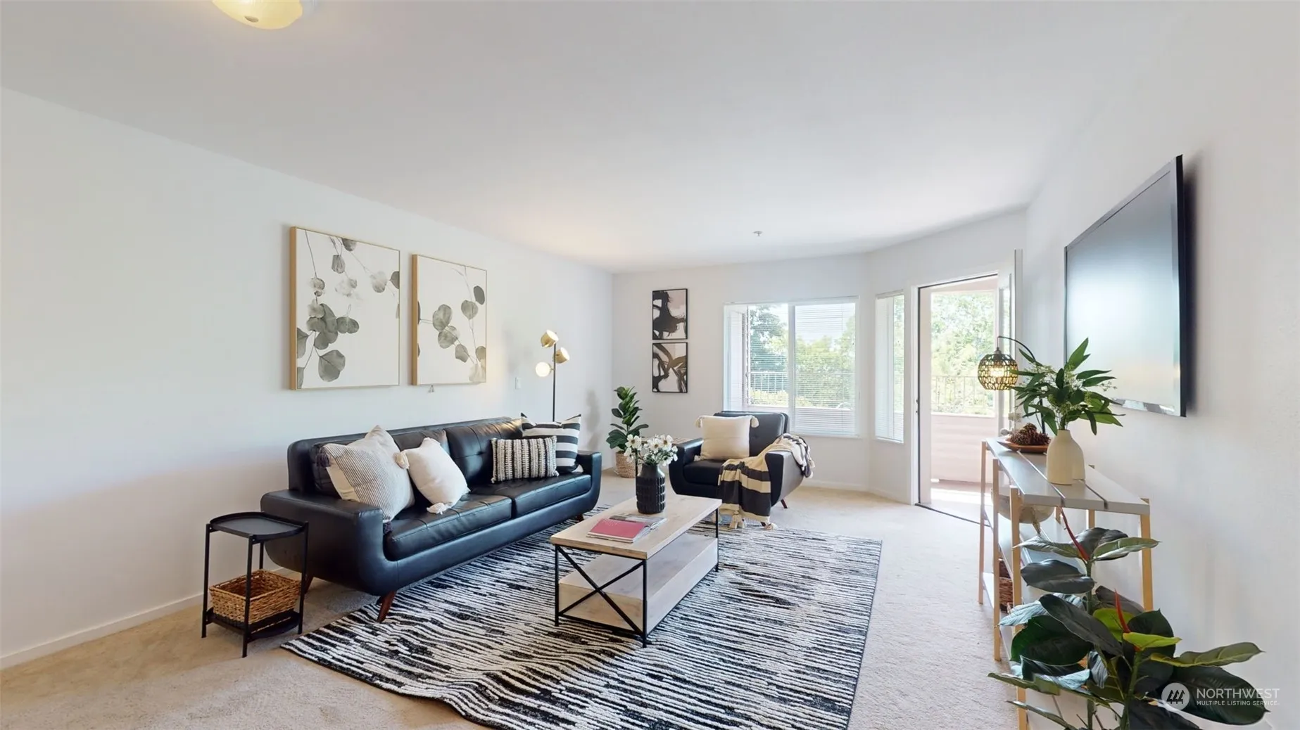Welcome to The Peaks! This darling condo situated on the 2nd floor adorns an extended balcony overlooking tree lined views. Enjoy peace of mind w/2 covered & secured parking spots & lobby entry. Enter the unit to beautiful laminate floors & plenty of storage! Living rm is open to kitchen w/bfast bar seating & direct access to the balcony. Kitchen offers plenty of cabinet & counter space, rm for dining table & window for natural light. Enjoy 2 bedrooms, one currently set up as an office w/full guest bath across the hall. Primary suite is spacious & features 3 closets, 3/4 bath en suite & direct access to the balcony as well. Conveniently located near freeways w/easy access to Seattle, Bellevue, SeaTac airport and local shopping & dining.