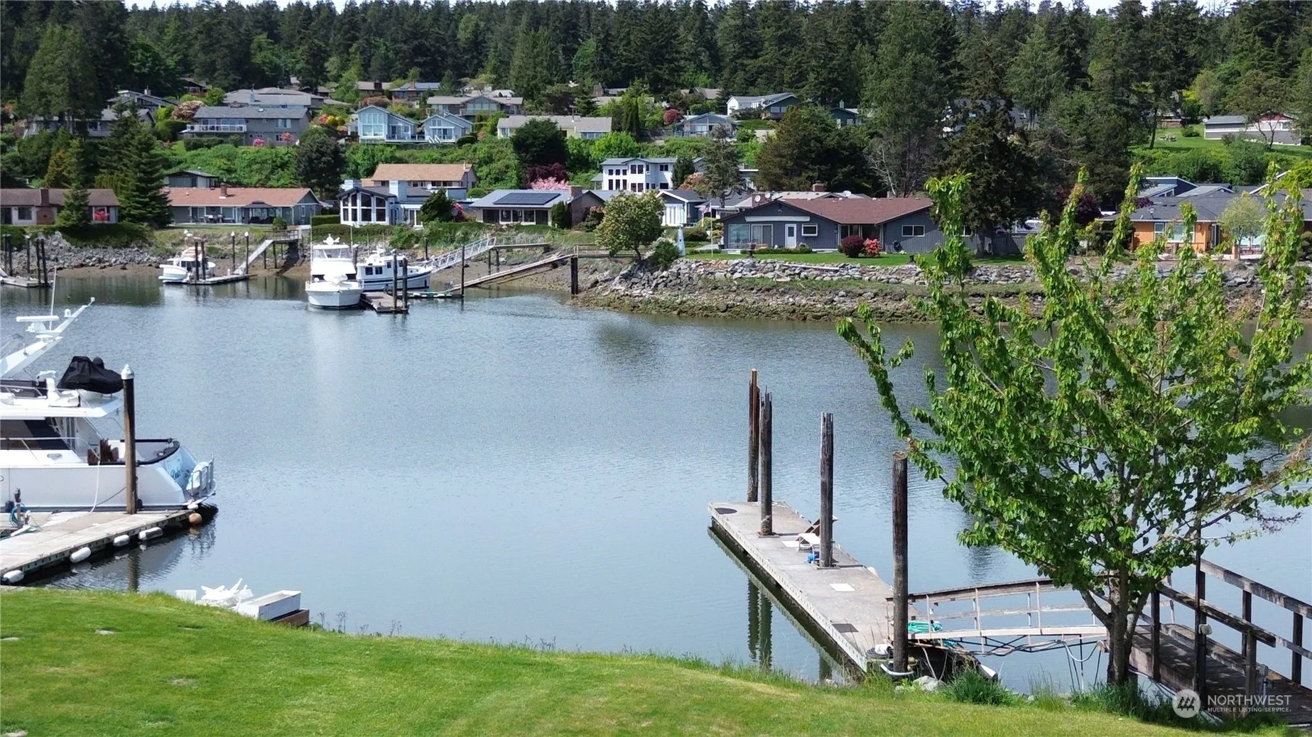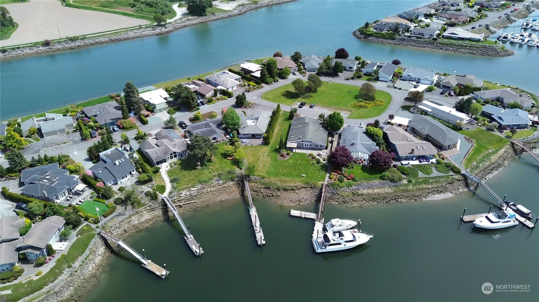 Live the ultimate lifestyle with Rare 60 ft Concrete private shared Dock with power and water, easy navigation for large boat ingress & Egress.Waterfront single level home positioned with exceptional bay views and sun exposure. Easy care 3 bedroom 2.75 bath home with spacious layout of 2246 sq ft. 2 Primary bedrooms, Living room, kitchen, hot tub & large patio with level lawn area all face the water & the concrete dock. This home is positioned so it stays sunny, warm & bright during the winter. Large laundry room, & an adjacent bonus room. Generous off street parking.Wonderful community for an active lifestyle, biking,swimming, boating & other water activities. Community park across the street, Pool, tennis,Pickle ball & Golf, enjoy!
