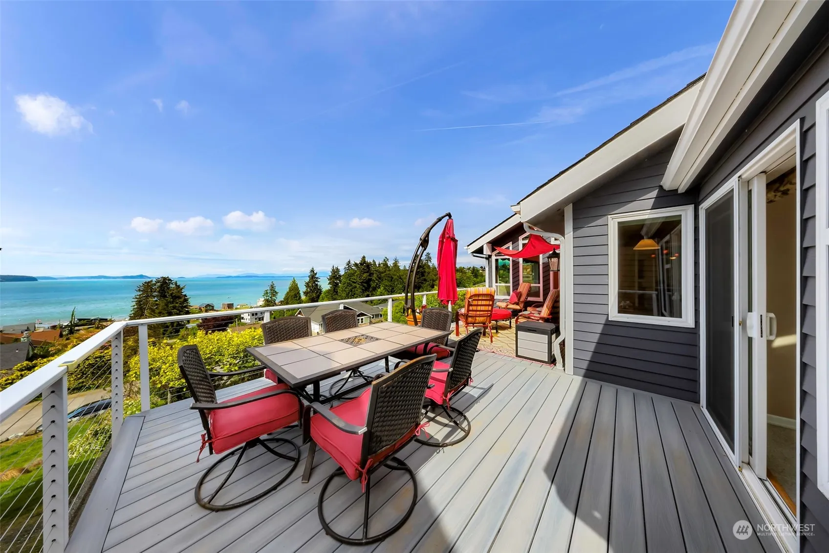 From atop the Utsalady hillside enjoy panoramic 180degree Skagit Bay views throughout your home! Main floor features vaulted living room w/ exposed beams & large windows w/ walk out to -new- front deck. Primary suite w/ view, spacious closet & en suite bath. Kitchen w/ large island space & hide away wet bar & extra cabinets. Bonus room could be second living room, dining room. Upstairs find large loft area & 2 giant attic storage areas. Fully finished basement features ADU w/ kitchenette, large bedroom & 3/4 bath. 2 car garage w/ EV charger & shop space & dedicated RV/boat parking space. Professionally landscaped backyard w/ patio for entertaining & Jacuzzi hot tub. Home fully heated by 2 gas fireplaces. Community beach access 2 blocks away