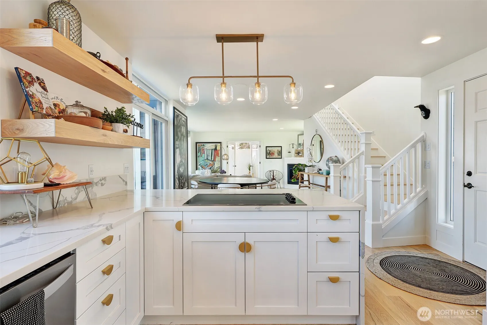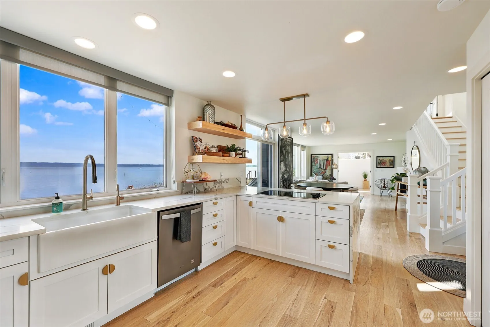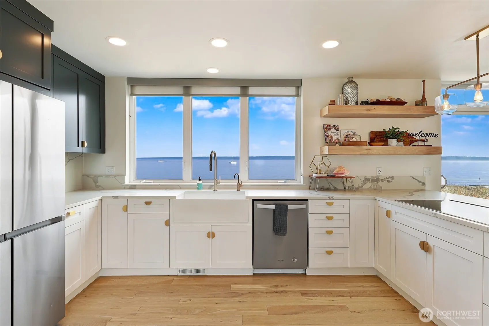 Double waterfront with views for days. Modern elegance meets coastal vibe. This lightfilled and newly updated home has floor to ceiling windows and features an all-new kitchen, bathrooms, laundry, with new custom hardwoods throughout. Upstairs you’ll find a spacious primary suite with private balcony and high ceilings, huge second bedroom, and a versatile bonus area. All custom closets. And water! 200 ft of waterfront: 100 feet of bulkhead beachfront with views of the shipping lanes and mountains + an additional 100 ft on the lagoon for stunning sunsets. Watch whales, seals, otters, birds, and kayakers on the daily. Ample parking for 6. Experience a vacation-like atmosphere every day!