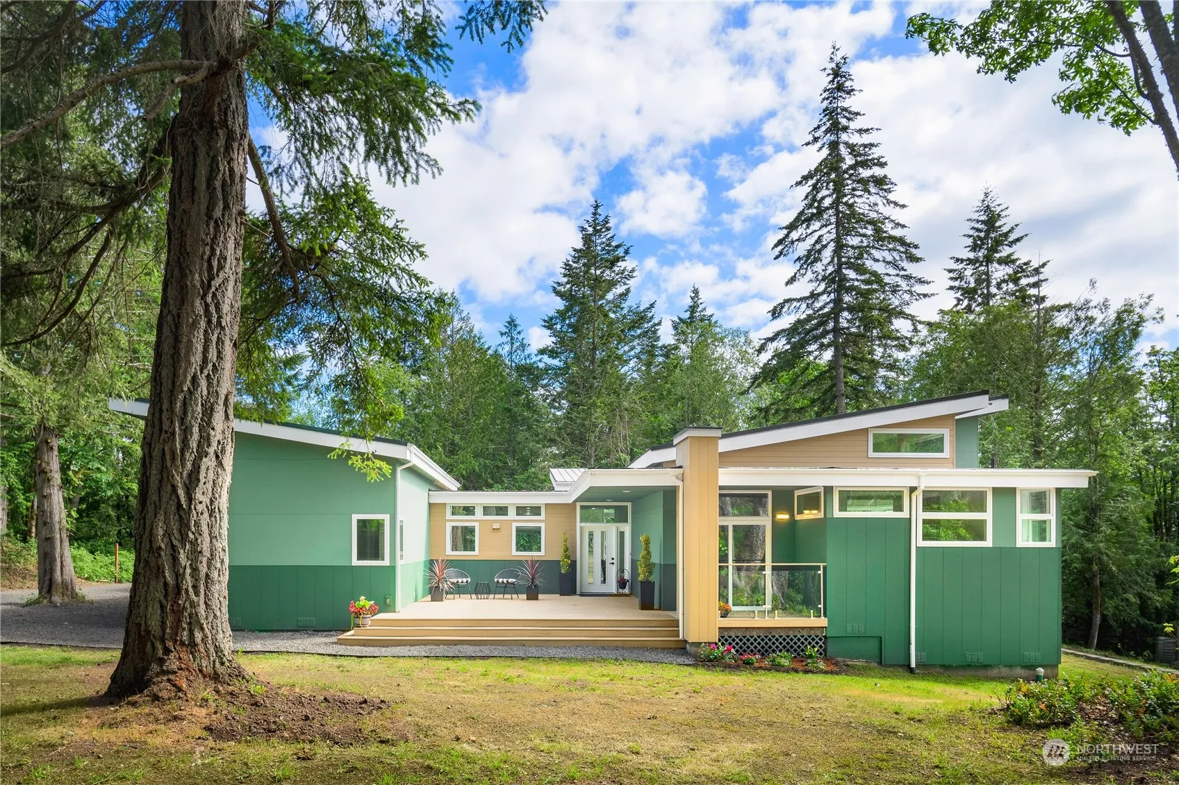 A Private Retreat on the Island’s South end, offers Modern design w/4 BR on .81 Ac. & One-Level Living! Soaring ceilings & walls of windows flood the home w/light & partial Olympic Mt.views in a natural landscape w/rain garden. West wing Primary offers Mt.views, 4-piece spa bath & private deck. Cozy guest room/office w/separate 3/4 bath & deck. Sleek, Chef’s kitchen boasts quarts countertops, large island, ample storage & induction range.Open dining area w/built-in buffet & doors to south-facing deck ready for summer enjoyment. East wing w/2 more bedrooms share a 3/4 bath. Laundry rm w/utility sink & storage. Bonus room w/loft offers versatility:Yoga studio or use as garage? You decide! Minutes to Fort Ward Park & Trails, & Lynnwood Center!