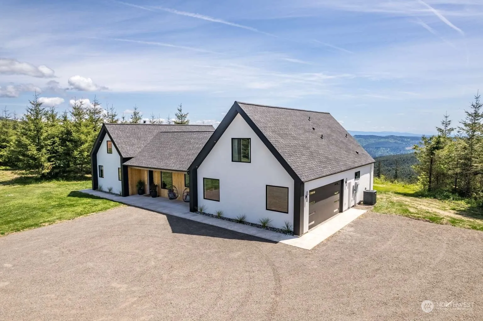 This stunning ranch style home located in Woodland, Washington was built in 2022, and offers a spacious and modern living space. Gated community. This home features views into the Lewis River Valley, Mt Hood, & Mt Jefferson from almost every window. Cozy open concept living with laundry and primary suite on main floor. The kitchen features quartz countertops and European finishes. The large master suite has a walk-in closet & a heated tile bathroom with double vanities. Two bedrooms & full bath on the second level. Timber frame covered patio to enjoy views & entertaining. This flat 2.5 acre lot has ample parking and outdoor yard areas. Traditional Finnish sauna building with firewood storage.