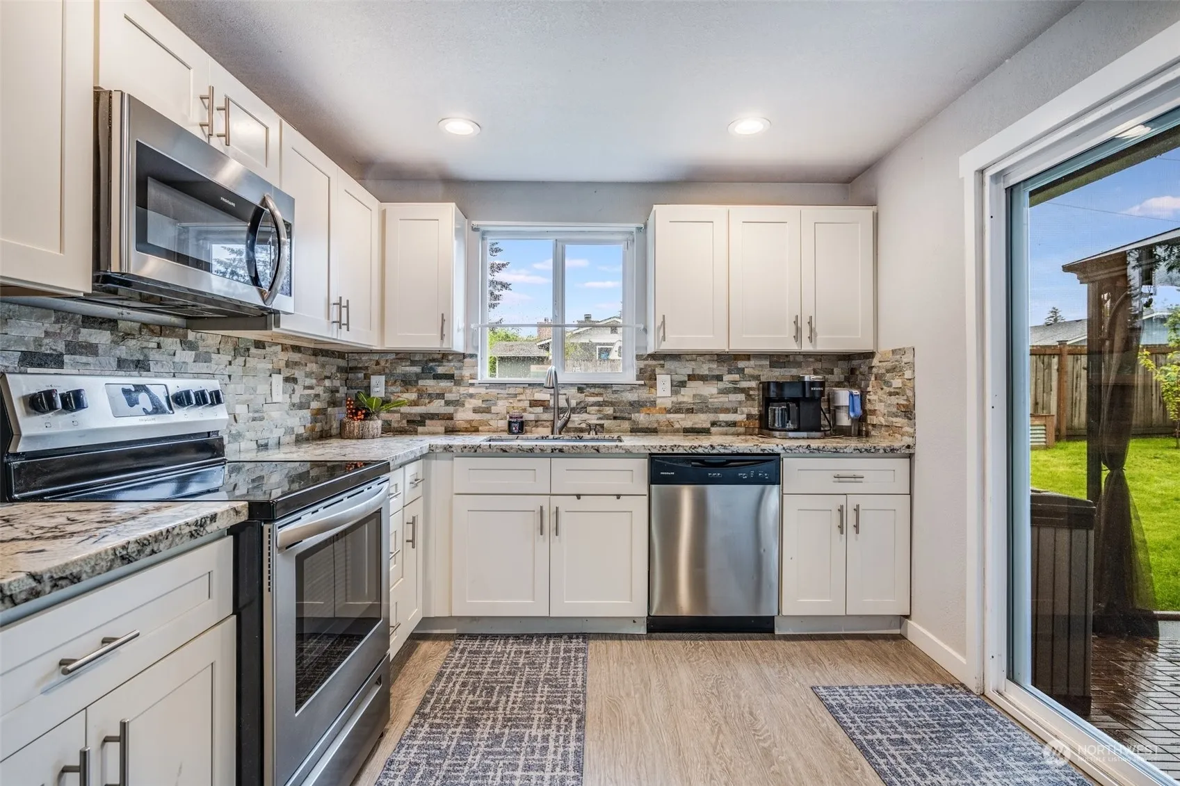 Welcome home to convenient single story living on a large lot! With four bedrooms this home allows for an extra office space and room for everyone to spread out. The many white vinyl, insulated windows reflect light off of updated floors, bathrooms, and kitchen cabinets and counters. Ceiling fans stand ready for your use in each room. Relax in the living room with the fireplace on, or walk through the sliding doors out onto the gazebo covered patio or raised deck to lounge, cook, and entertain. This home and setting exudes pride of ownership. Big ticket item newer roof will give you peace of mind for years to come. Come and see!