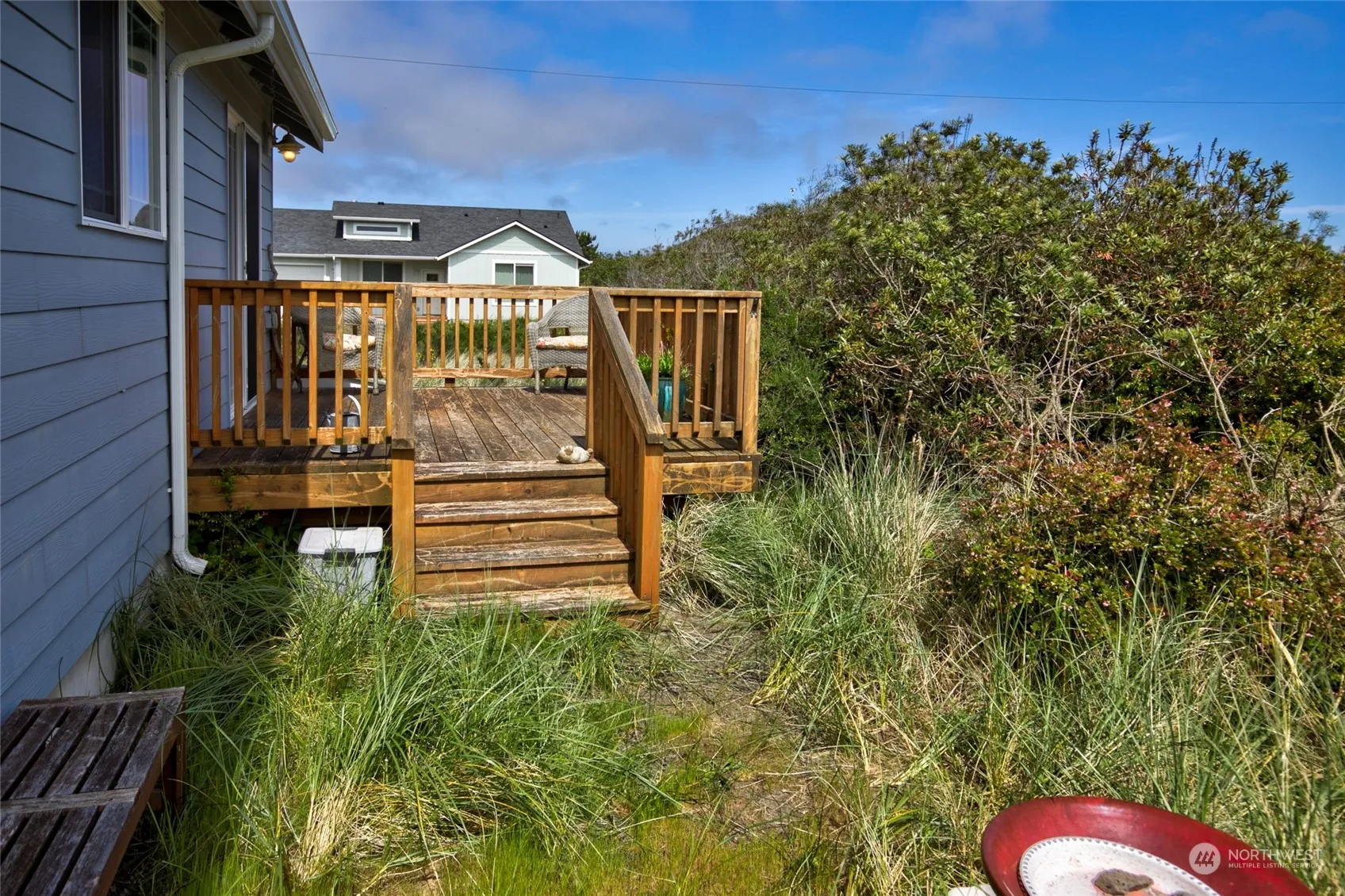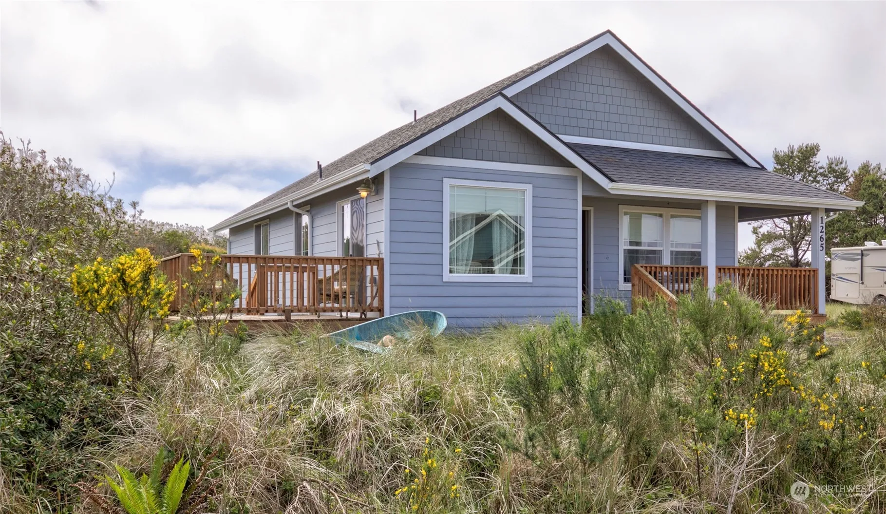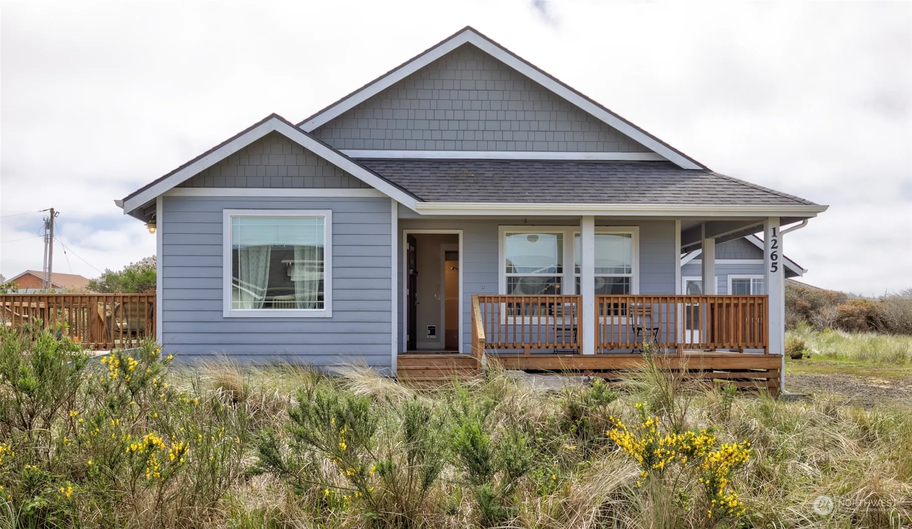 Super cute beach cottage, nestled in dune grasses, is located just a few blocks from walk on beach access! This 2BR/2BA home was built in 2016 by a local, premier builder & offers custom cabinets & counter tops, island kitchen w/SS appliances. Great room has a electric, stacked stone fireplace, laminate flooring, vaulted ceilings. The dining room has slider to the spacious deck. Primary bedroom has full ensuite bath & walk-in closet. There is a good size utility room, covered front porch & a matching 10′ x 12′ shed with power. Home is close to all the amenities of the Village at Oyhut Bay. In the Community Club. This home is perfect for a beach getaway or living full time!