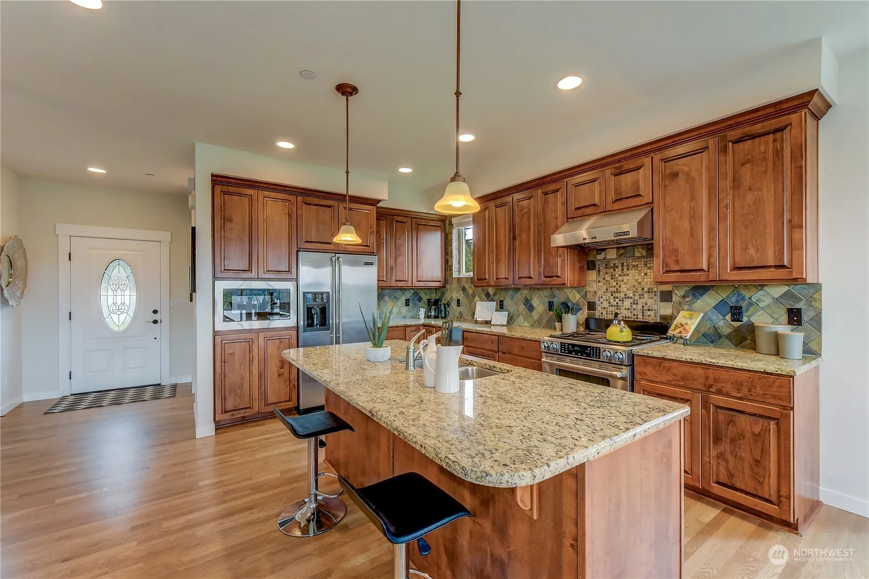 Chateau Ridge offers a unique townhouse community where residents own the land. It sits up on the ridge above all the wineries with amazing views of Mt. Baker and the Woodinville Valley – you can hear the concerts at St Michelle from the deck. This end unit is flooded with light, featuring vaulted ceilings, newly refinished hardwood floors on the main floor, newer wood floors on the 2nd level, and A/C. Great Kitchen with granite counters and stainless appliances. Spacious primary suite with vaulted ceilings, walk-in closet and full bath. Plumbed for built-in vacuum. 2 car garage with storage room. Low HOA dues covering yard maintenance for a carefree lifestyle.