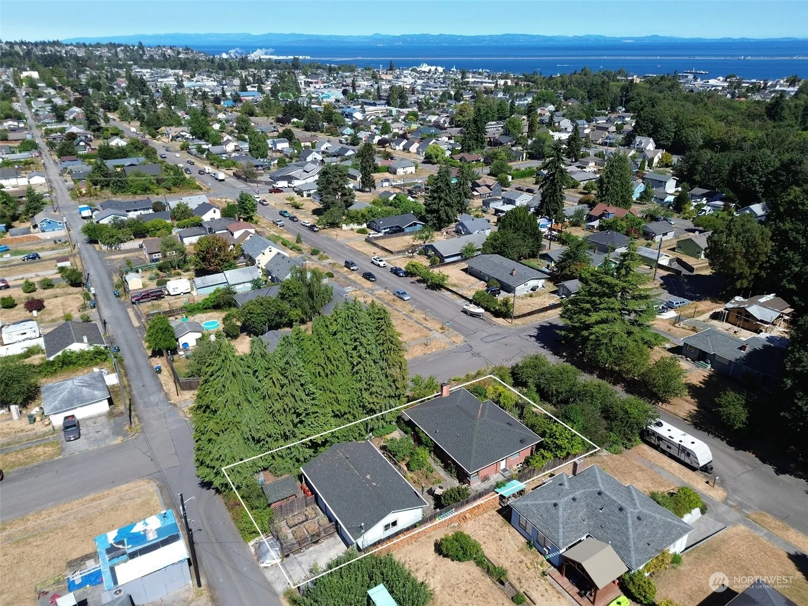 Take in the water views from the picture windows in the living room, with a woodstove insert and Oak floors. The kitchen has a breakfast bar, pantry & pass-thru to the dining room w/built-in hutch. Two BR on the main level with cedar-lined closets and a full bath w/extra vanity and laundry chute. Lower level has two BR, 3/4 bath, library, laundry rm w/utility sink, extra freezer & pantry, 1-car attached garage w/storage. Patio in the fenced yard w/water feature & fruit trees. The 2-car detached garage features an office, half bath and workshop. Deck off the front of the garage to take in the garden area & private patio area. Lg corner lot, near the National Park visitor center & road to Hurricane Ridge. Property is fully fenced.