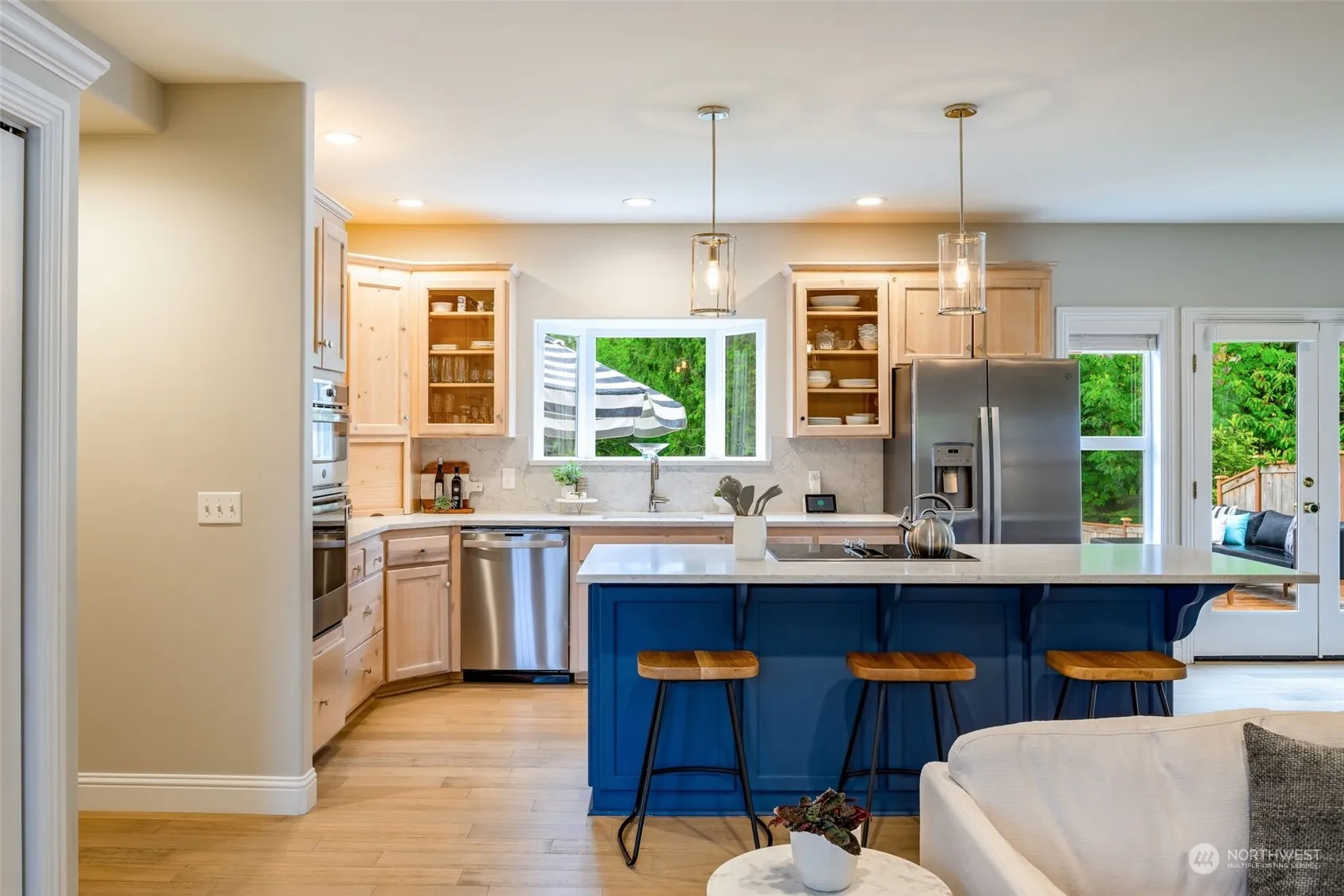 Coveted Cherry Ave. at Wing Point! Open concept kitchen flows into family room and breakfast nook, ideal for living & entertaining. Cozy up by wood fireplaces or step onto new sun drenched back deck. This meticulously updated home showcases new white oak floors, quartz countertops, designer fixtures, poured concrete driveway, decking and interior paint. Primary ensuite + two bedrooms upstairs. Dedicated main level home office for remote working. Expansive fully-fenced backyard + additional forested land creates a private outdoor oasis. Versatile bonus room above the garage offers endless possibilities. Steps to WP Golf & Country Club, 5 minutes to downtown Winslow, top-rated island schools and 30-min Seattle ferry. The sweet island life!