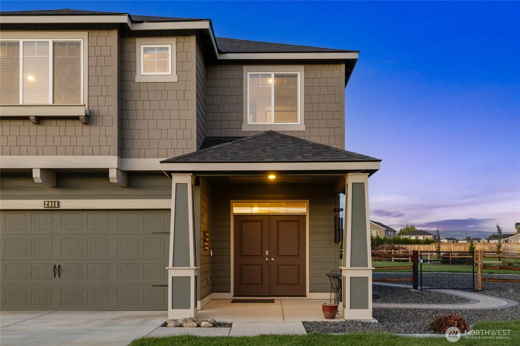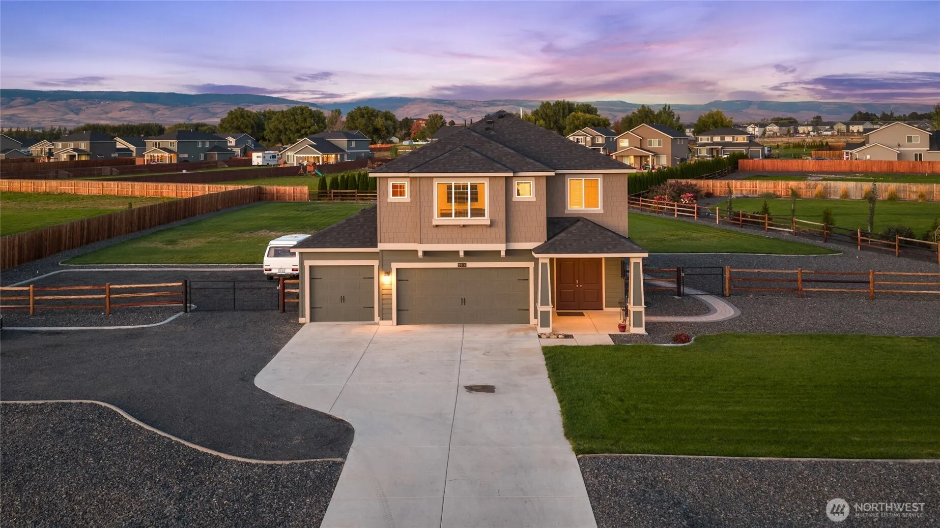Welcome to this beautifully maintained shy-acre property with custom landscaping and a fully fenced yard. A spacious 3-car garage and a covered back porch provide both convenience and comfort for year-round living. Inside, the open floor plan includes a versatile den or guest room with a full ¾ bath on the main level. The great room centers around a cozy electric fireplace and opens to the chef’s kitchen, featuring solid quartz countertops, stainless steel appliances, and soft-close cabinetry. Upstairs, you’ll find the primary suite with soaking tub, walk-in closet, and generous space to relax along with three additional bedrooms, a flex bonus room and laundry area. —New carpet to be installed in October. Close to recreational trails!