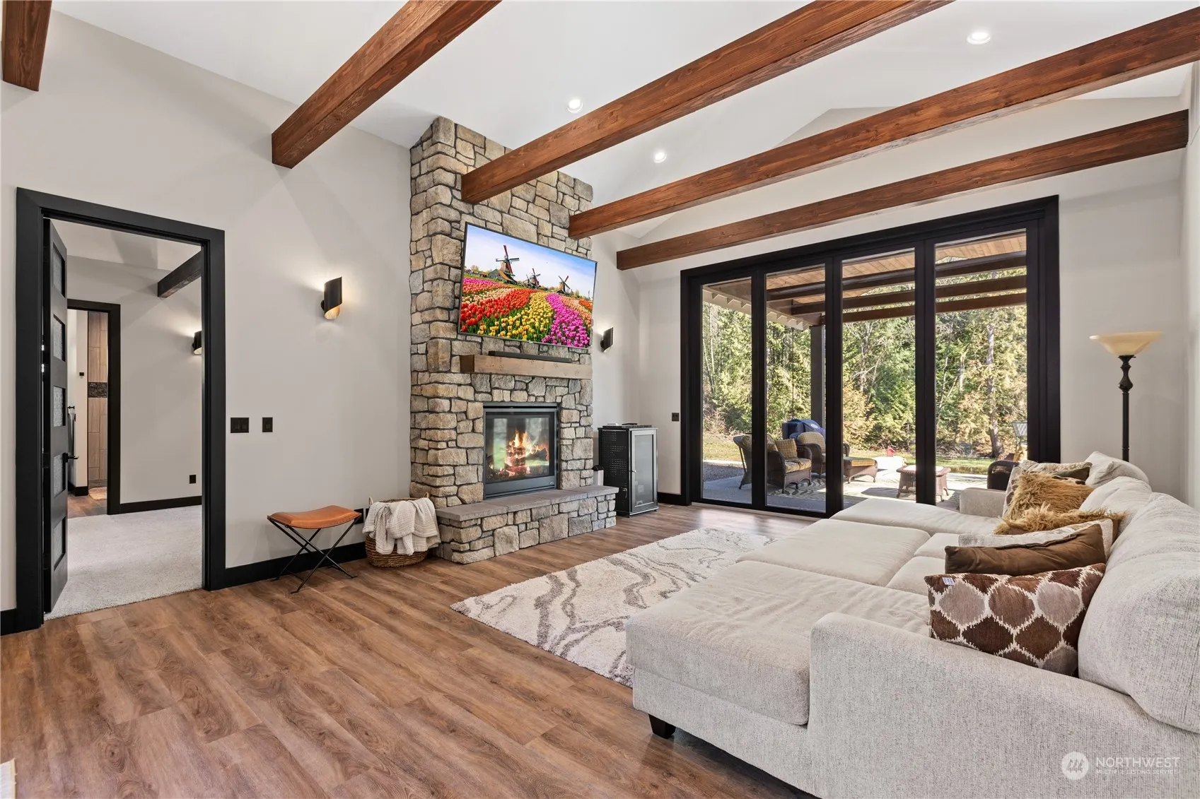 Exquisite custom home on 4+ acres near Lake Goodwin with abundant upgrades & meticulous craftsmanship. Features include custom steel & rain glass front doors, vaulted ceilings with exposed beams and dimmable LED strips, 3 stone fireplaces, and high-speed internet/cable wiring. Enjoy the 10’ panoramic doors opening to a covered patio perfect for BBQ overlooking the seasonal pond. The first floor primary bed boasts a cozy sitting area with fireplace, luxurious en suite bath with smart shower & soaking tub. Chef’s kitchen equipped with 4 ovens, commercial-grade appliances, built-in wine fridge and ample storage. European style fixtures & floating cabinets in each bath and a laundry with pet station. Welcome to your serene Lake Goodwin retreat!