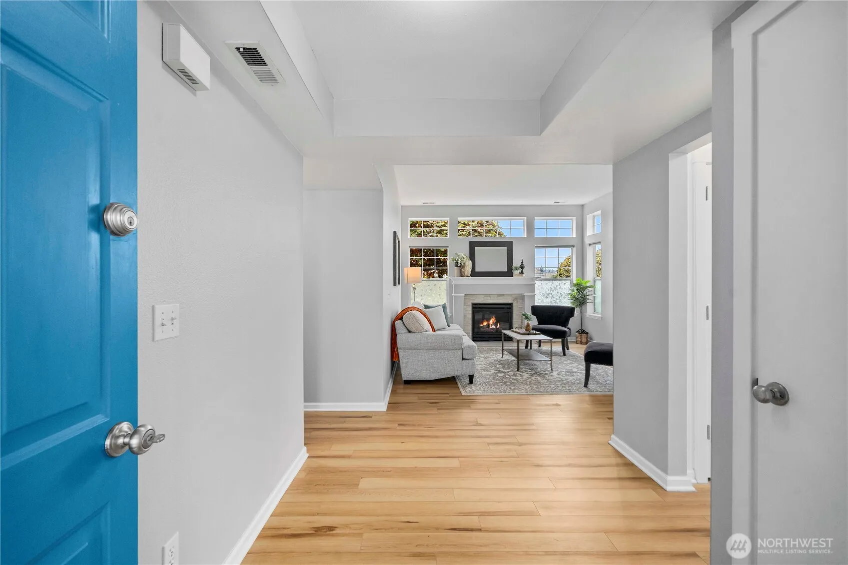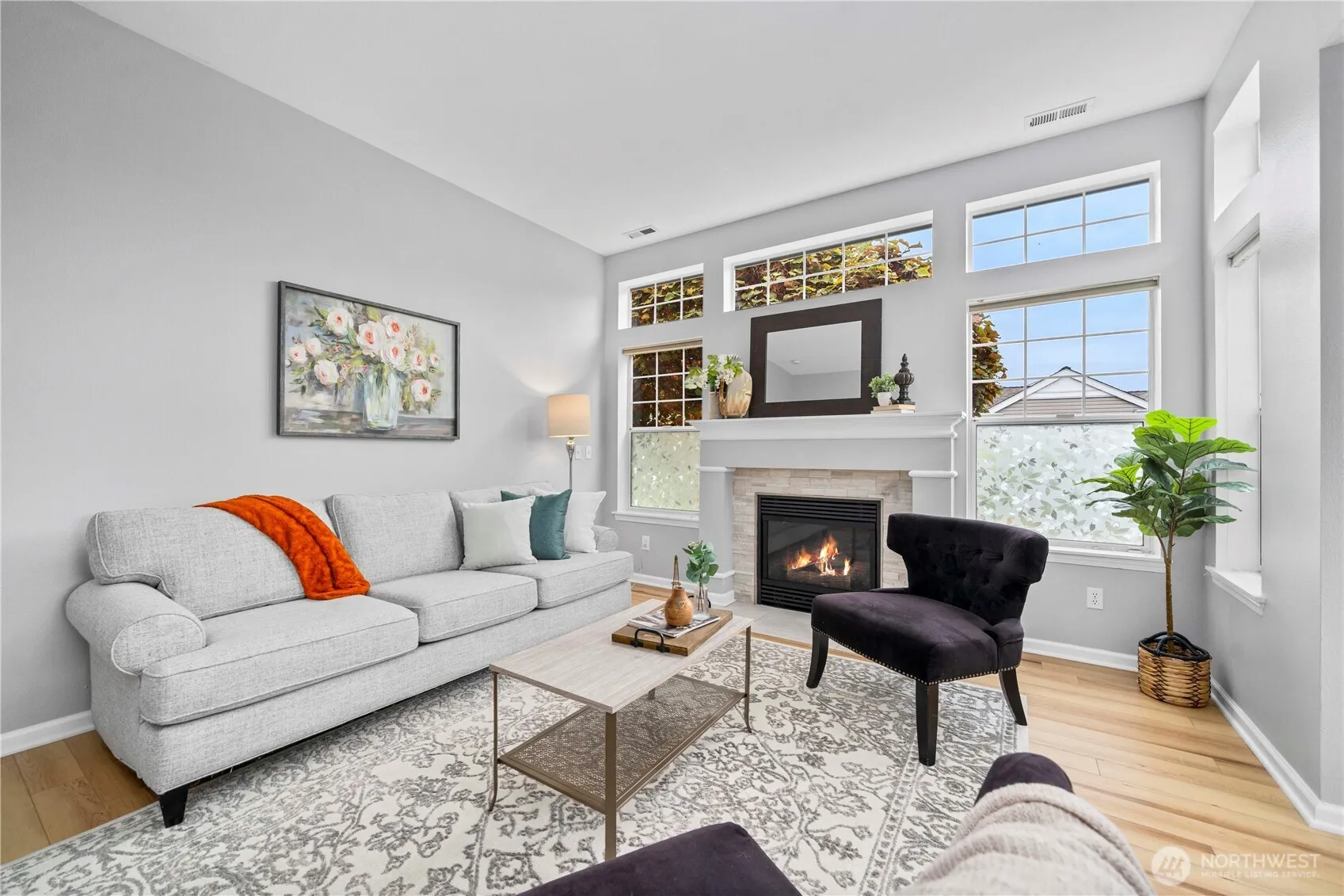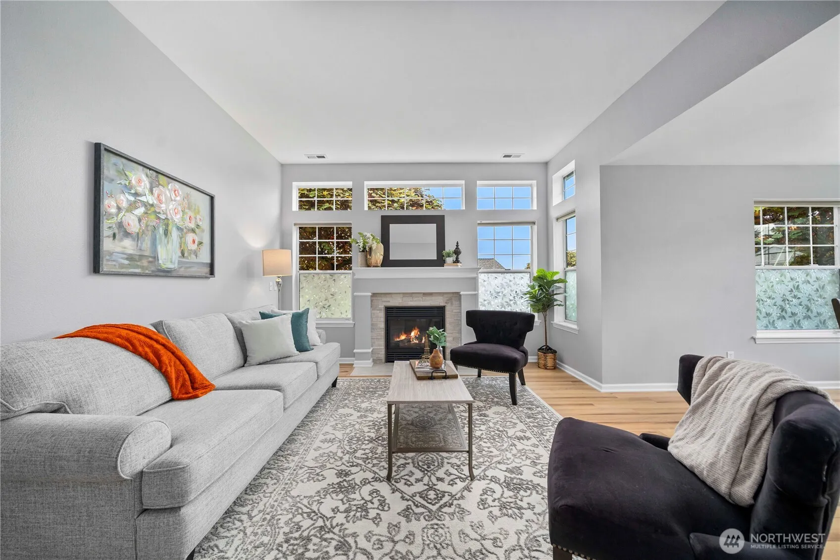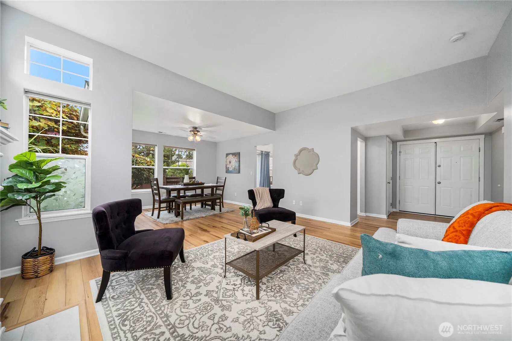 Lovely and bright Riverwalk! Detached rambler/condo, nice open airy floorplan with high ceilings. Newer easy care luxury plank vinyl thruout living area. Formal dining + kitchen nook. Nicely updated eat-in kitchen has smooth cook top stove/oven, microwave, Corian counters, stylish subway tile backsplash, newer light fixtures. Large primary suite w/walk in closet. Luxurious tiled ensuite bath and huge shower. Handy utility room w/cabinets. Fenced and landscaped backyard great for pets and outdoor entertaining. Sprinkler system, Central A/C. This community has walking trails along the Puyallup river. Easy commute to freeways.