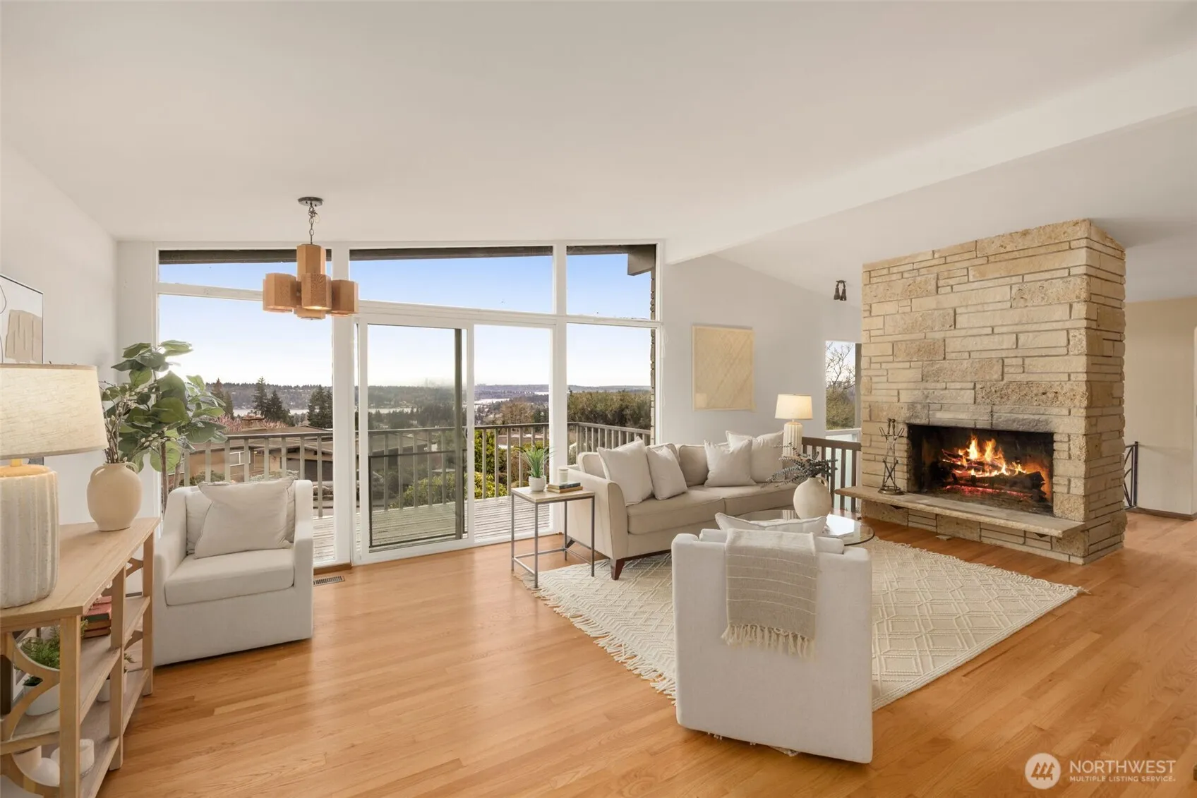 A rare opportunity in Bellevue’s Somerset community, this mid-century split-level home offers expansive views and future potential in a prime location. Take in panoramic vistas of Lake Washington, the Seattle skyline, Olympic Mountains, and Bellevue from the wraparound deck —creating a striking backdrop for daily living. The upper level includes 3 bedrooms and 1.75 baths, while the lower level provides 2 additional bedrooms, built-in storage, and a large family room with a mini bar for added versatility. A private back patio extends usable outdoor space, and the large yard presents potential for future improvements or expansion. Additional features include a full bath with a two-person jetted tub and sauna, a two-car detached garage, and ample parking with an extended driveway. Located minutes to I-90 for efficient commuting to Seattle and Bellevue, with nearby access to parks, Somerset Recreation Club, and local amenities. A compelling option for buyers seeking value, views, and location.