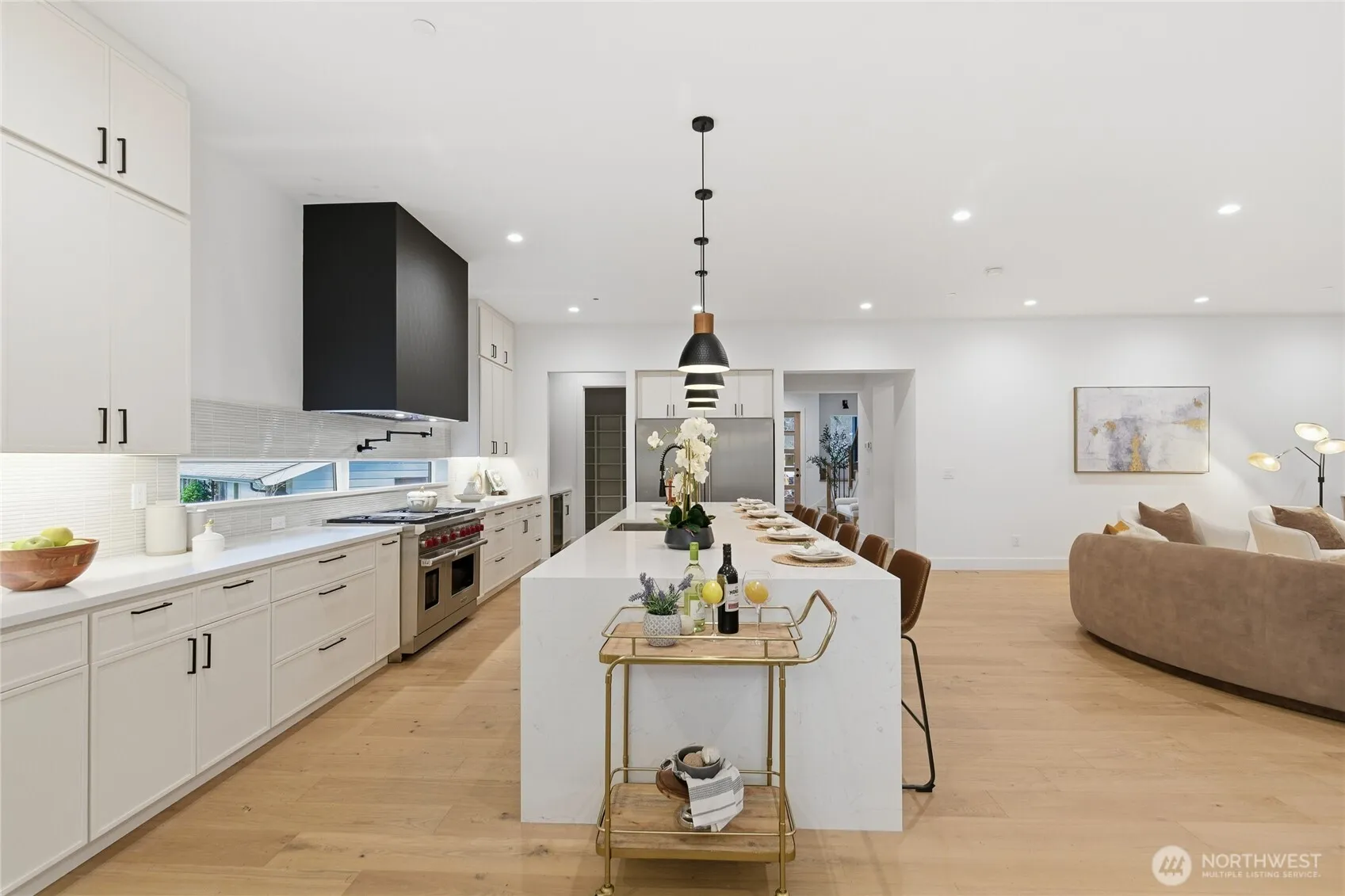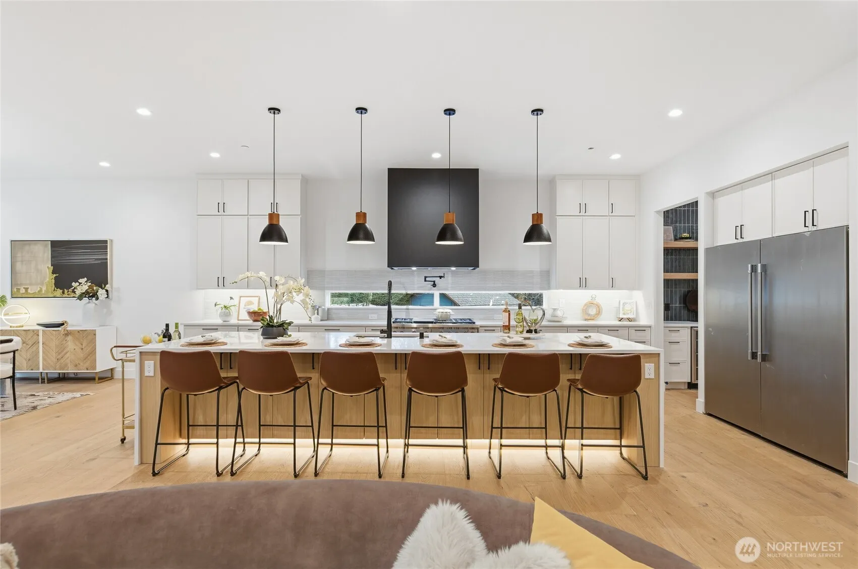 The home everyone’s been waiting for is finally complete along with a NEW PRICE! Discover refined luxury in this brand-new transitional modern estate by acclaimed local builder Specialty Design+Build. This meticulously crafted 5-bedroom plus office, 4.5-bath residence spans 4,190 SF on a generous 13,082 SF flat lot, featuring an exceptionally rare 950 SF four-car garage. Step through the entry into soaring ceilings and thoughtfully designed living spaces including a dedicated main-floor office and guest suite with private ensuite. The chef’s kitchen is the heart of the home, showcasing a dramatic 13-foot island, professional-grade 48″ Wolf gas range, and 60″ built-in refrigerator—a true entertainer’s dream. Retire to your expansive primary suite featuring a spa-inspired ensuite bath and an extraordinary custom walk-in closet (bedroom-sized!) with convenient direct laundry access. The dedicated wing upstairs offers two bedrooms sharing a versatile play room and ensuite bath. Seamlessly extend your entertaining to the spacious covered porch and generous backyard with multiple activity zones. Premium finishes throughout include wide plank engineering hardwood throughout the home (no carpet!), level 5 smooth drywall, heated bathroom floors, designer tile and custom millwork. Unbeatable Central Bellevue location with effortless access to parks and recreation, major freeways, premier shopping, leading tech campuses, and everything the Eastside has to offer.