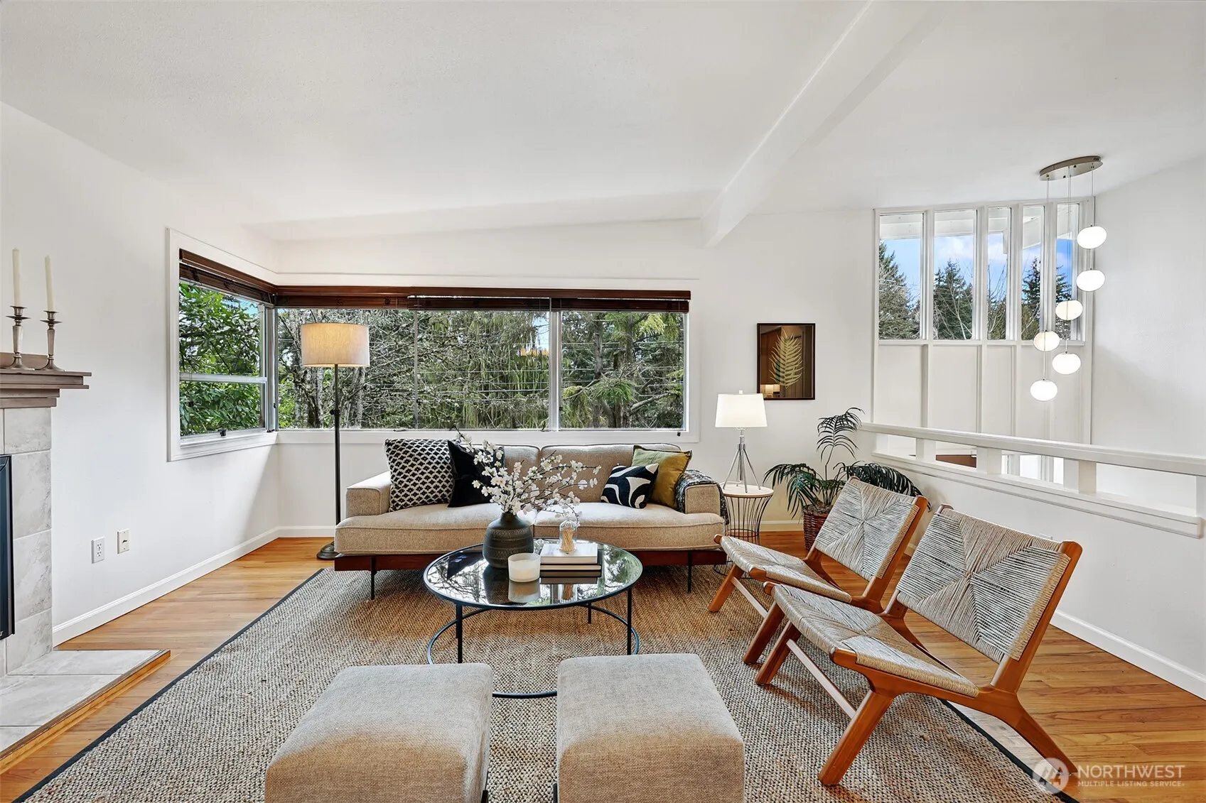 Timeless 1957 Mid-Century Modern in coveted Bellevue with award-winning schools and effortless commuter access. This 3-bed, 2.5-bath home offers 1,810 sq ft of light-filled living on a generous 9,600 sq ft lot. Vaulted ceilings, skylights and expansive windows create an airy, open feel, while gleaming hardwood floors and two gas fireplaces add warmth and character. The beautifully updated kitchen features brand new custom quartz counters and flows seamlessly to a large deck overlooking the fully fenced backyard—perfect for play, pets or entertaining. All three bedrooms—including the primary suite—and 2 baths are thoughtfully located on the main floor. Downstairs, the fully finished daylight level expands the living space with a generous family/media room, ¾ bath and direct garage access. Pre-plumbed for a future kitchenette, it offers flexibility for guests or multi-generational living while remaining connected to the home. Brand new roof, fresh paint, updated electrical panel and established landscaping provide peace of mind. Large 2-car garage plus ample driveway parking. Minutes to parks, shopping, Lake Sammamish, I-90 and 405. Classic design, modern updates, unbeatable location.